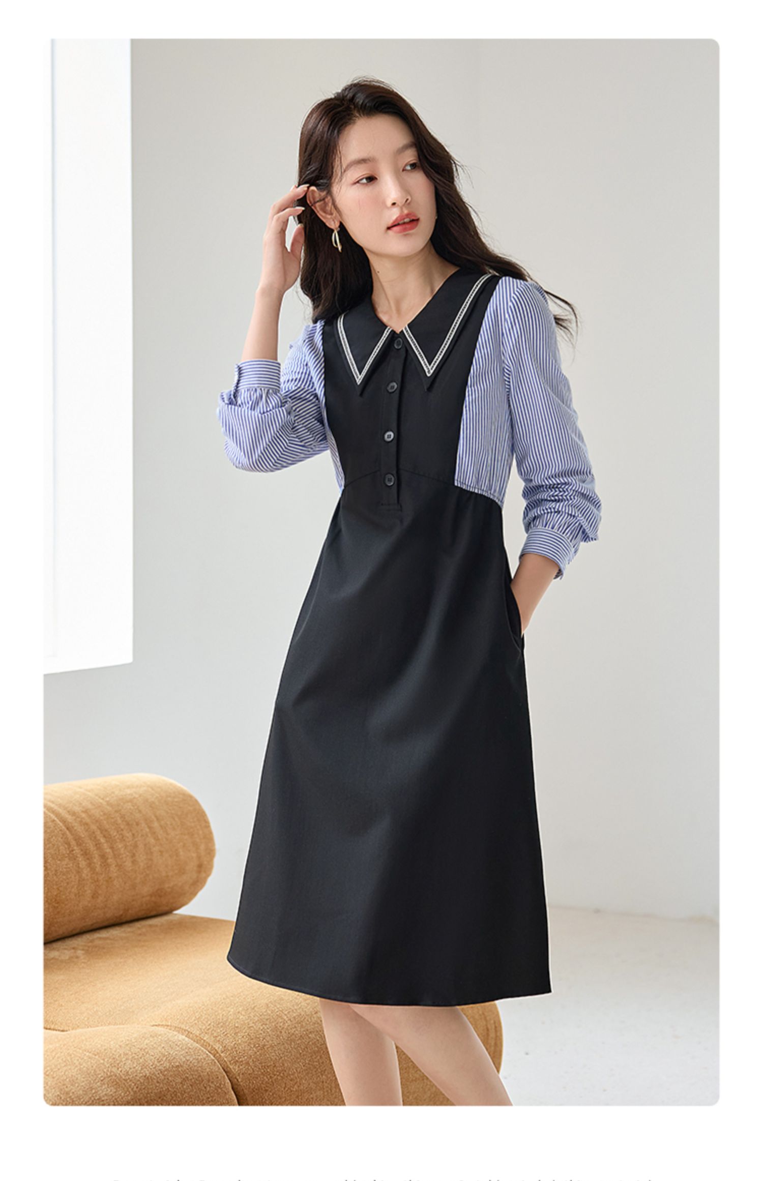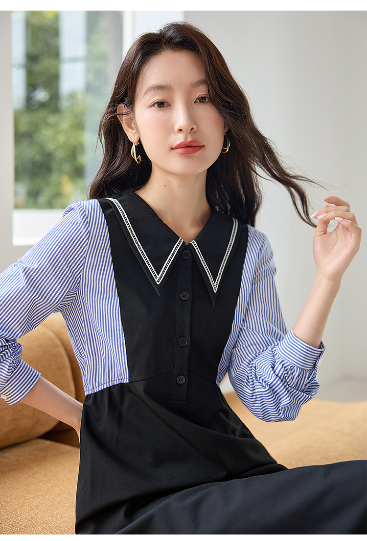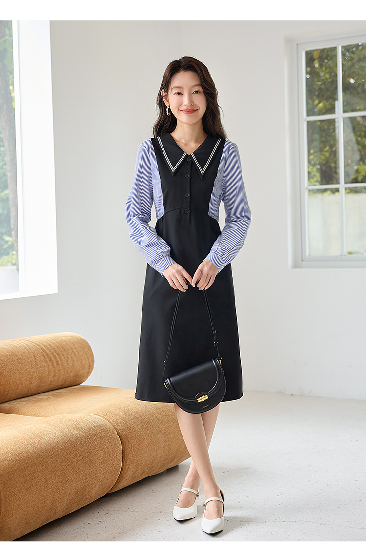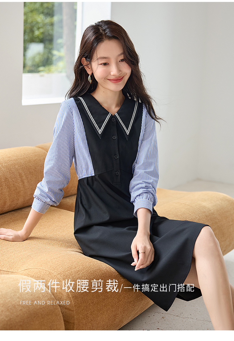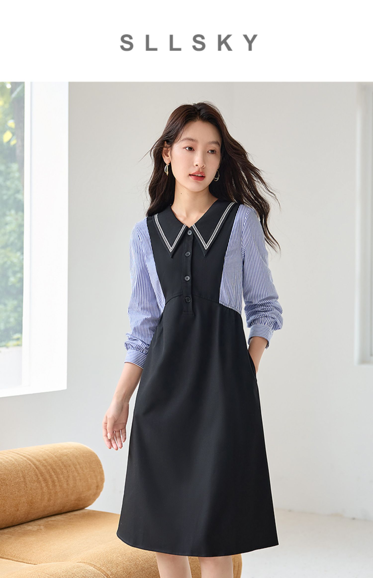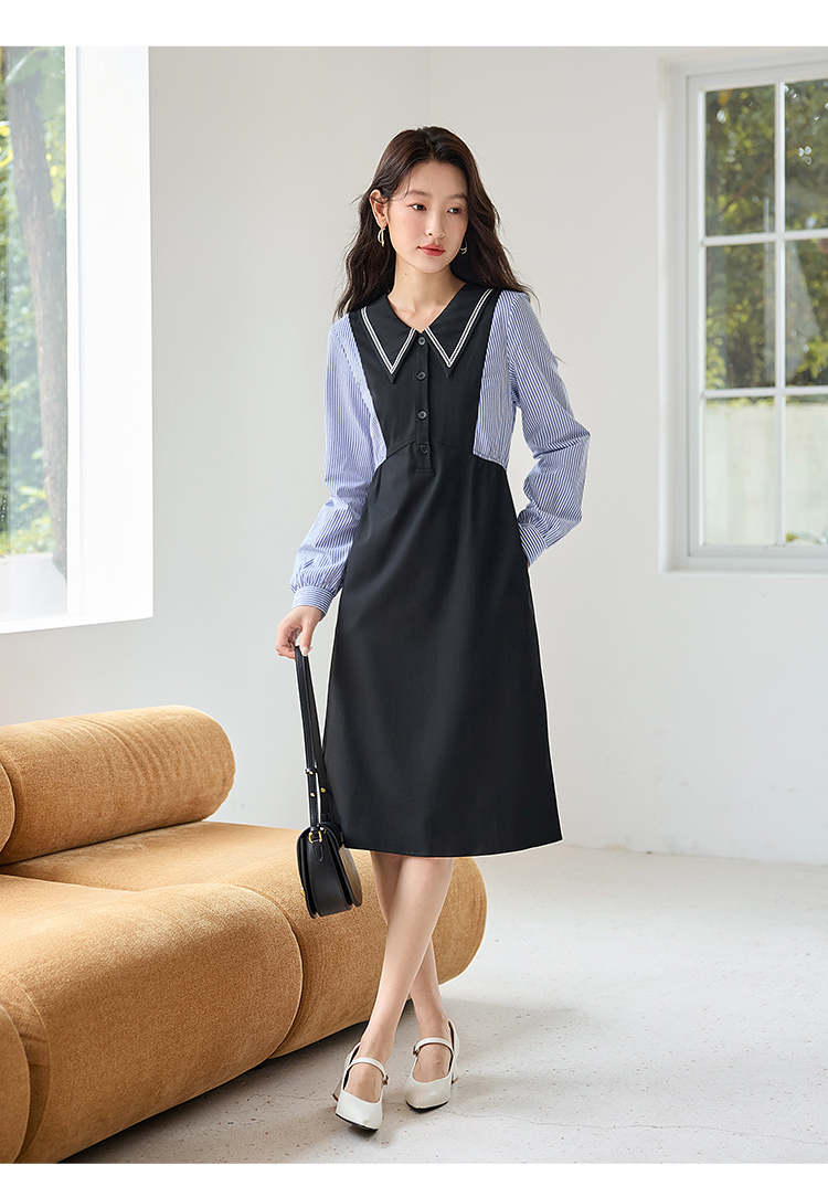 【年终特卖】熙世界设计感法式条纹长袖拼接翻领假两件连衣裙女2025秋季新款