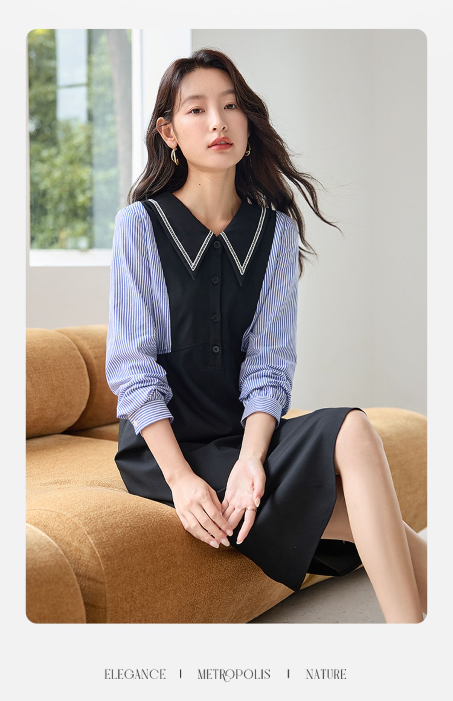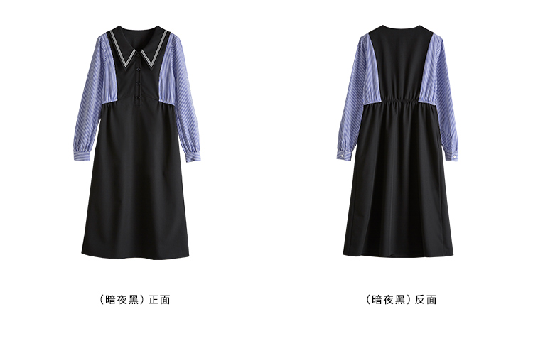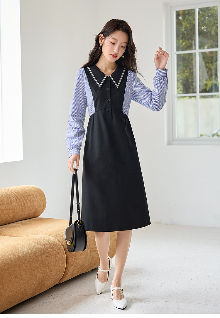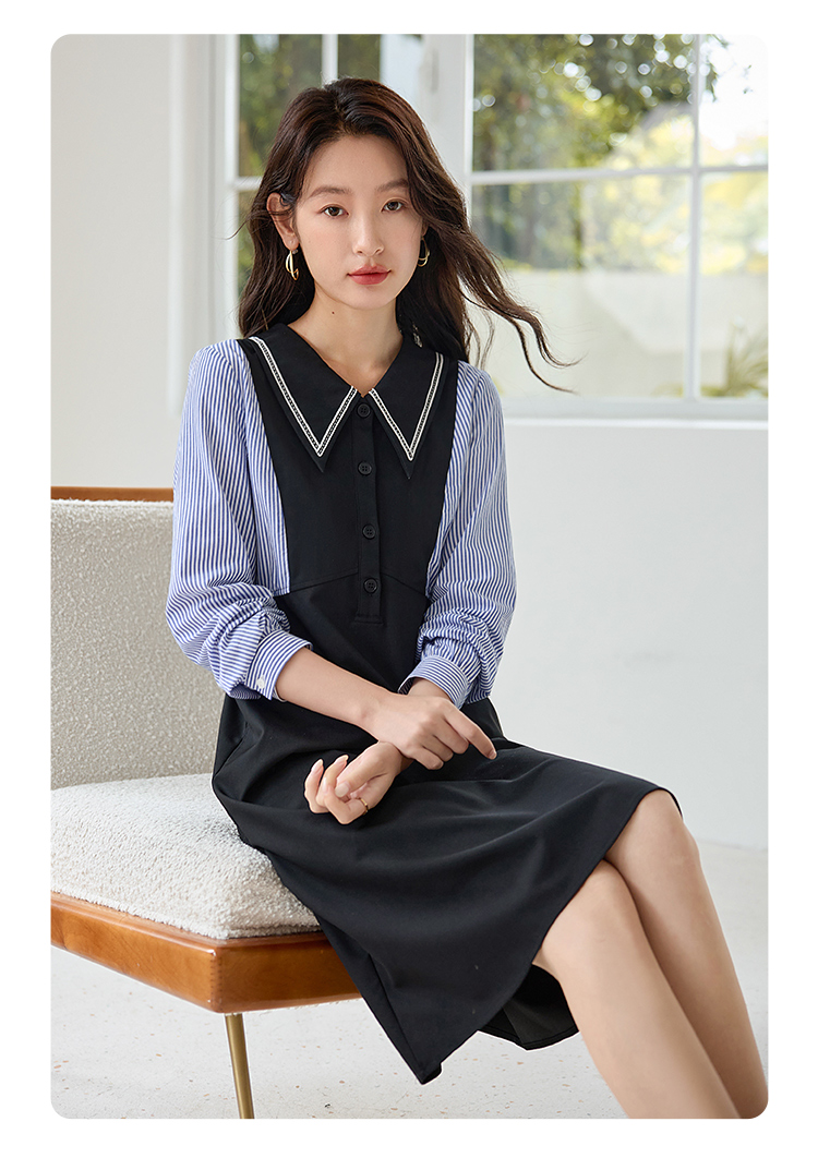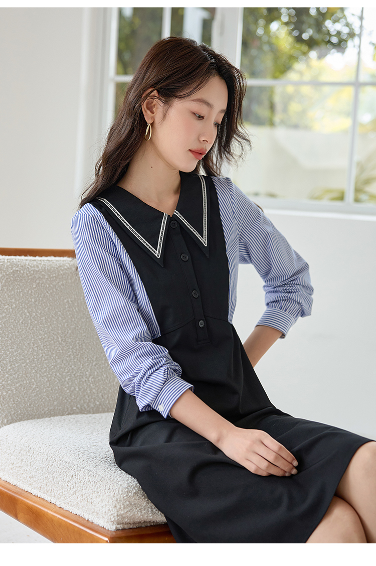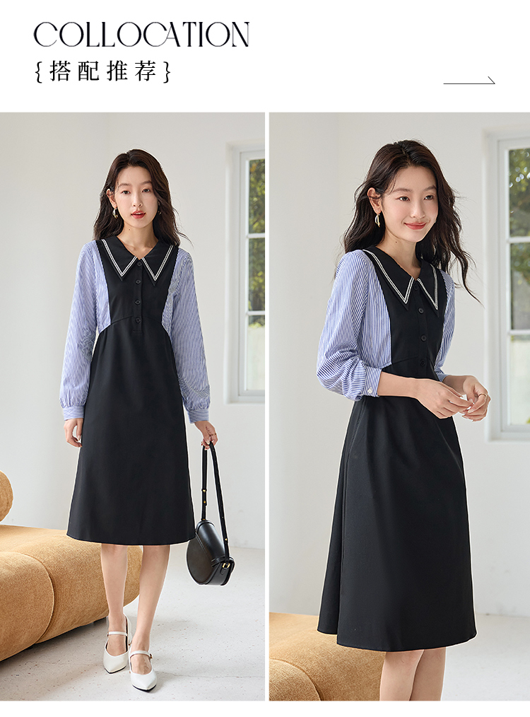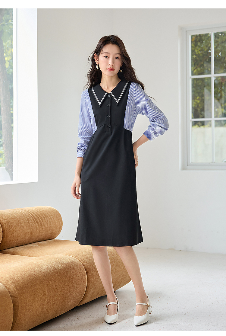 【年终特卖】熙世界设计感法式条纹长袖拼接翻领假两件连衣裙女2025秋季新款
