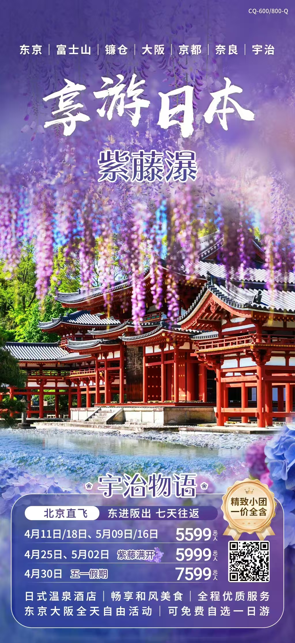 【平等院赏紫藤花】(停留约 30 分钟)平安时代池泉舟游式的寺院园林,于1994 年被列入为世界文 化遗产。平等院主建筑被建造在池中的岛上,仿若一座极乐净土般的宫殿,从正面望去形似展翅欲飞 的大鹏,又因其屋顶两端矗立着一对金光闪闪的凤凰,故被命名为“凤凰堂”。每年春末夏初,盛大 绚烂的紫藤瀑布拥簇在凤凰堂周围,景色宛如浮世绘般的画卷,是关西地区观赏紫藤花的名所。宇治 平等院还是《源氏物语》故事发生地之一,漫步其中,感受平安时代的浪漫和日本独有的物哀美学【表参道抹茶街】(停留约 30 分钟)既然来到宇治,那么就不能不品尝跟抹茶相关的食物。表参道店 家林立,有许多百年老铺,其中最受大家欢迎的是伊藤久右卫门及中村藤吉本店,不仅可以在茶室品 尝到许多抹茶料理,也有很多知名的伴手礼可以买回家。这里可是抹茶控的圣地哟【日式天妇罗定食】天妇罗是用面粉、鸡蛋与水调和成面浆,将新鲜的食材裹上面浆放入油锅炸至金 黄,再蘸上酱油和萝卜泥调成的酱料,一口酥脆,回味鲜美,香而不腻【奈良公园】(停留 30 分钟)囊括了由天平时代延续下来的东大寺、兴福寺以及正仓院等名胜古迹,是一座规模雄伟、绿树成荫的历史公园。公园内有三五成群的鹿群,它们被看成是神的使者而受到人 们的悉心照顾。在这里,您可以与小鹿们亲密接触,感受人与自然和谐共存的美好。 【春日大社}(停留约30)分钟768 年为了守护平城京及祈祷国家繁荣而建造。围绕本殿的朱红色的 回廊与春日山麓的绿色丛林相映成辉,与屋檐下垂下的灯笼和社殿一起构成了一幅情趣盎然的风景画。