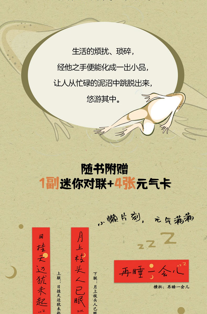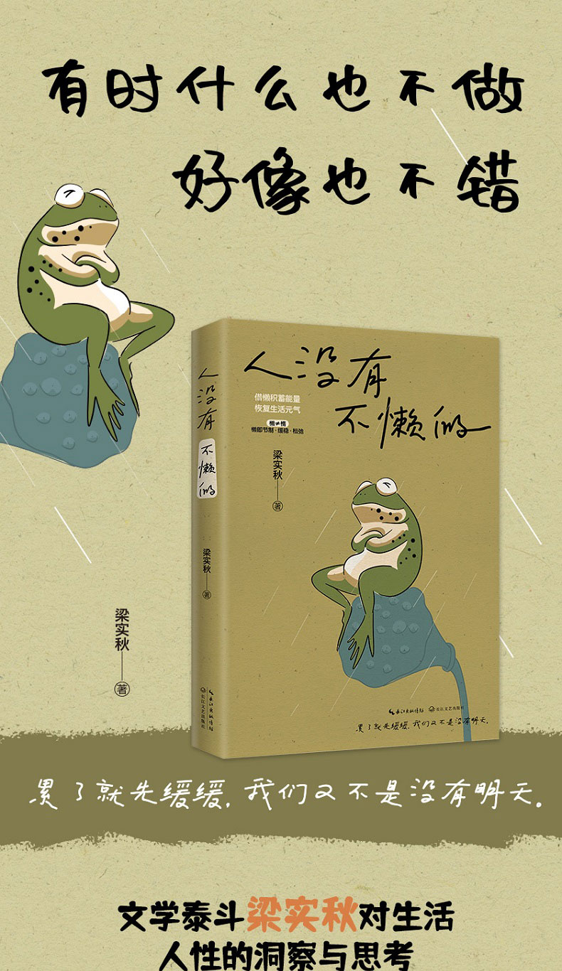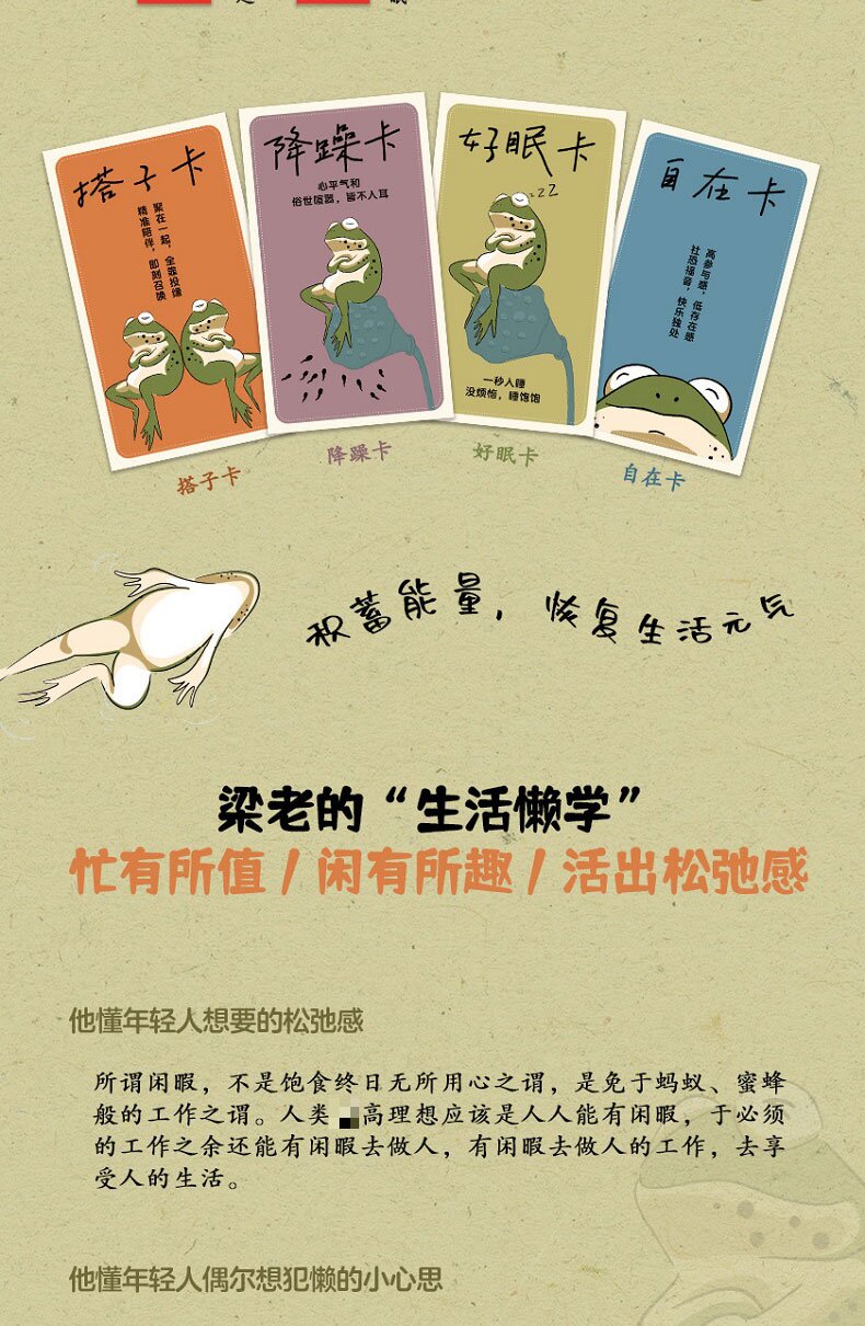 ★ 如果厌倦了匆忙奔跑,就停下来感受生活! ★ 随书附赠迷你对联贴纸与4张元气卡,带你小懒片刻,元气满满! 上联:日挂天边犹未起; 下联:月上枝头人已眠; 横批:再睡一会儿。 元气卡:好眠卡、降躁卡、搭子卡、自在卡 ★ 解开生活繁绕的绳索,寻觅人生乐趣 在梁实秋的笔下,生活从来都不是匆忙的步调,而是在琐碎的日子里,仍不失生活的闲趣和慢滋味。疲时知休,郁时知通,燥时知止。 而今,在日复一日的奔忙劳累下,人们越来越追求一种松弛、不紧绷的“懒式”生活状态。这样的懒,不是没追求,而是一种更加自在的人生。是一种“拾闲”的乐趣,也是面对生活的一种休憩与从容。借助偶尔的“懒一懒”,我们可以消除生活的疲惫,重新寻觅生活的价值;同时也可以抛开繁琐,在劳碌奔波之外蓄能充电,准备下一次更好地出发。 ★ 散文经典大家,作品热销多年,值得一读再读的佳作 55篇梁实秋趣味生活散文,慵懒又逗趣,带你狠狠解乏,恢复生活元气!生活不该只是闷头往前冲,偶尔也需要清醒的停留。 ★ 梁实秋“快乐生活”系列第二本,延续趣味风格,好玩有趣! 系列第一本《快乐就是哈哈哈哈哈》主打探寻快乐人生,同时采用了趣味化的动物形象来传递内容主题,使其更具年轻气质。系列第二本《人没有不懒的》延续这一风格,借雨中坐在莲蓬上悠然自得的青蛙来喻指一种自在、松弛的人生状态。