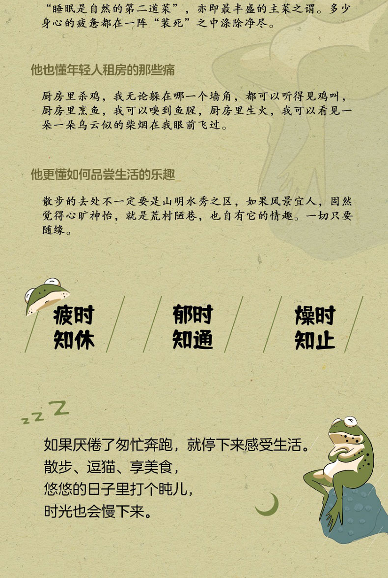 如果厌倦了匆忙奔跑,就停下来感受生活。梁实秋先生曾在《懒》一文中直言“人没有不懒的”,但在紧绷的生活状态下,我们却偶尔需要这种“懒一懒”的松弛感,借懒积蓄能量,恢复生活元气。让生活慢下来、简单点儿,从中积攒继续前行的力量,更好地出发。