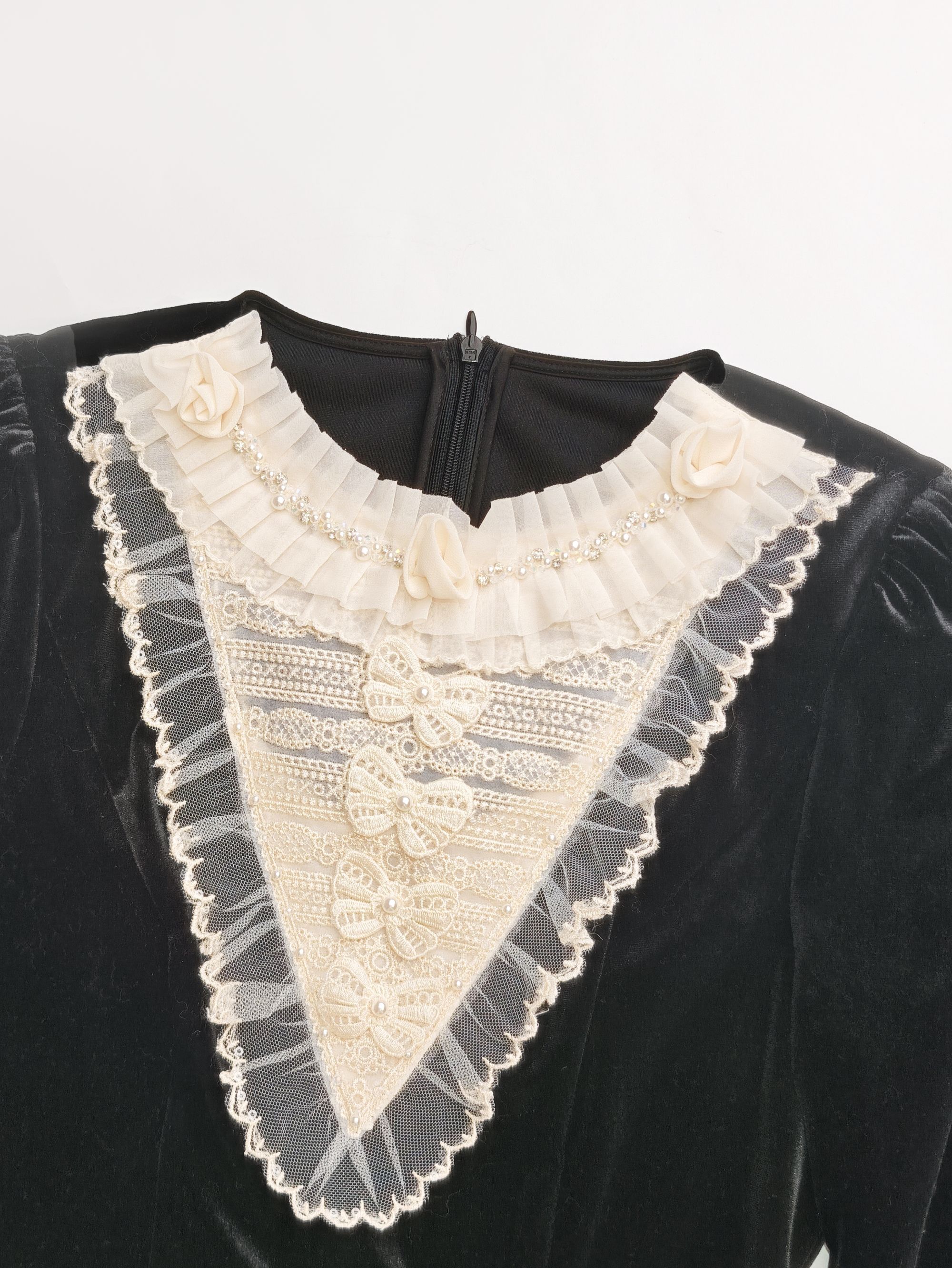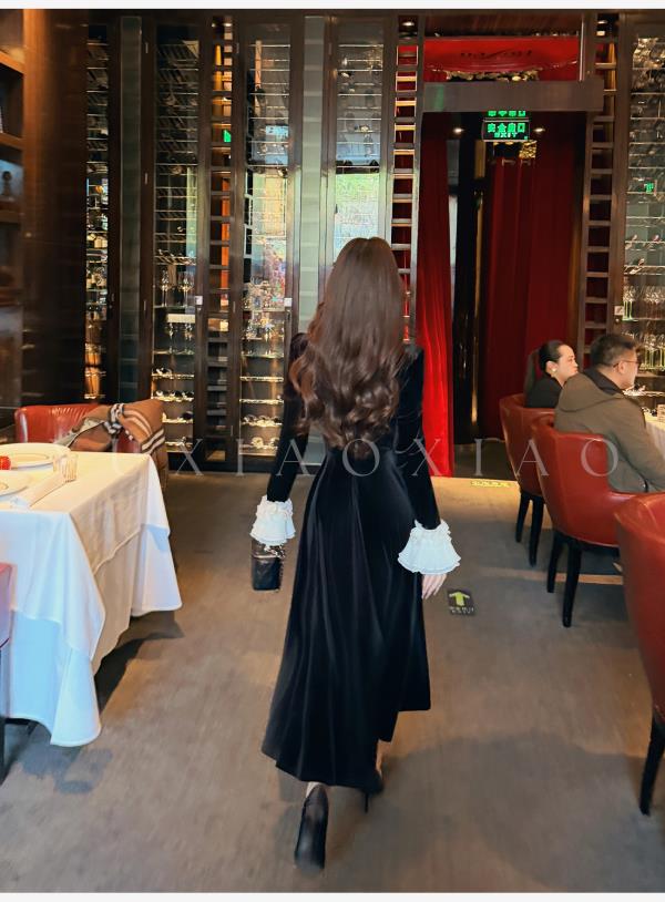 余潇潇【优雅舞步】法式复古蕾丝花边拼接高级感丝绒喇叭袖连衣裙