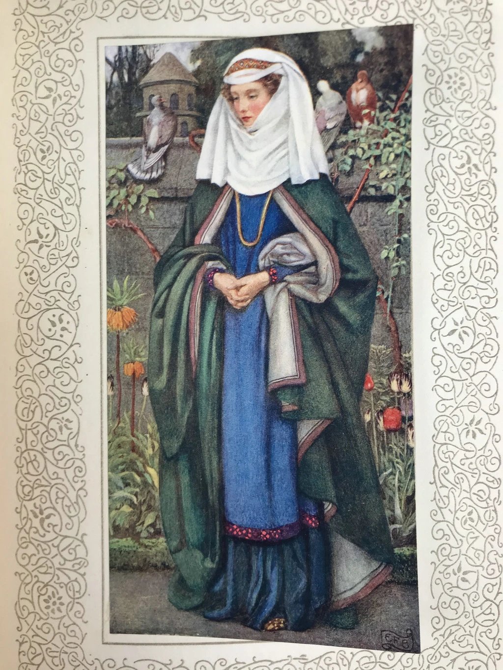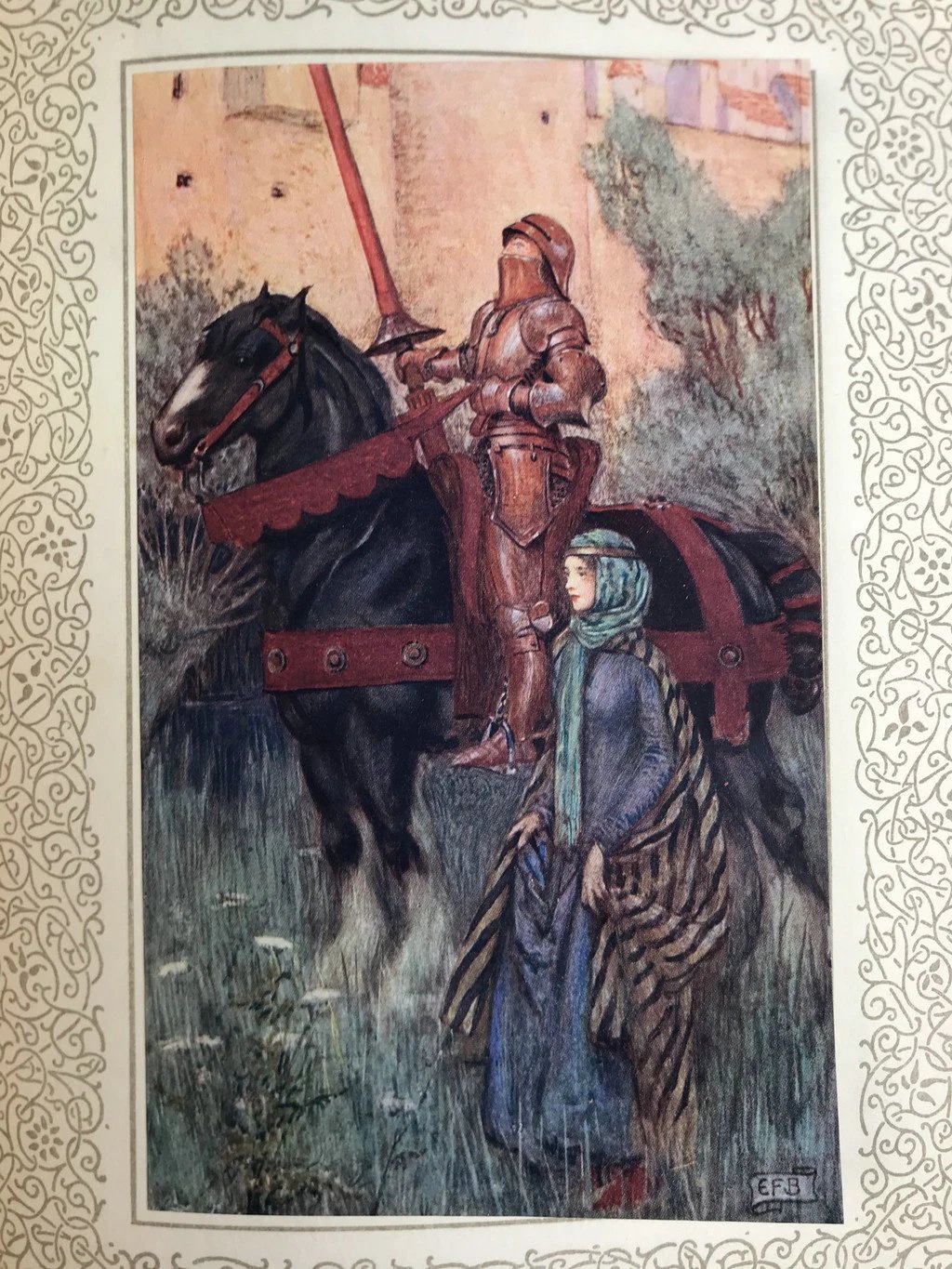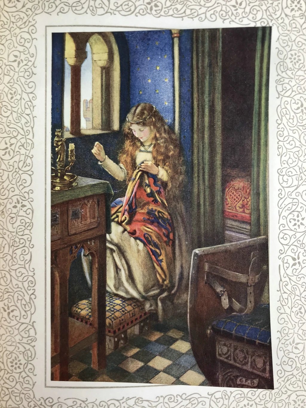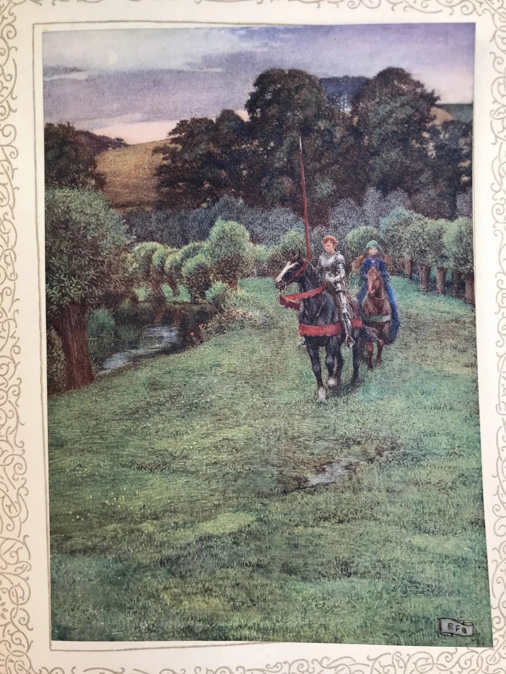 插画家Eleanor Fortescue‑Brickdale(埃莉诺·福特斯库‑布里克戴尔)被认为是“晚期前拉斐尔派(Pre‑Raphaelite)”代表之一,是英国著名女性画家与插画家,活跃于19世纪末至20世纪前半叶。她接受过正式的艺术训练,擅长油画、水彩以及版画。她经常旅行至欧洲大陆,尤其是意大利,从文艺复兴早期艺术中汲取灵感,这种影响在她作品中尤为明显:她的画作具有精细的线条、柔和的色彩及古典的构图感。1909 年,莱斯特画廊委托她绘制 28 幅水彩插画,用于丁尼生的 Idylls of the King。这些作品用时两年完成,后来原作于1911 年在画廊展出,1912 年左右出版了豪华版礼品书。她为《国王叙事诗》绘制的插画非常有古典美,人物姿态优雅,眉眼神态、发饰和服装纹理都极其精致,光线和阴影处理精妙,画面具有立体感与空间感,同时不失浪漫与梦幻感。