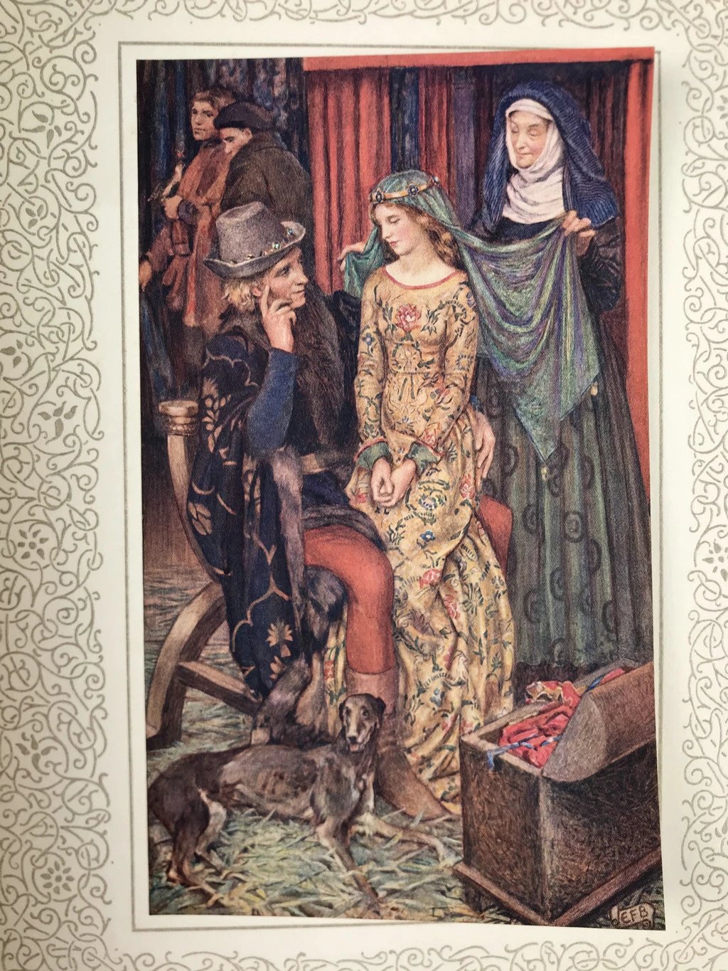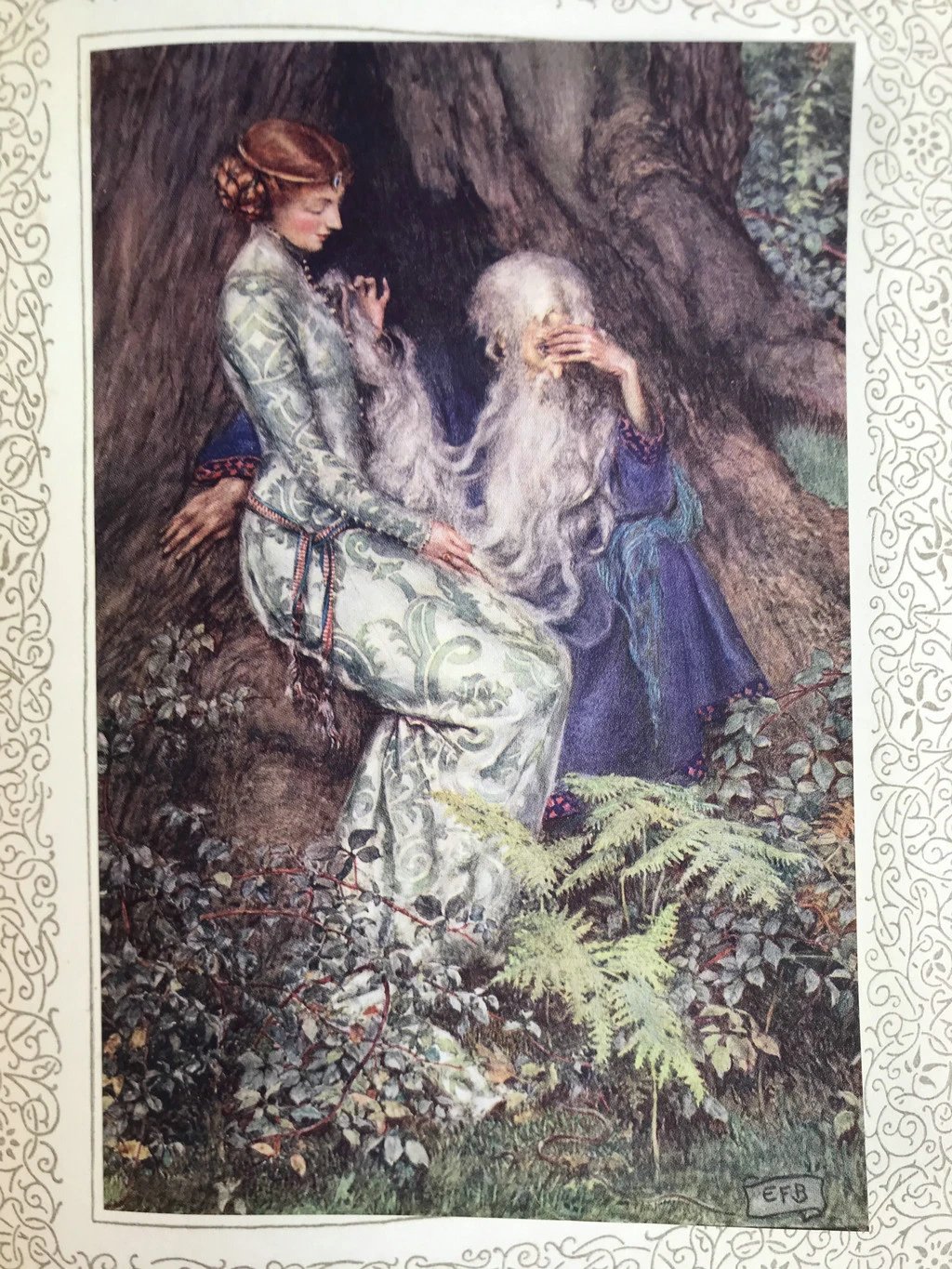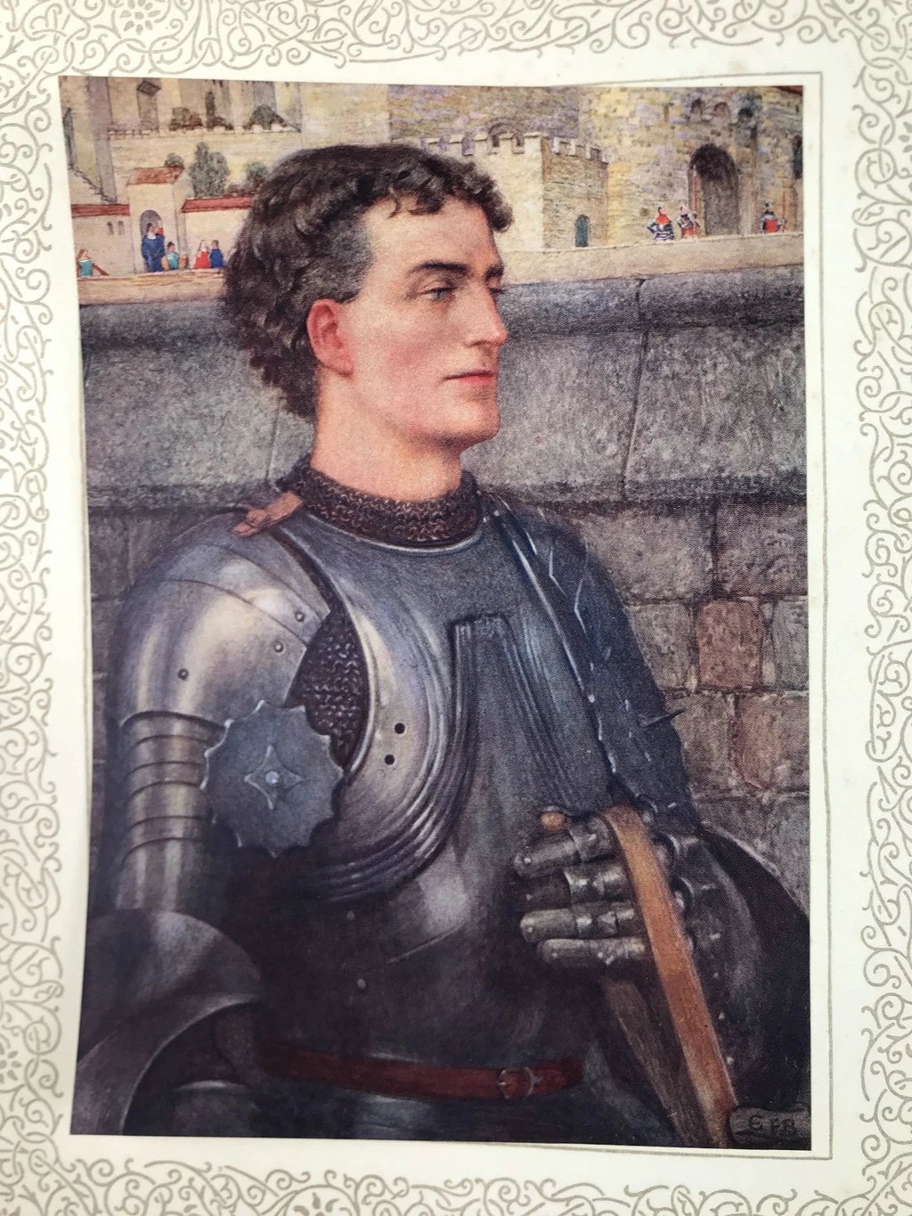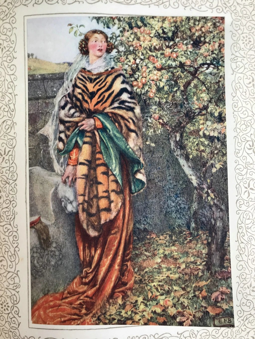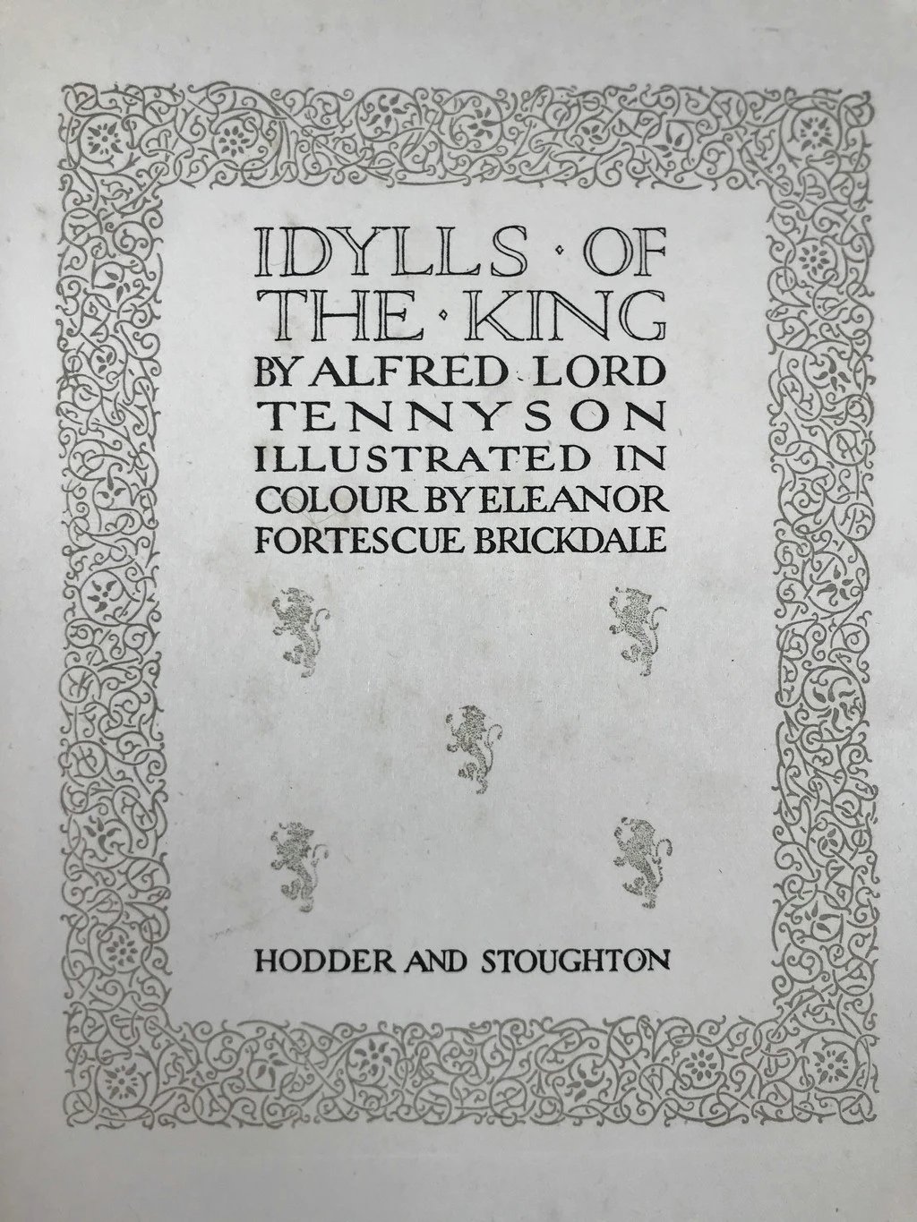 插画家Eleanor Fortescue‑Brickdale(埃莉诺·福特斯库‑布里克戴尔)被认为是“晚期前拉斐尔派(Pre‑Raphaelite)”代表之一,是英国著名女性画家与插画家,活跃于19世纪末至20世纪前半叶。她接受过正式的艺术训练,擅长油画、水彩以及版画。她经常旅行至欧洲大陆,尤其是意大利,从文艺复兴早期艺术中汲取灵感,这种影响在她作品中尤为明显:她的画作具有精细的线条、柔和的色彩及古典的构图感。1909 年,莱斯特画廊委托她绘制 28 幅水彩插画,用于丁尼生的 Idylls of the King。这些作品用时两年完成,后来原作于1911 年在画廊展出,1912 年左右出版了豪华版礼品书。她为《国王叙事诗》绘制的插画非常有古典美,人物姿态优雅,眉眼神态、发饰和服装纹理都极其精致,光线和阴影处理精妙,画面具有立体感与空间感,同时不失浪漫与梦幻感。