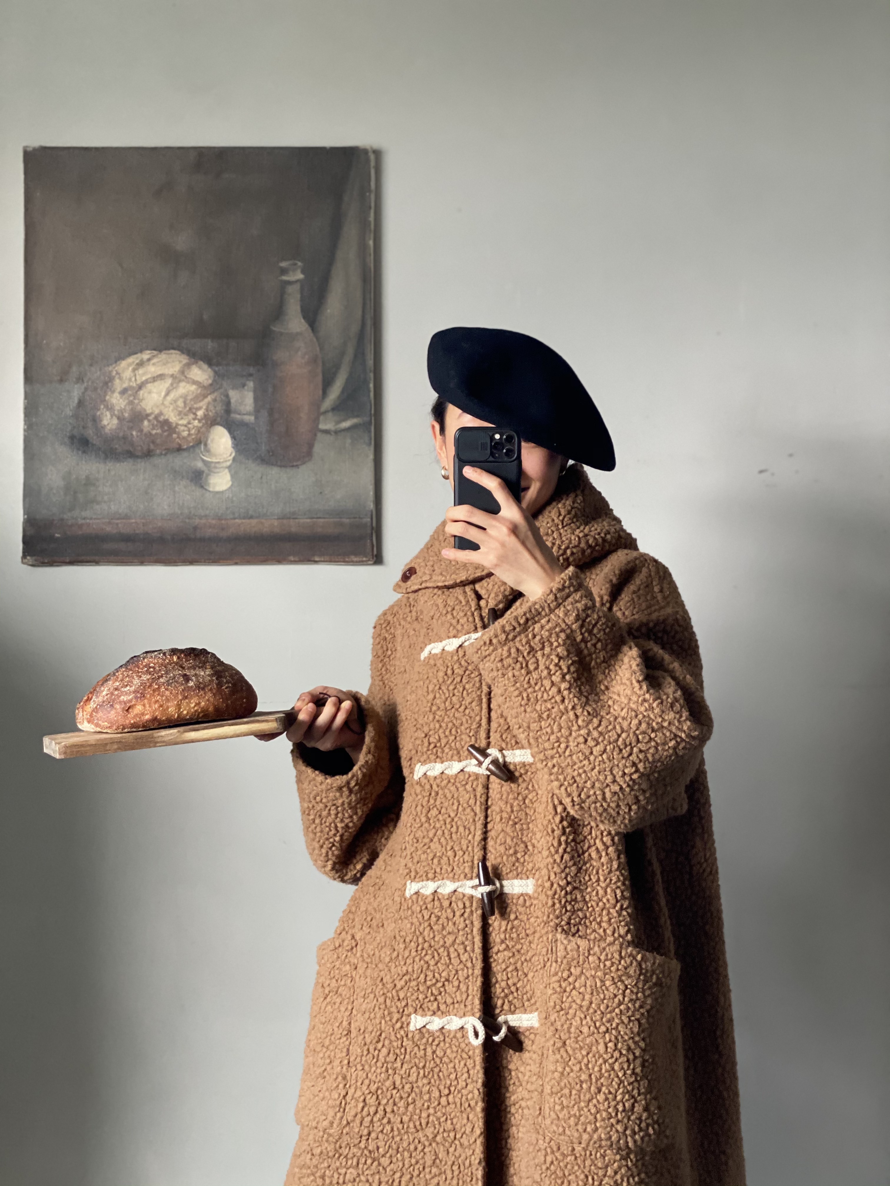 焦糖棕羊羔毛牛角扣大衣