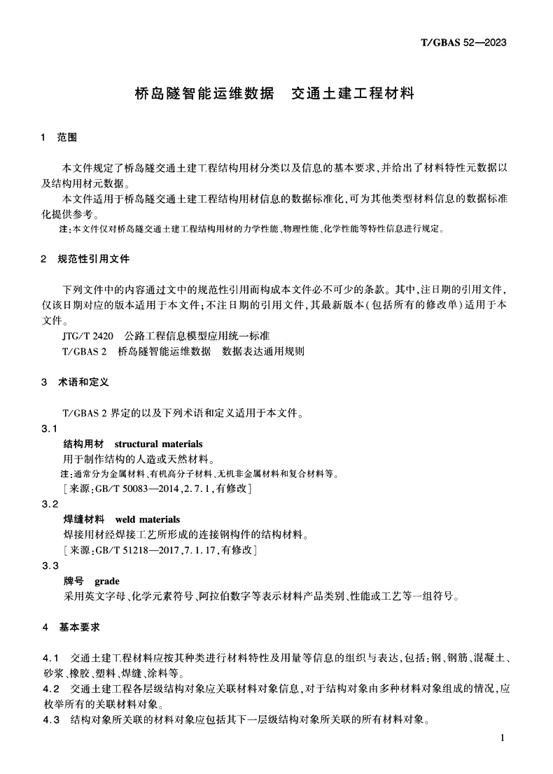 书名:桥岛隧智能运维数据 交通土建工程材料T/GBAS 52—2023