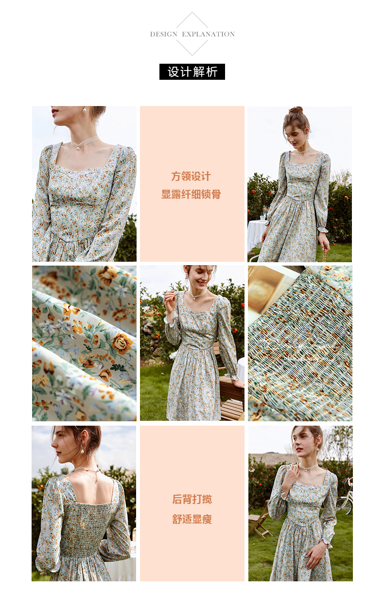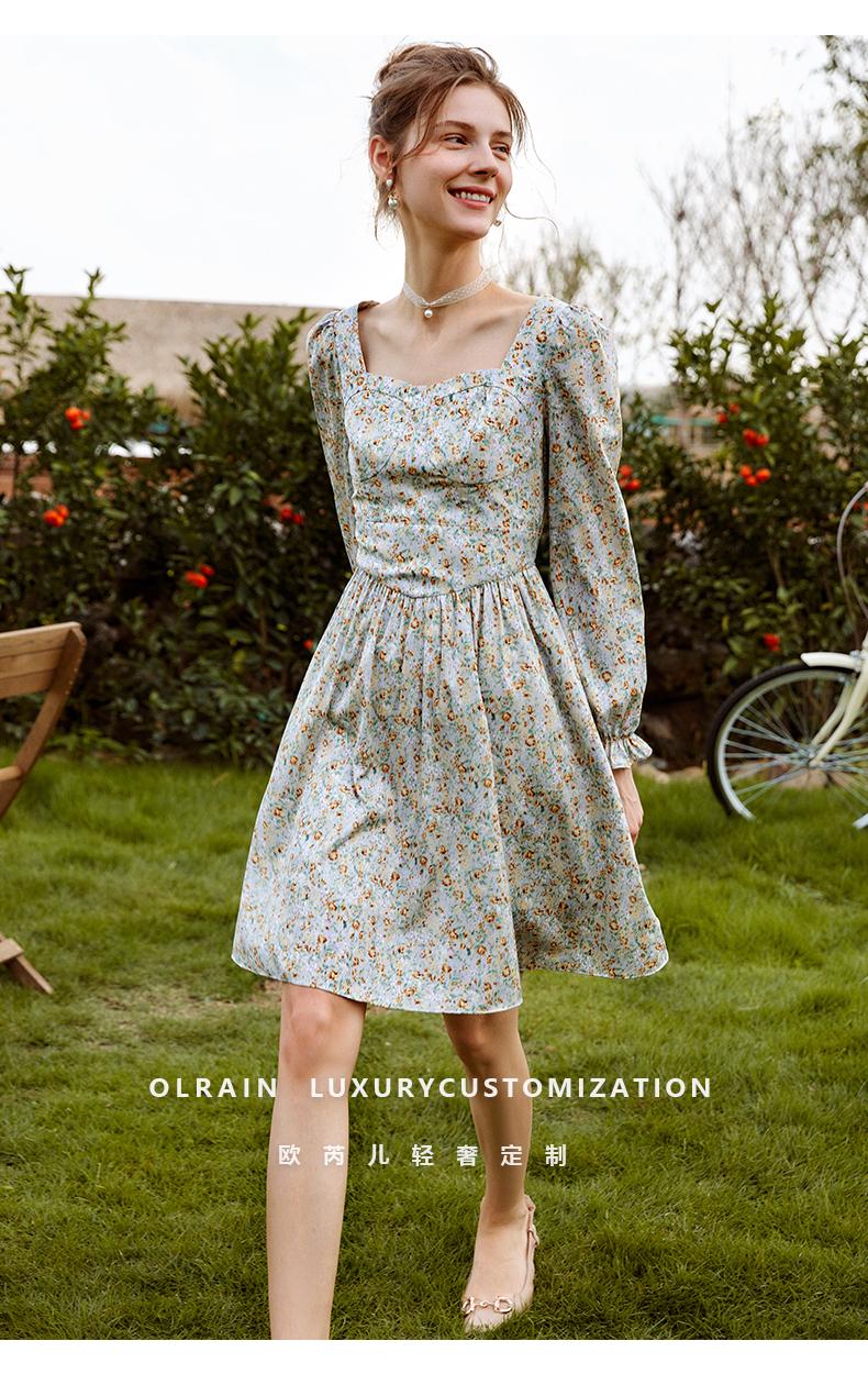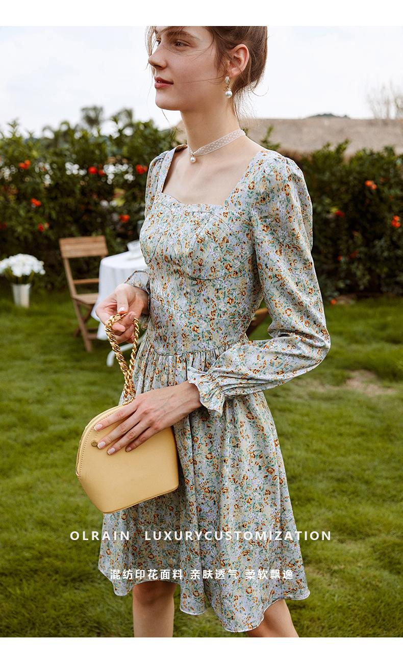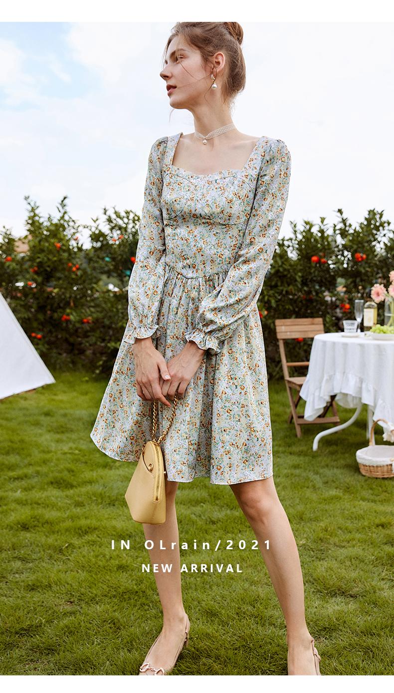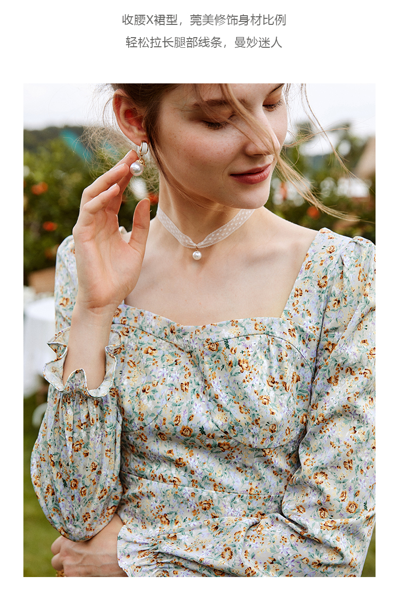 欧芮儿碎花连衣裙女2021新款收腰显瘦一字肩方领设计感中长裙