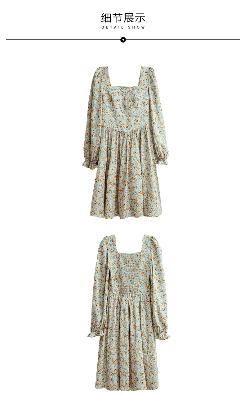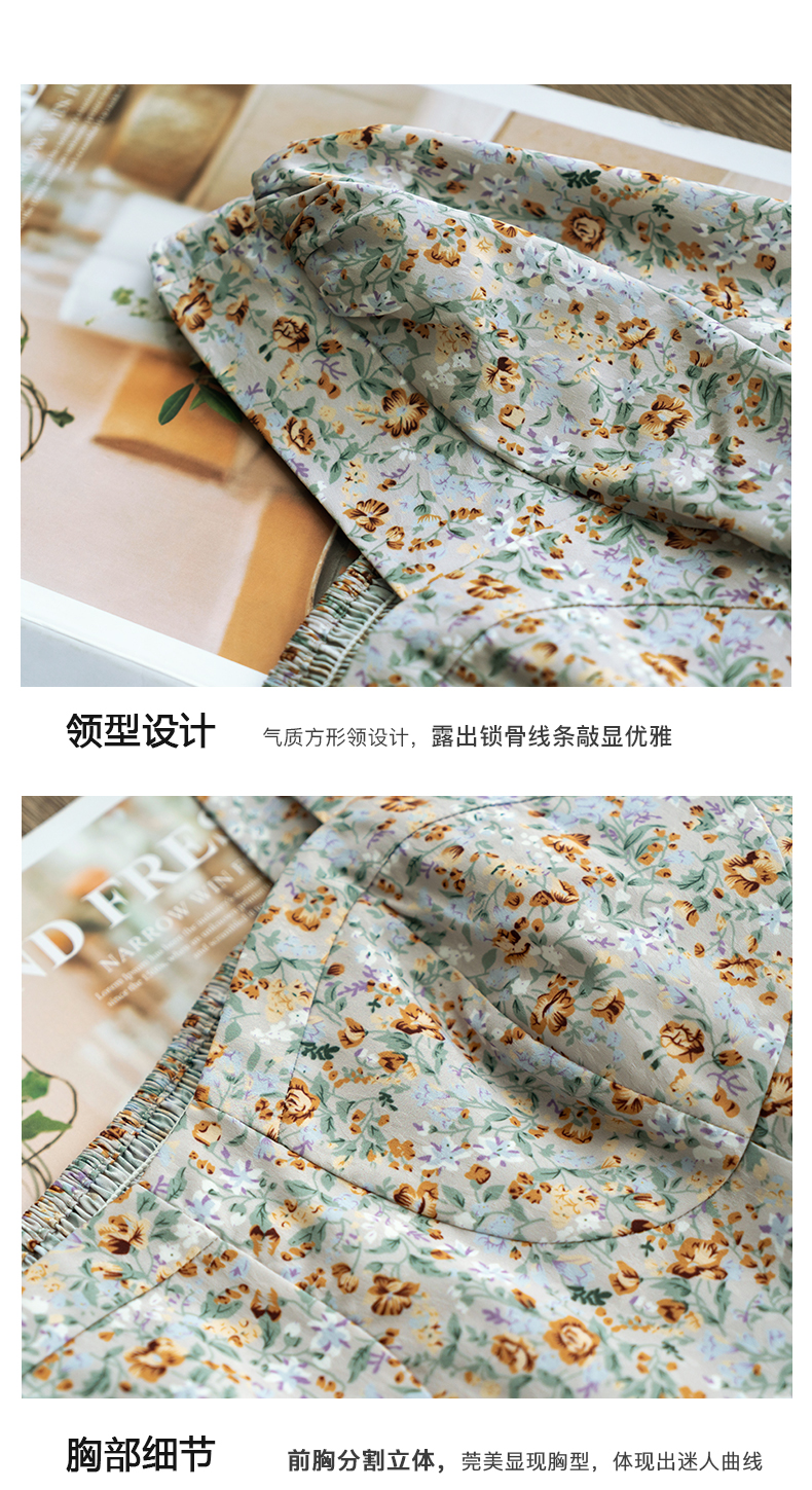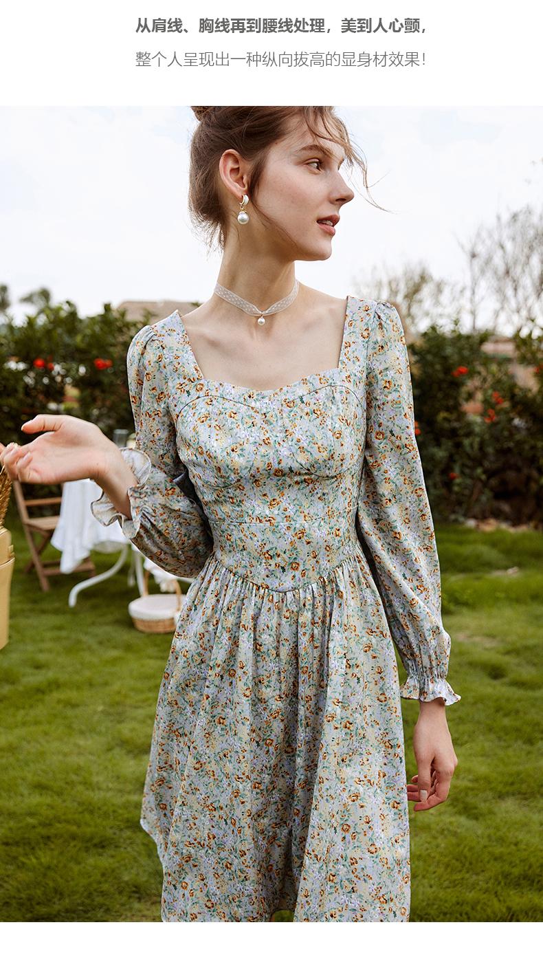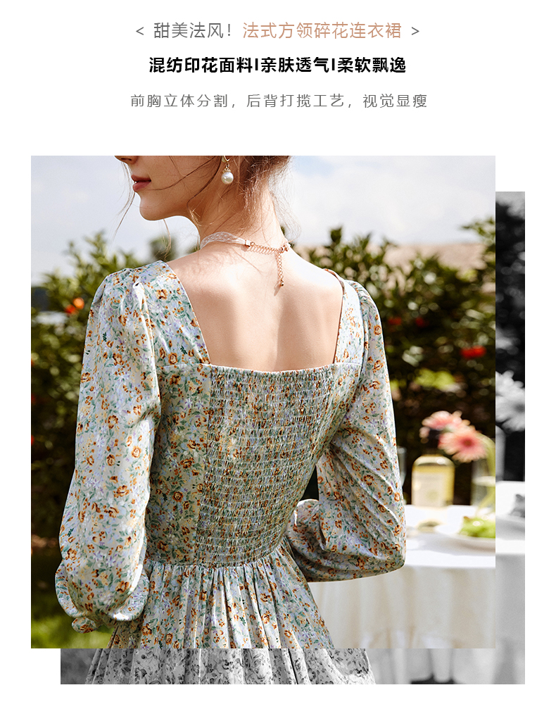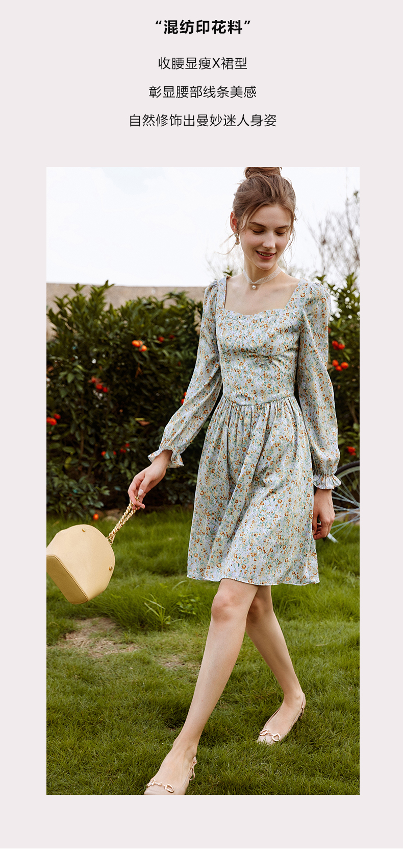 欧芮儿碎花连衣裙女2021新款收腰显瘦一字肩方领设计感中长裙