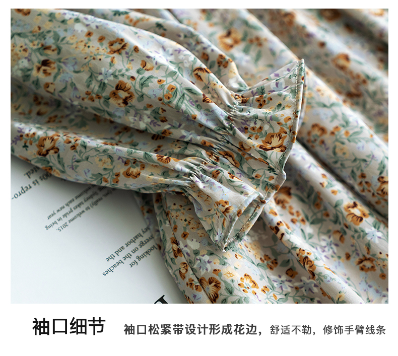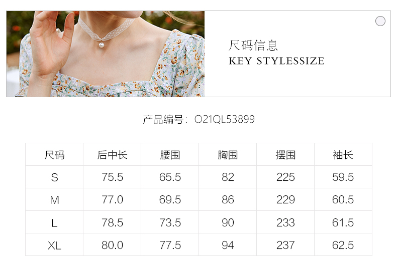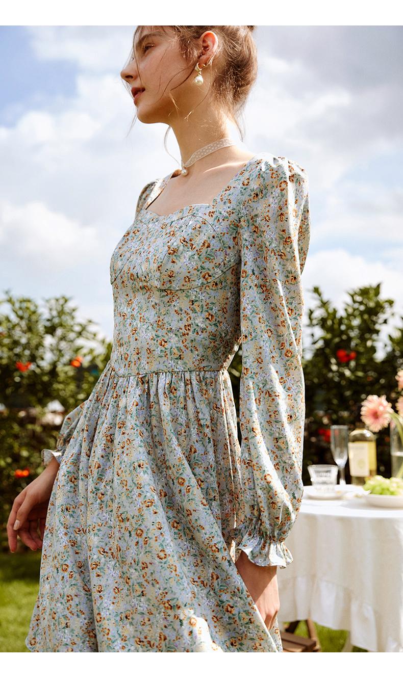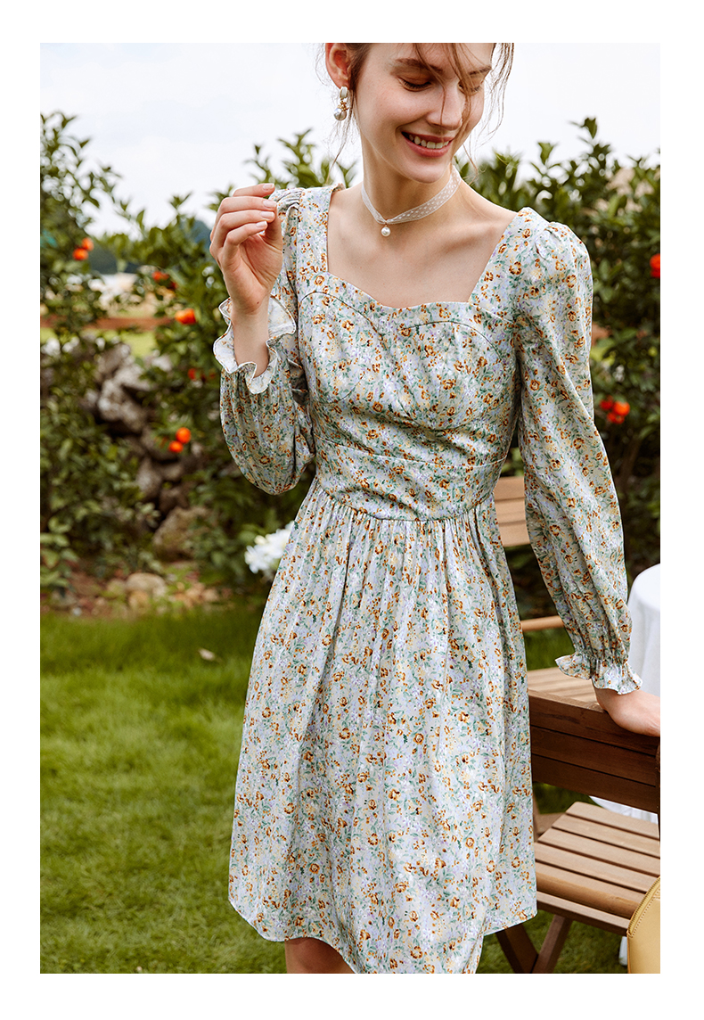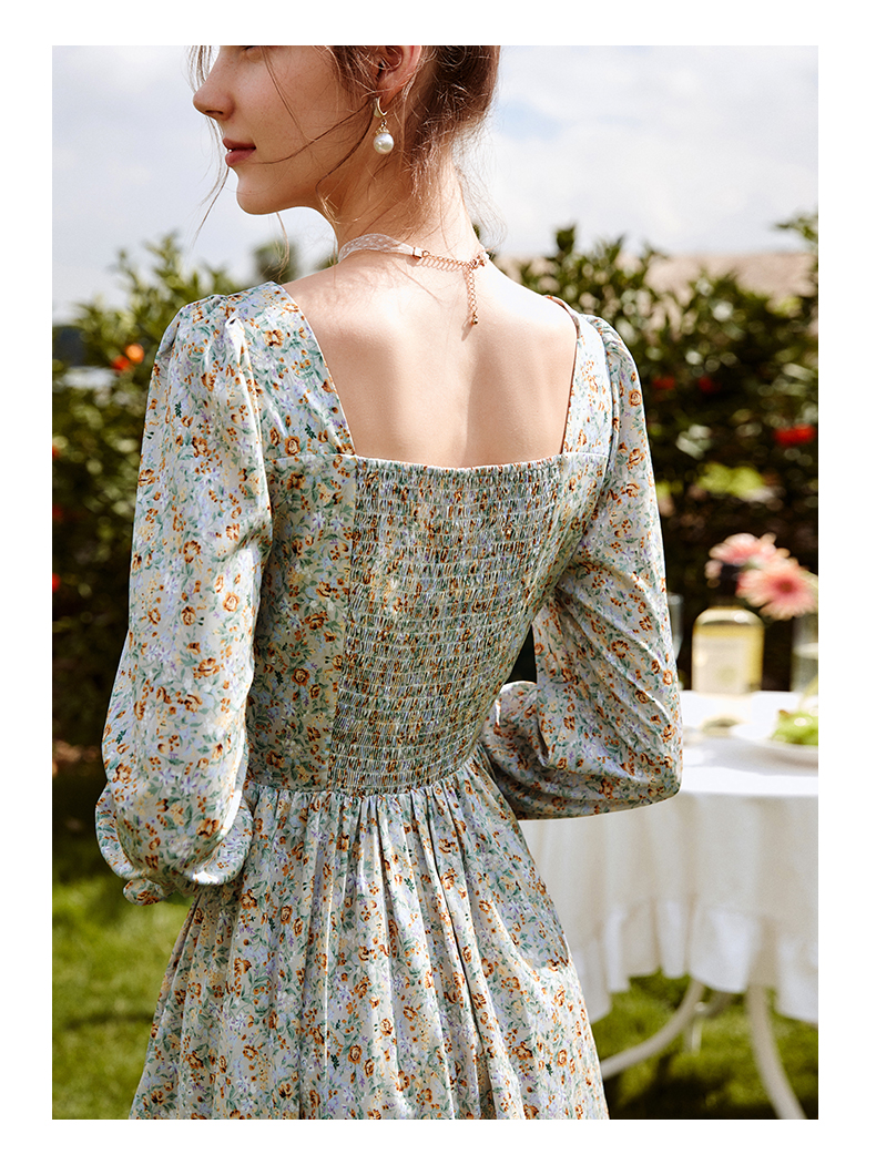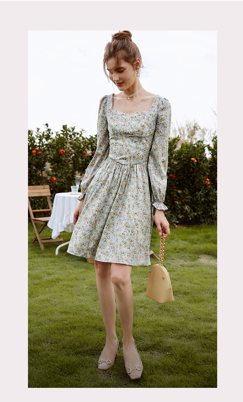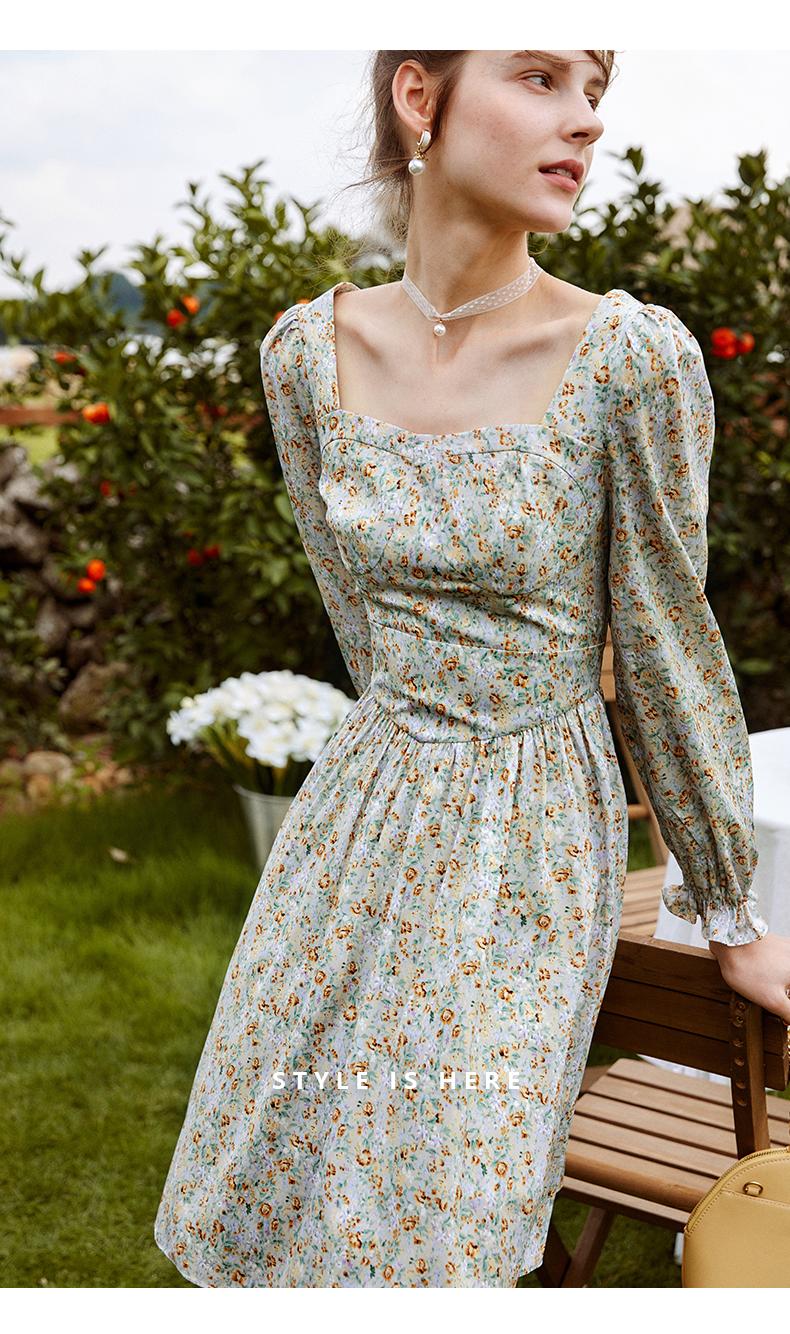 欧芮儿碎花连衣裙女2021新款收腰显瘦一字肩方领设计感中长裙