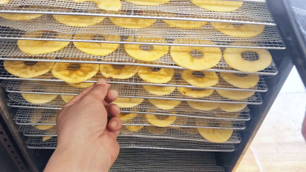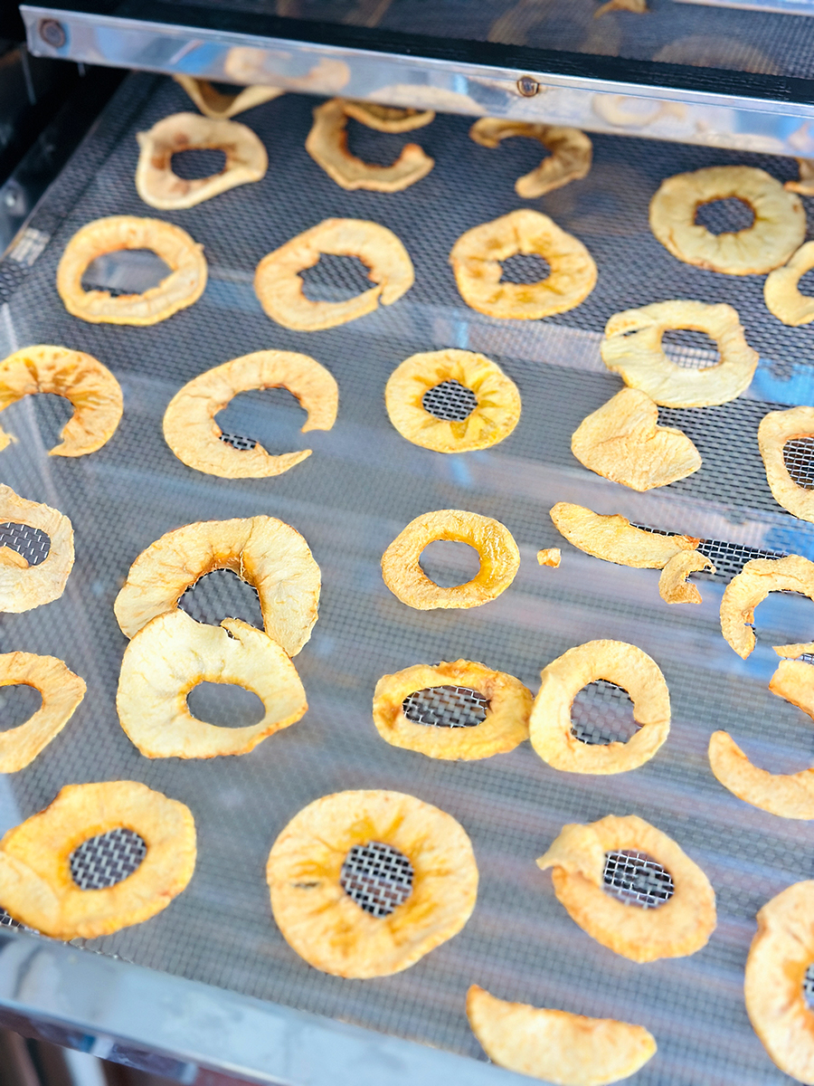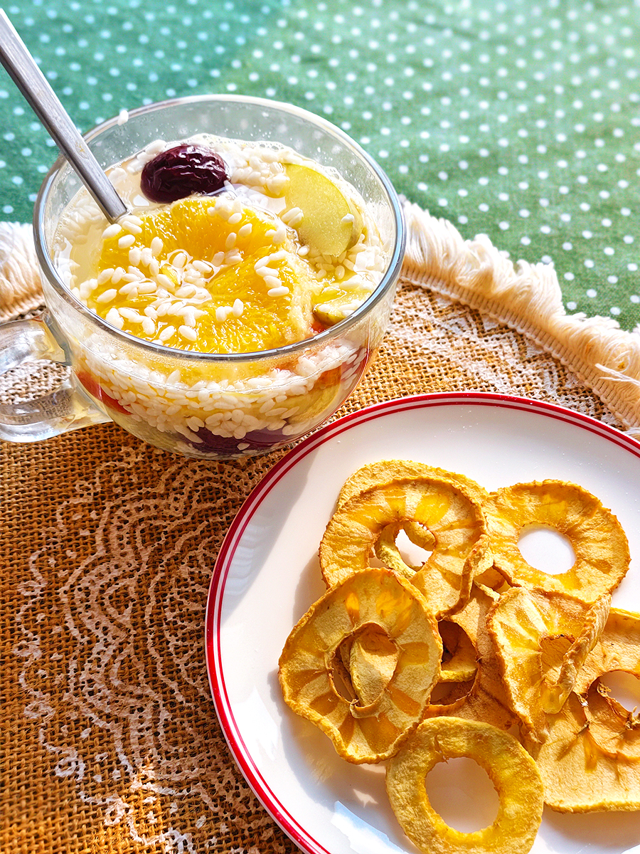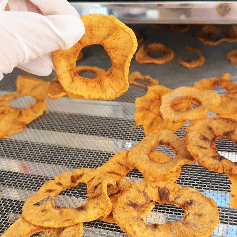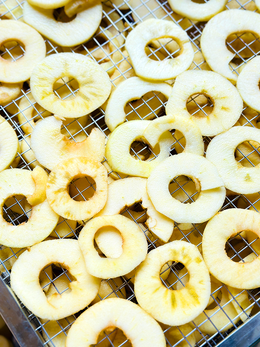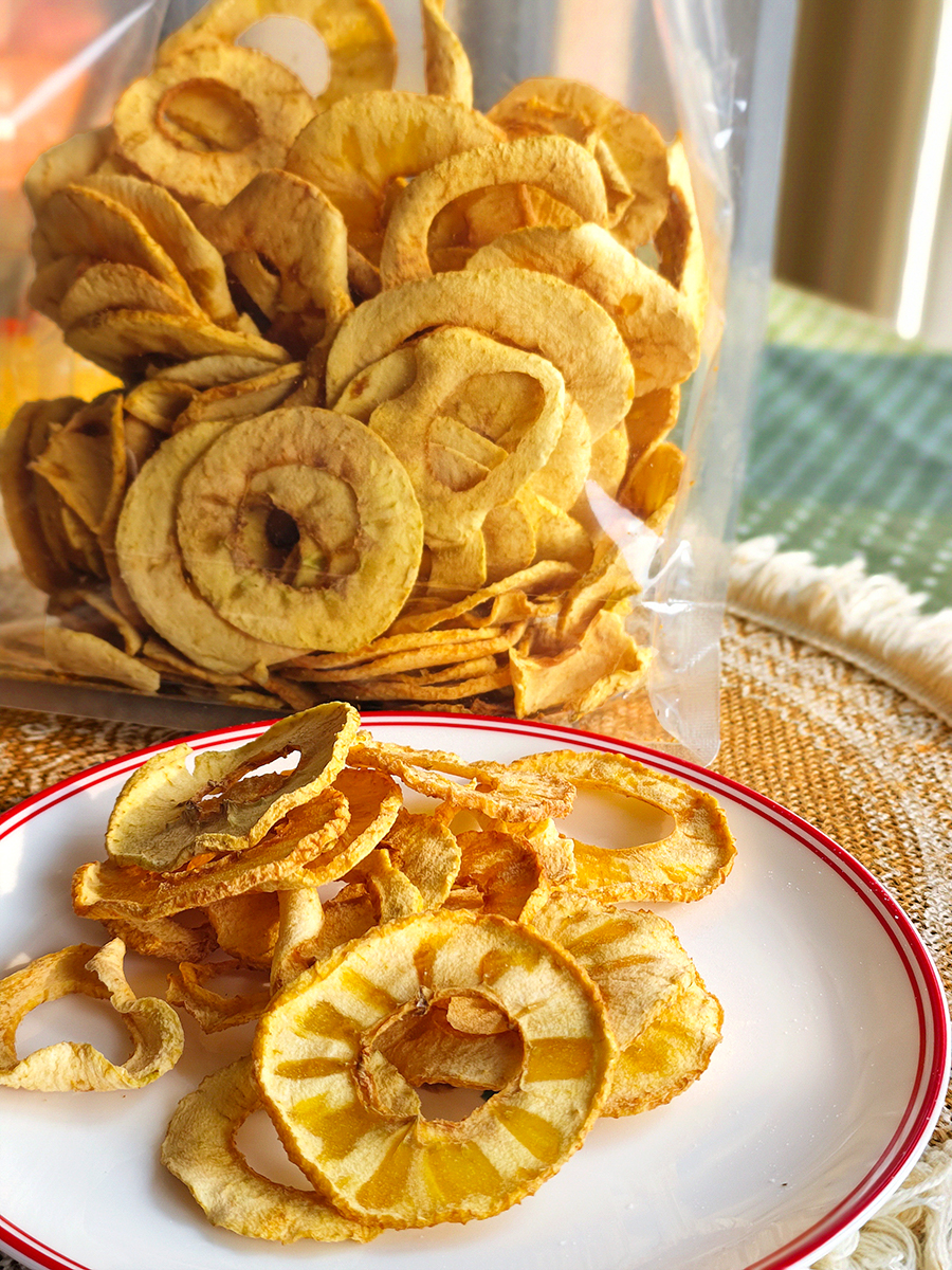 切成圆盘或圆环状的苹果片,均匀平铺在洁净的烤网上,利于通风,并每隔一两个小时翻动一次。过程不添加多余的成分,保持原汁原味、原色原香。