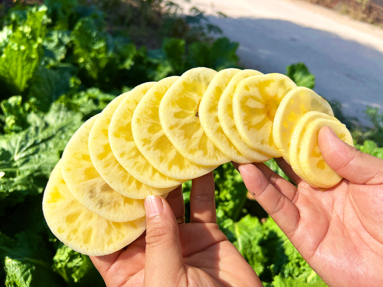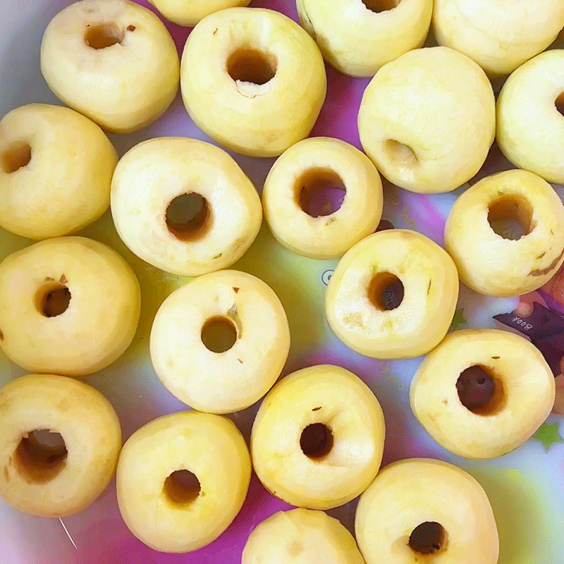 我们挑选出果肉紧实、无腐坏的丑苹果。仔细清洗表皮,然后将苹果逐一削皮、去核,切成约3-5毫米的均匀薄片。太厚不易烘干,太薄易碎。