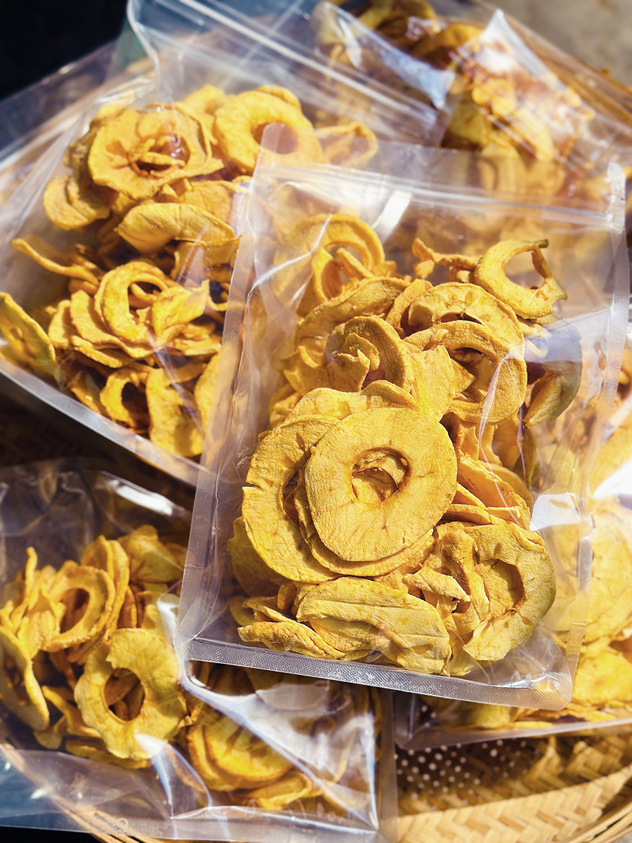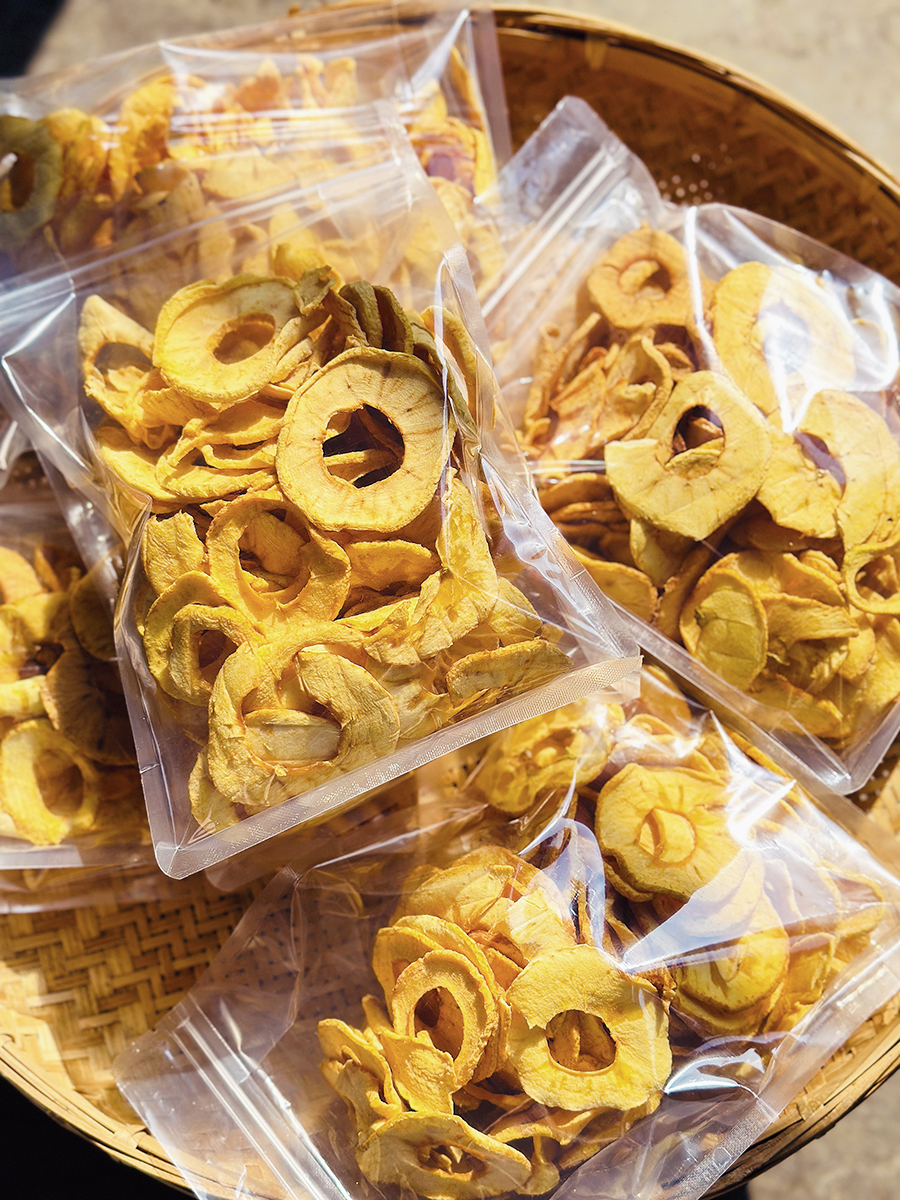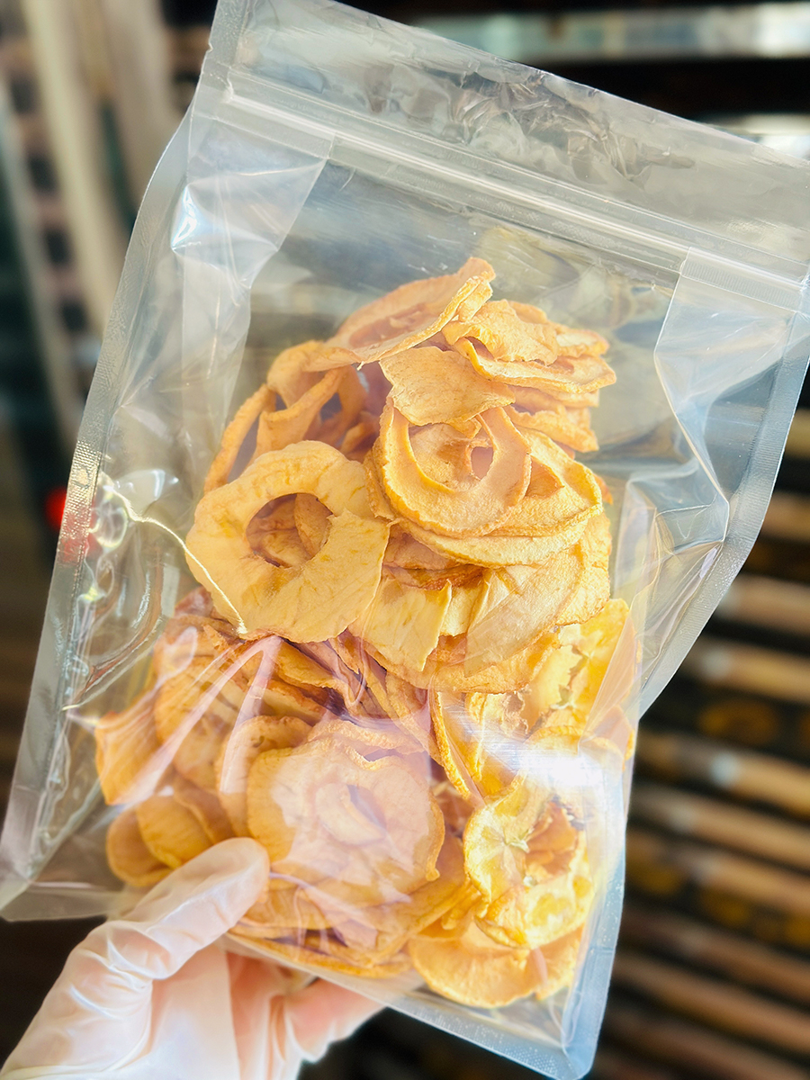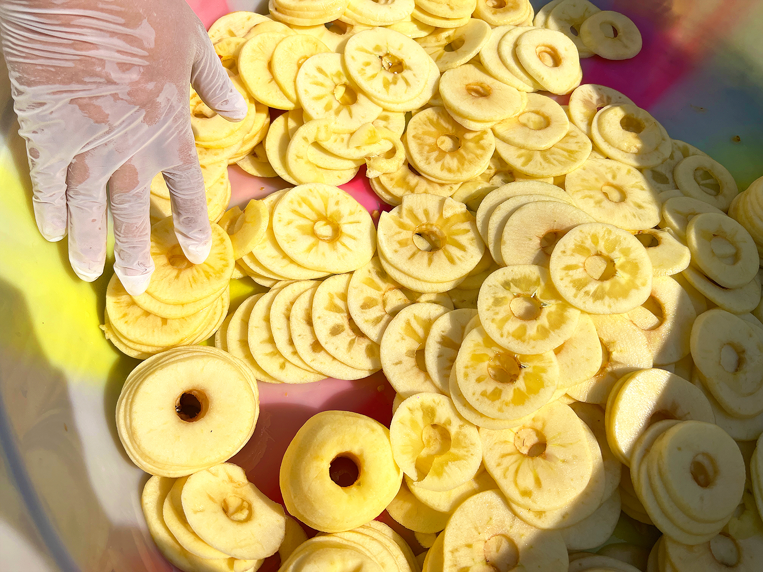 苹果干看似简单,却耗时耗力,更要消耗大量的丑苹果才能得到。烘烤的火候与细节技艺,都由经验扎实的老师傅亲力亲为来把控。