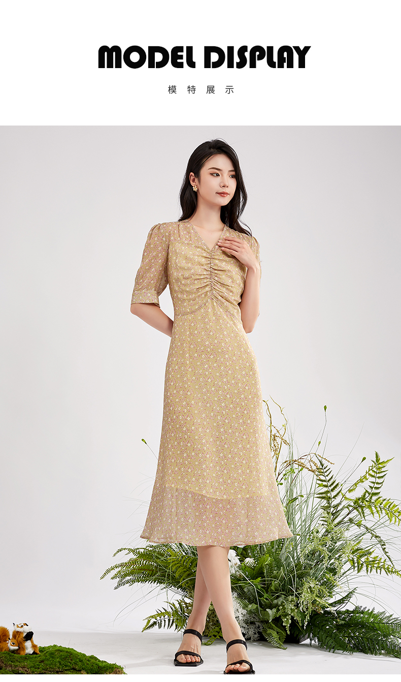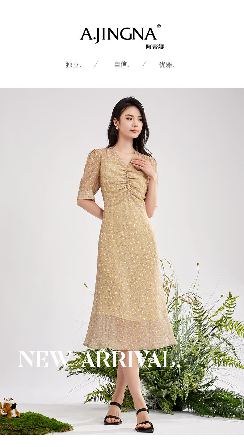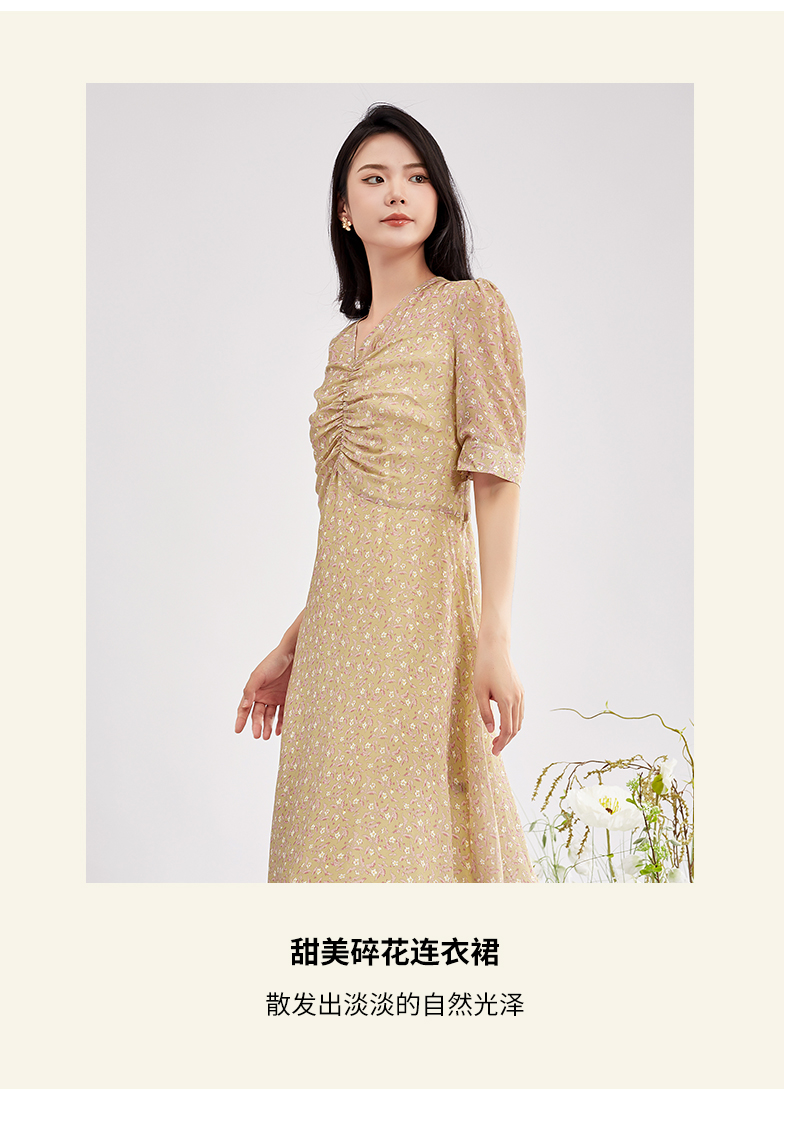 【积分兑换】阿菁娜春夏新款V领收腰碎花桑蚕丝法式连衣裙A28X112021
