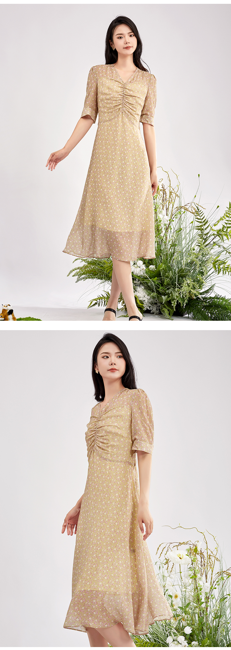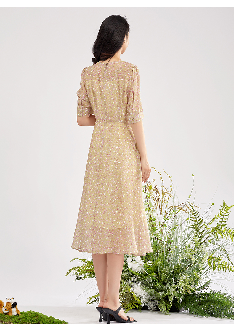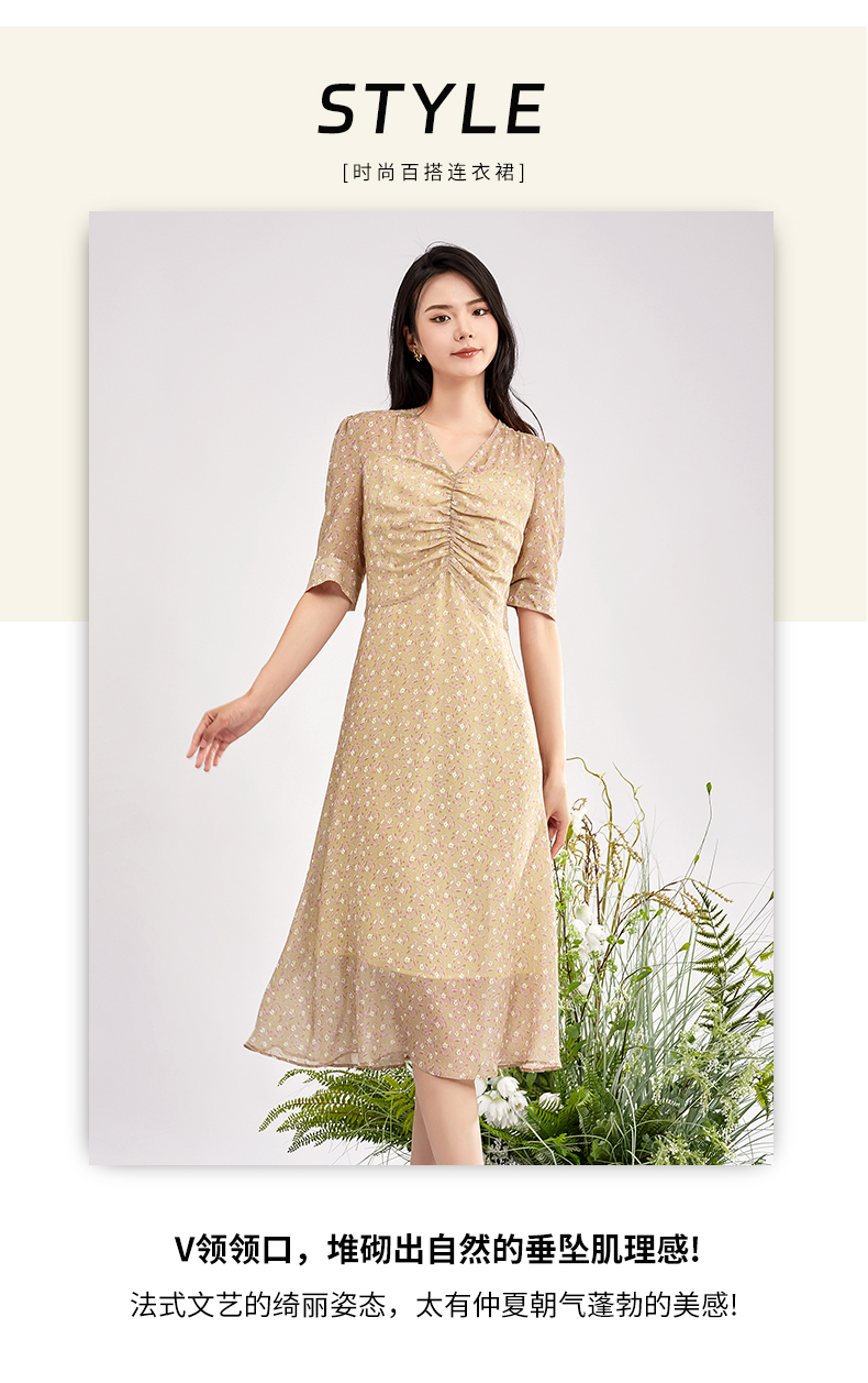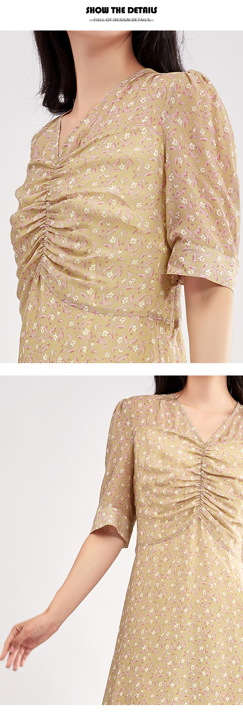 【积分兑换】阿菁娜春夏新款V领收腰碎花桑蚕丝法式连衣裙A28X112021