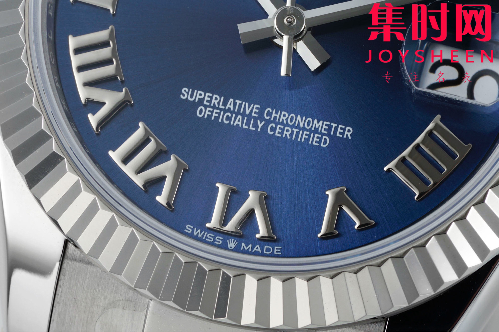 表盘在阳光下就像一面细腻的湖面,光滑却富有层次,每一次翻转手腕,都会折射出独特的光影效果。无论是经典银盘、香槟金盘,还是更现代的蓝盘,每一种颜色在放射纹工艺下都更显通透感和立体感,不会出现廉价的"死板反光"。即使在室内柔光环境下,表盘依然能保留低调的光泽,而不是某些版本表盘在低光下就变的黯淡无光。