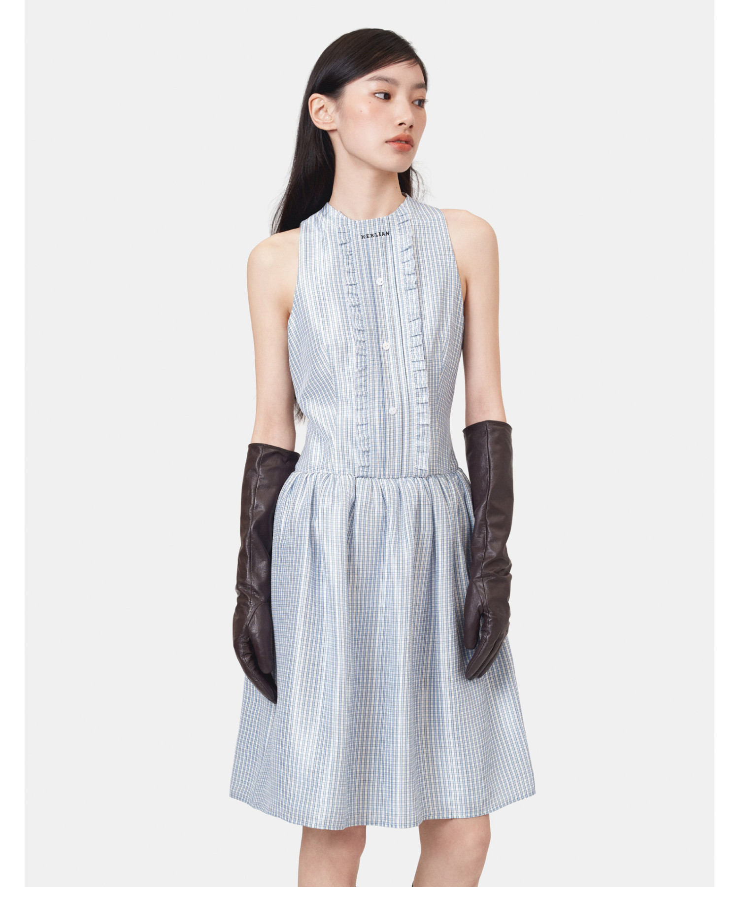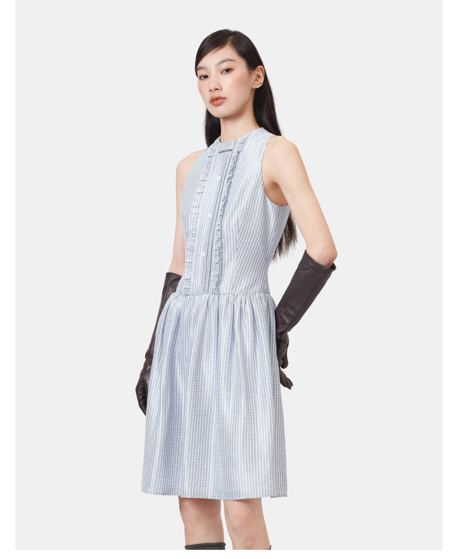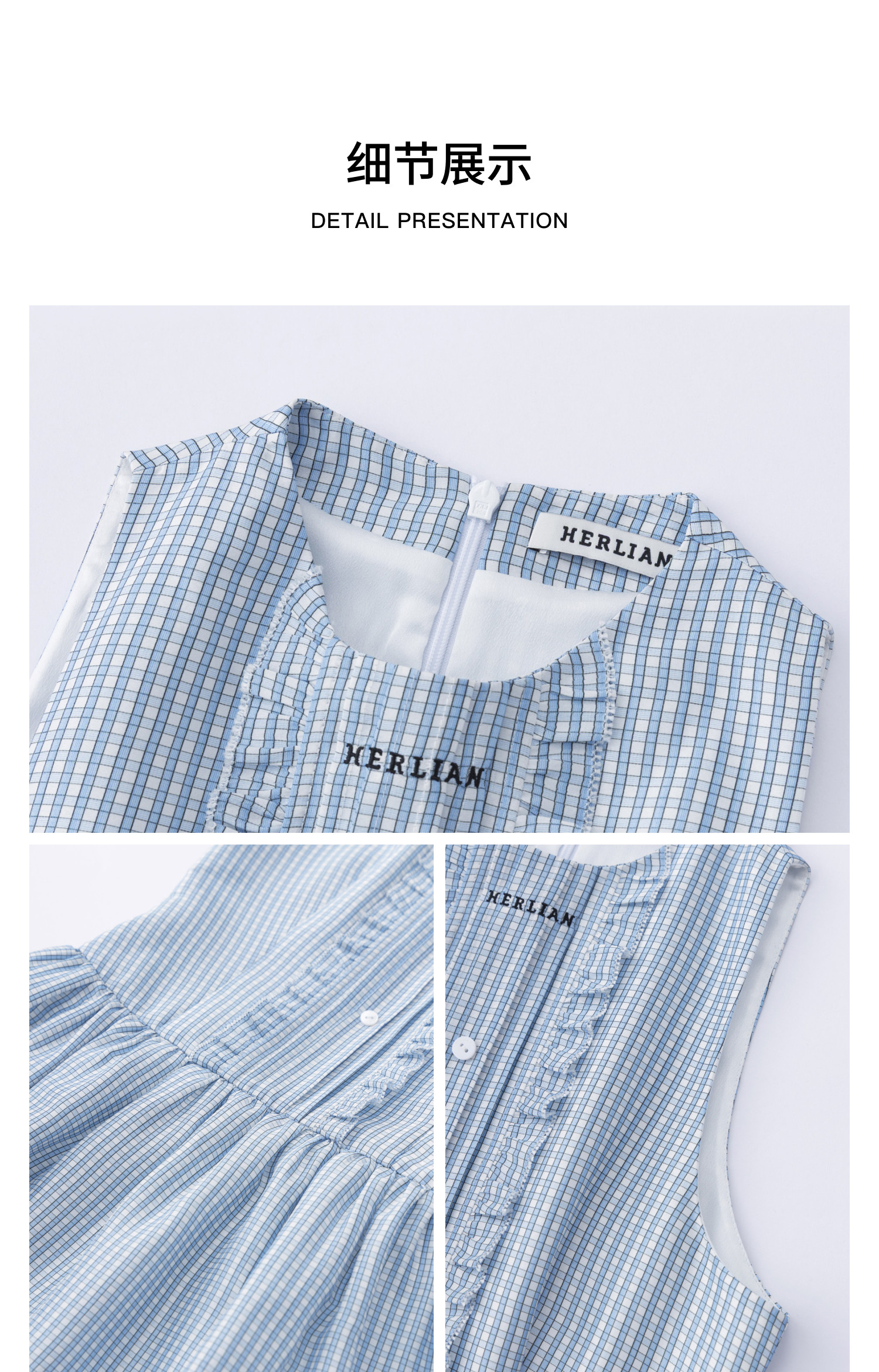 HERLIAN 2026年春季新品蓝格塔克褶荷叶花边桑蚕丝背心无袖连衣裙