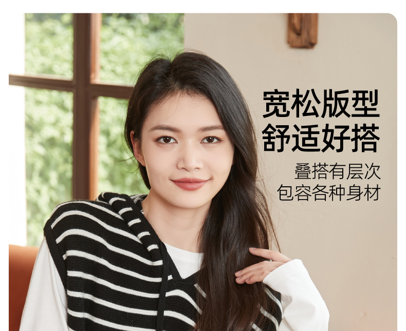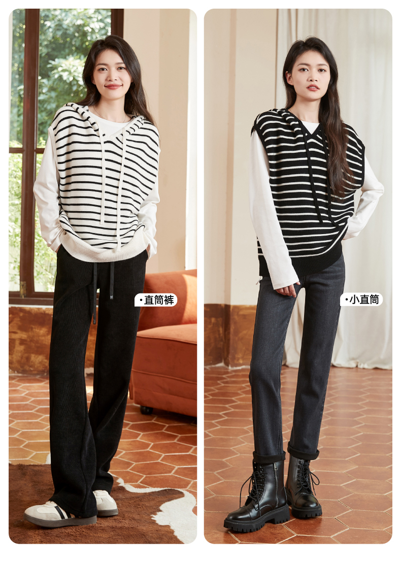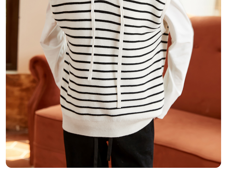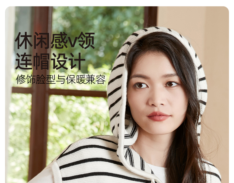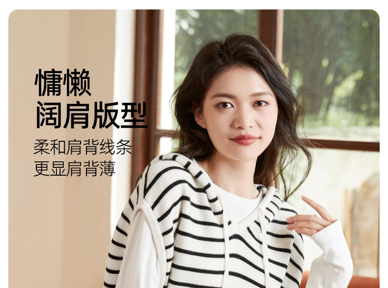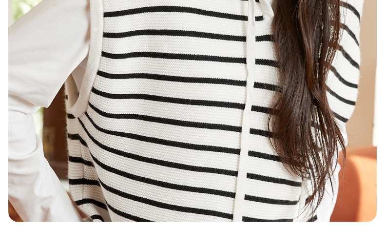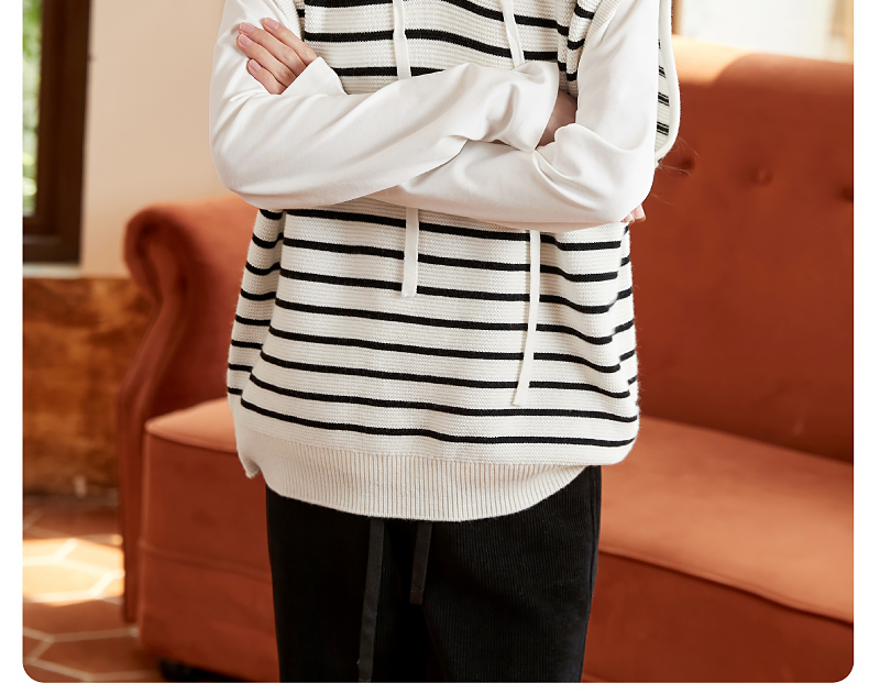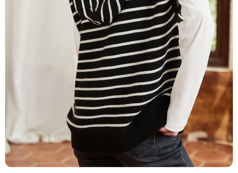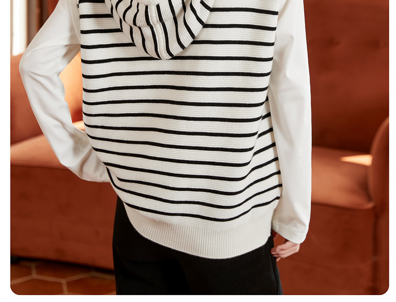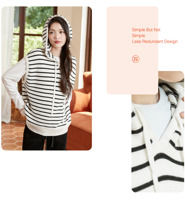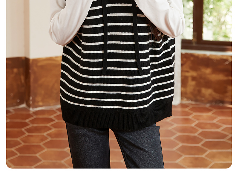 逸阳休闲连帽羊毛条纹针织马甲女2024新款宽松慵懒风上衣3486