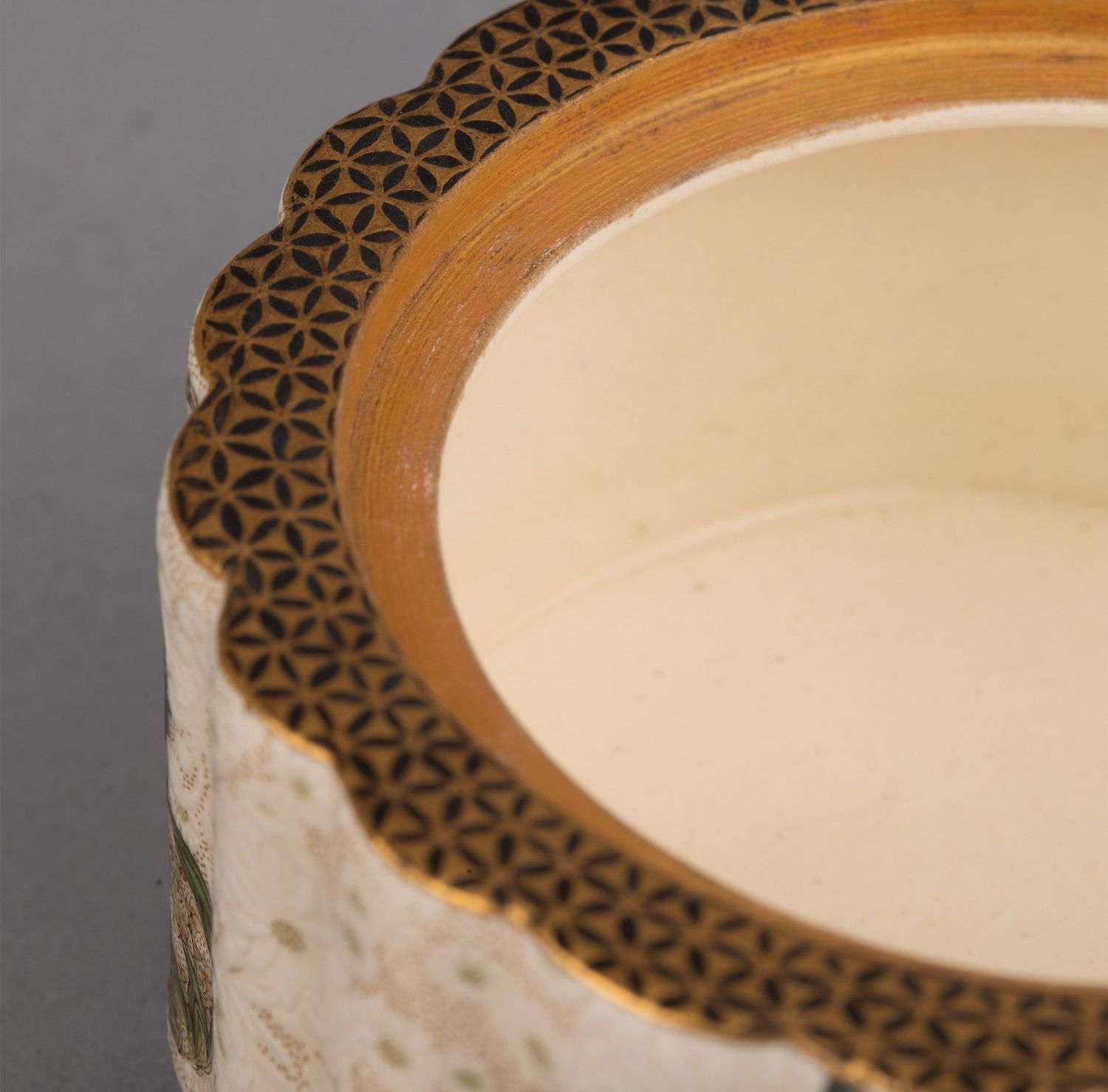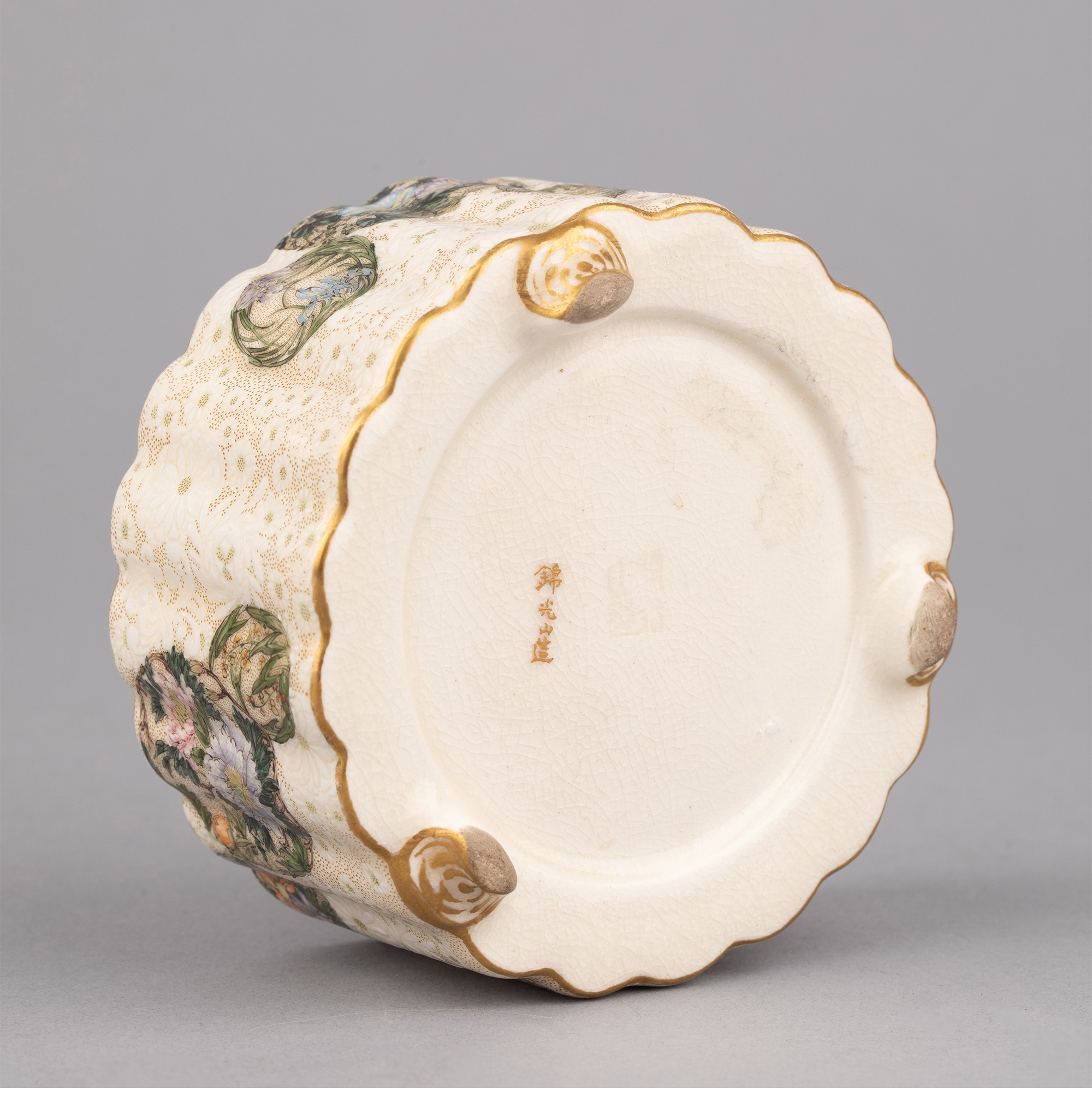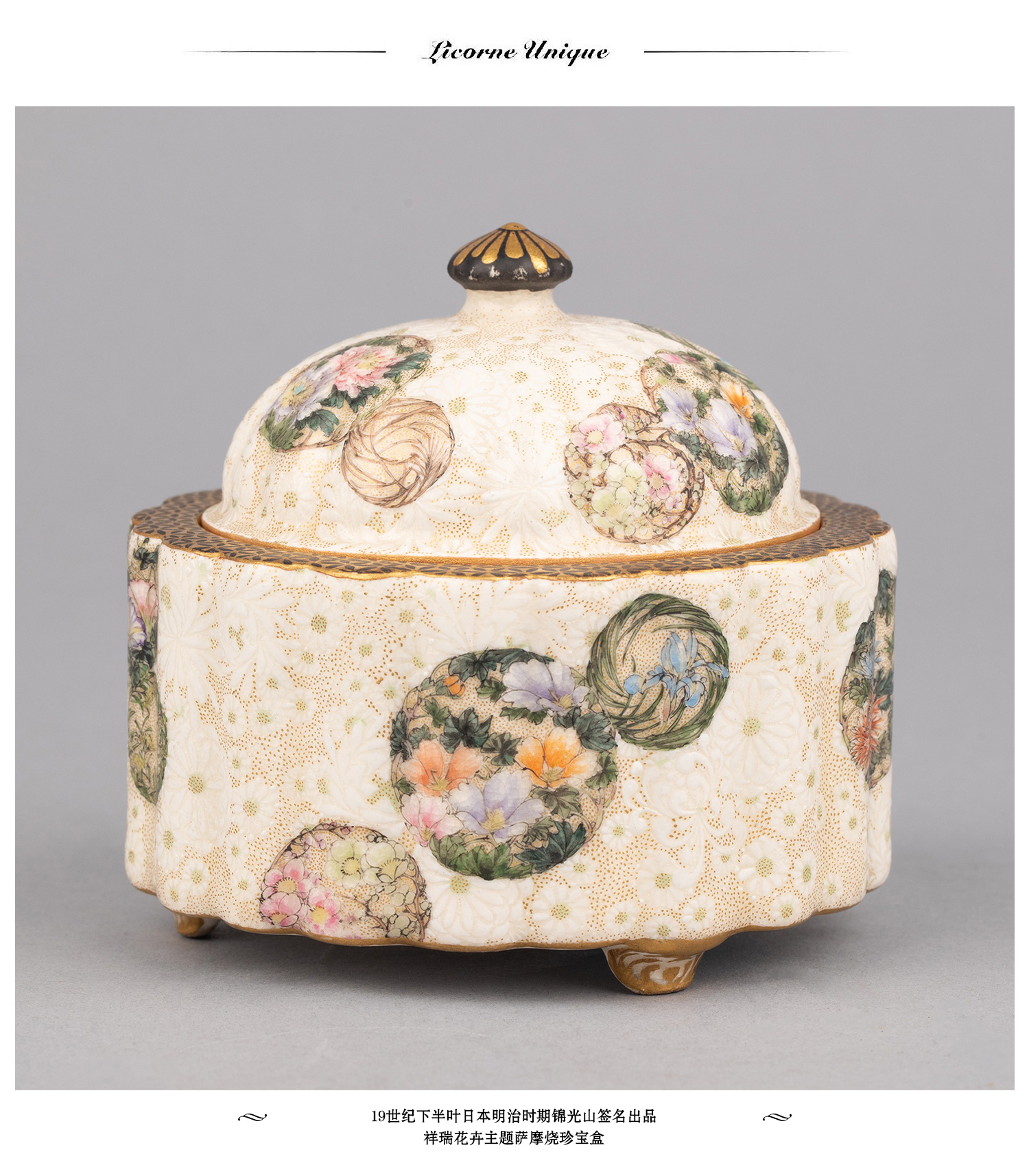 独角鹿西洋古董日本明治时期锦光山签名祥瑞花卉萨摩烧珍宝盒