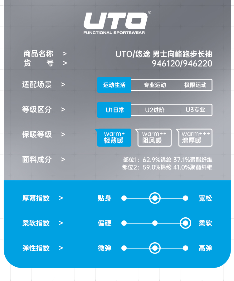 - UTO悠途潜心于贴身运动装备的研发、设计和生产。从纤维到组织,从设计到工艺,在无缝贴身运动装备领域,树立国内标杆。 UTO着力于品牌互联网化,不断采集大量运动数据,为跑步、健身、滑雪等不同类型的运动爱