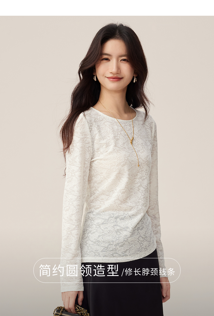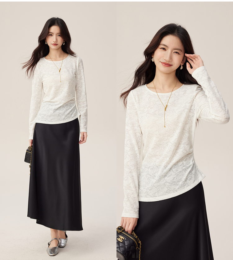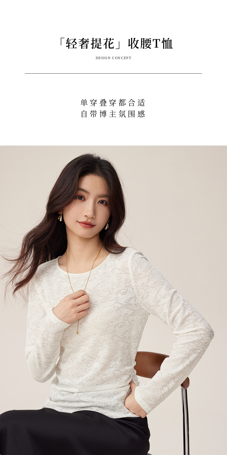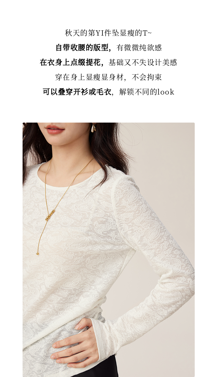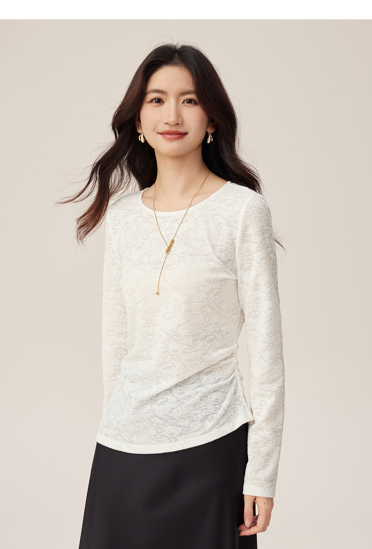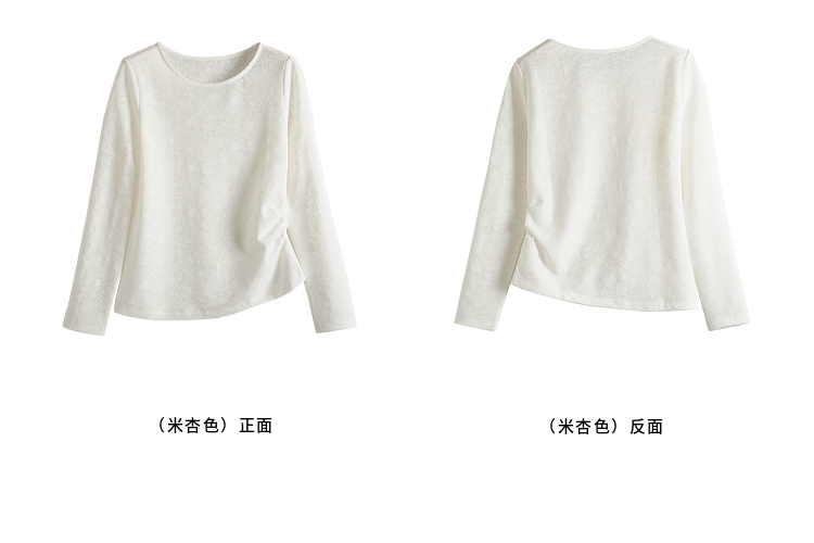 【08/19新品】熙世界白色提花长袖T恤女秋2025新款设计感圆领捏褶收腰显瘦上衣