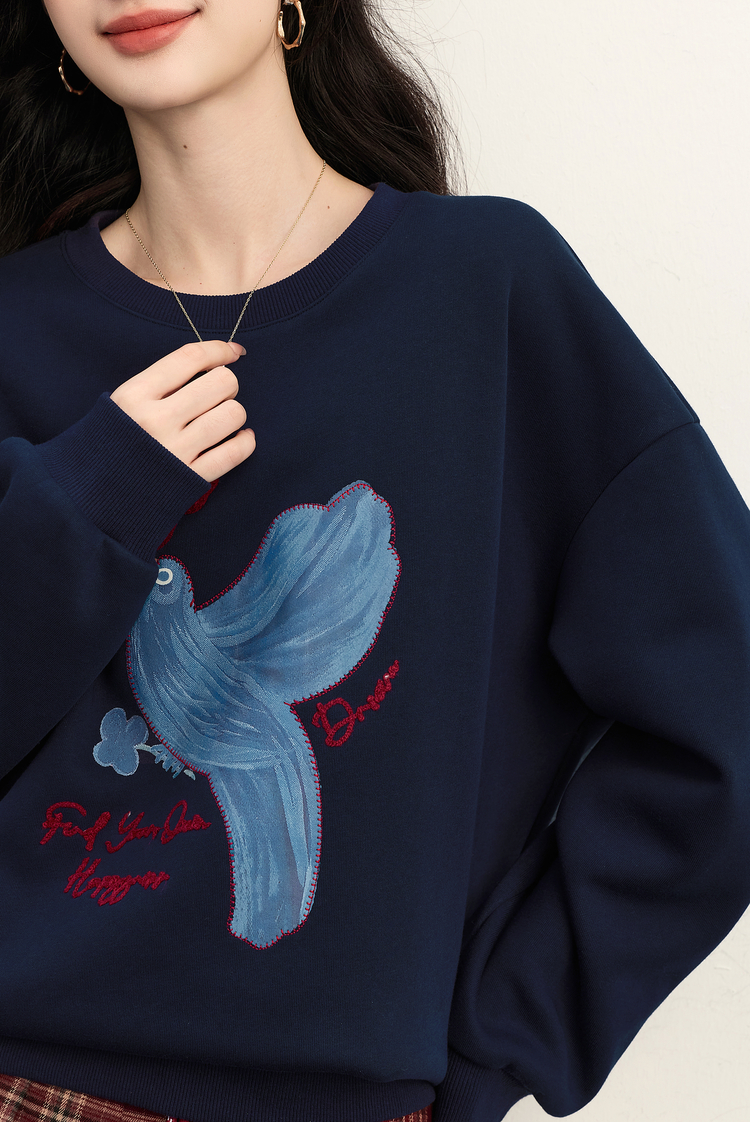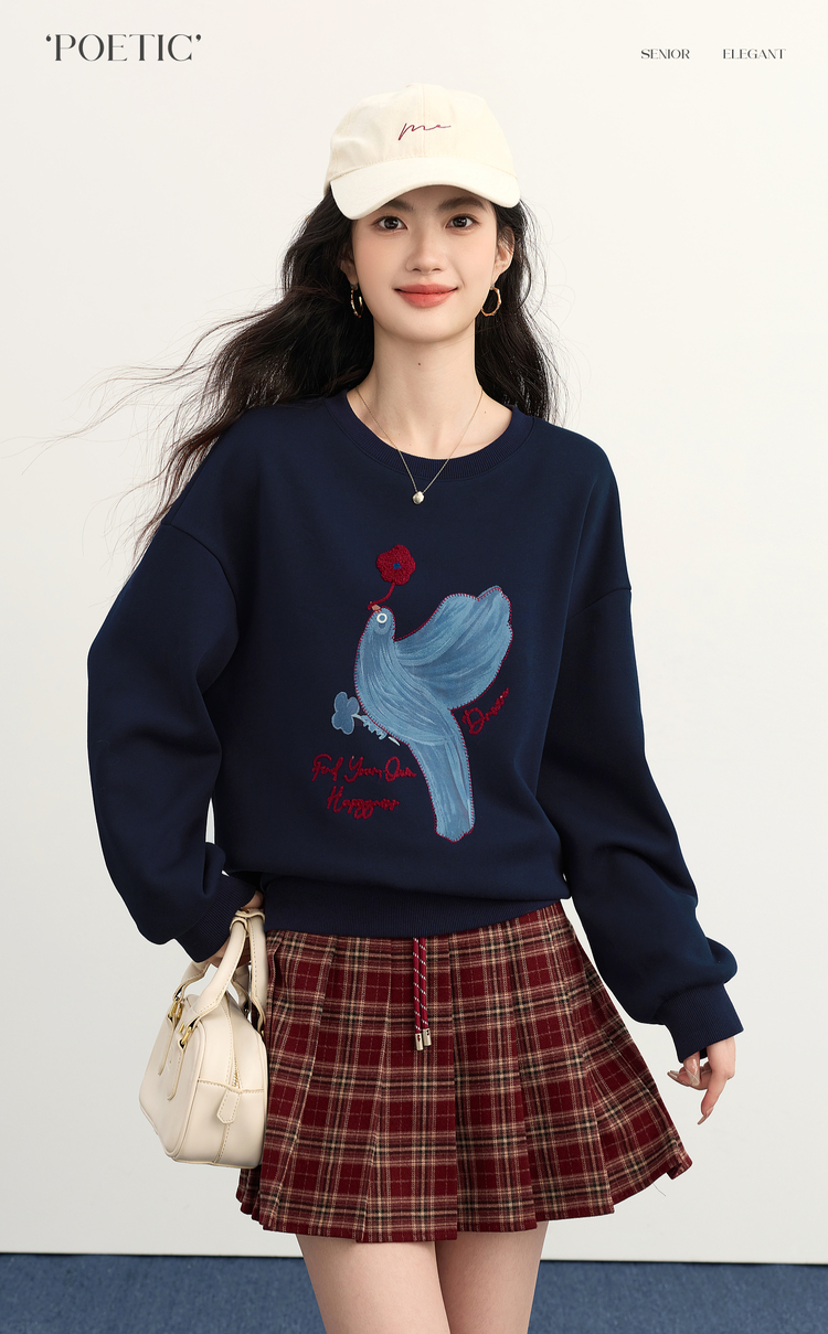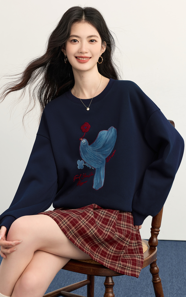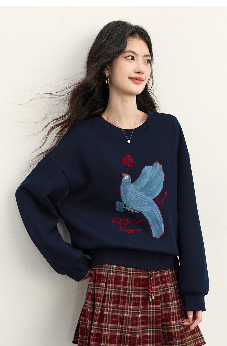 【年货节】熙世界「幸运飞鸟」加绒圆领卫衣女秋冬2025年新款宽松慵懒风上衣