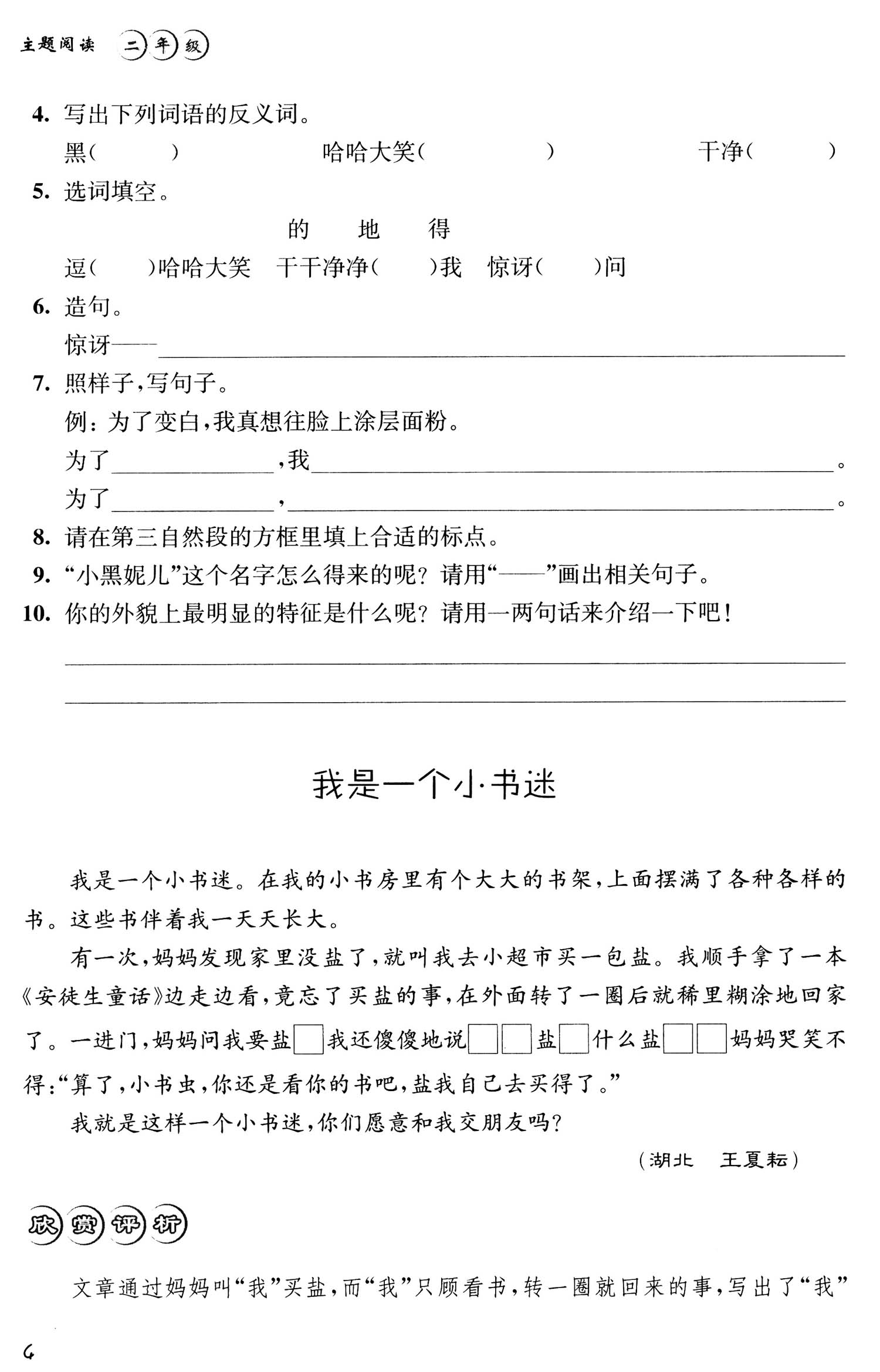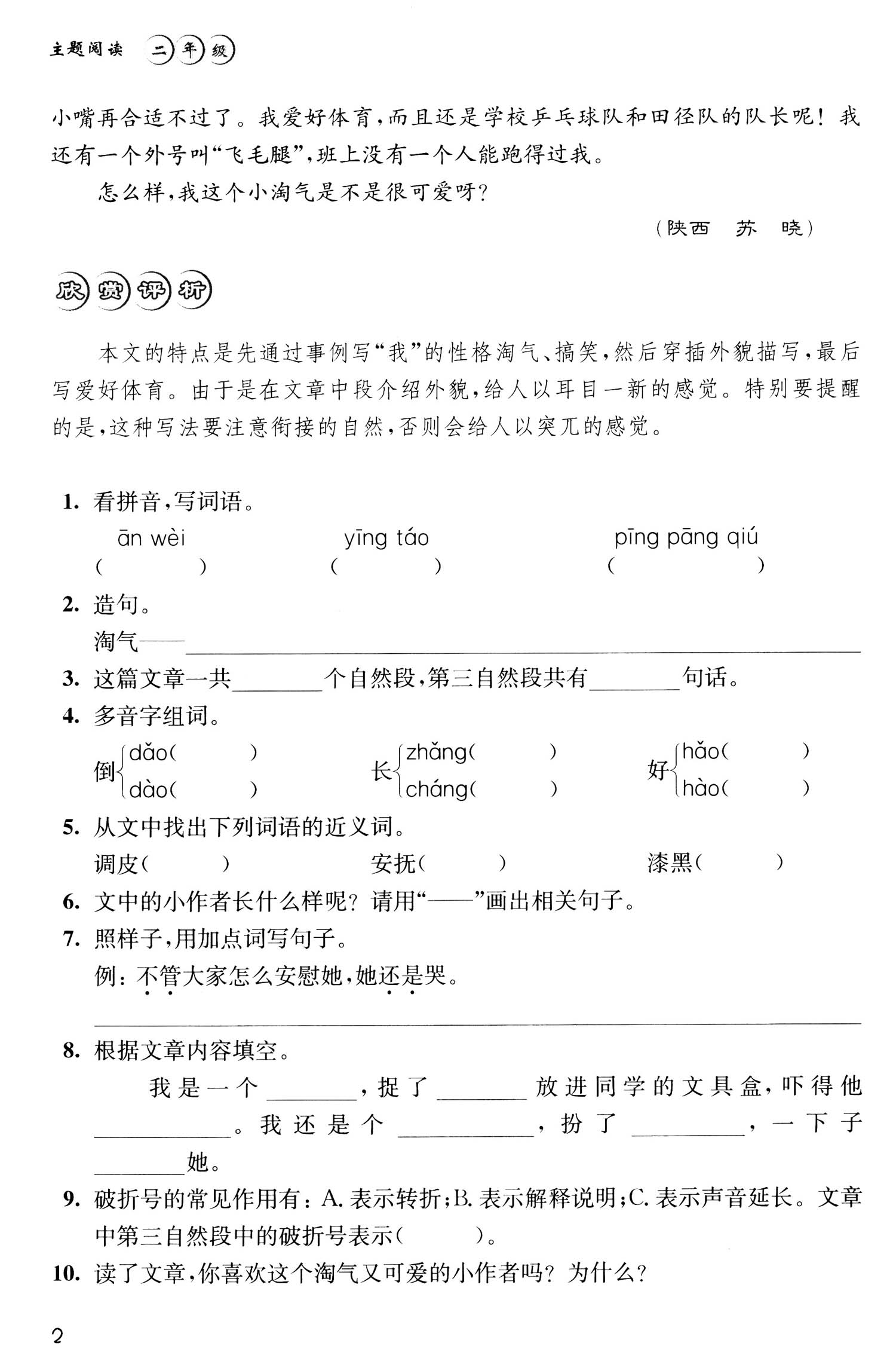 《主题阅读:二年级》共有18个主题阅读训练,每个单元由6个主题阅读训练组成,共108篇文章。每个单元的6篇文章都围绕一个主题来写,突出了《主题阅读:二年级》的特色“主题”,让学生在阅读和自己相近的同龄人的习作中学习简单的写作方法。每篇文章后都附有一定量的练习题,供学生在阅读文章后巩固基础知识。