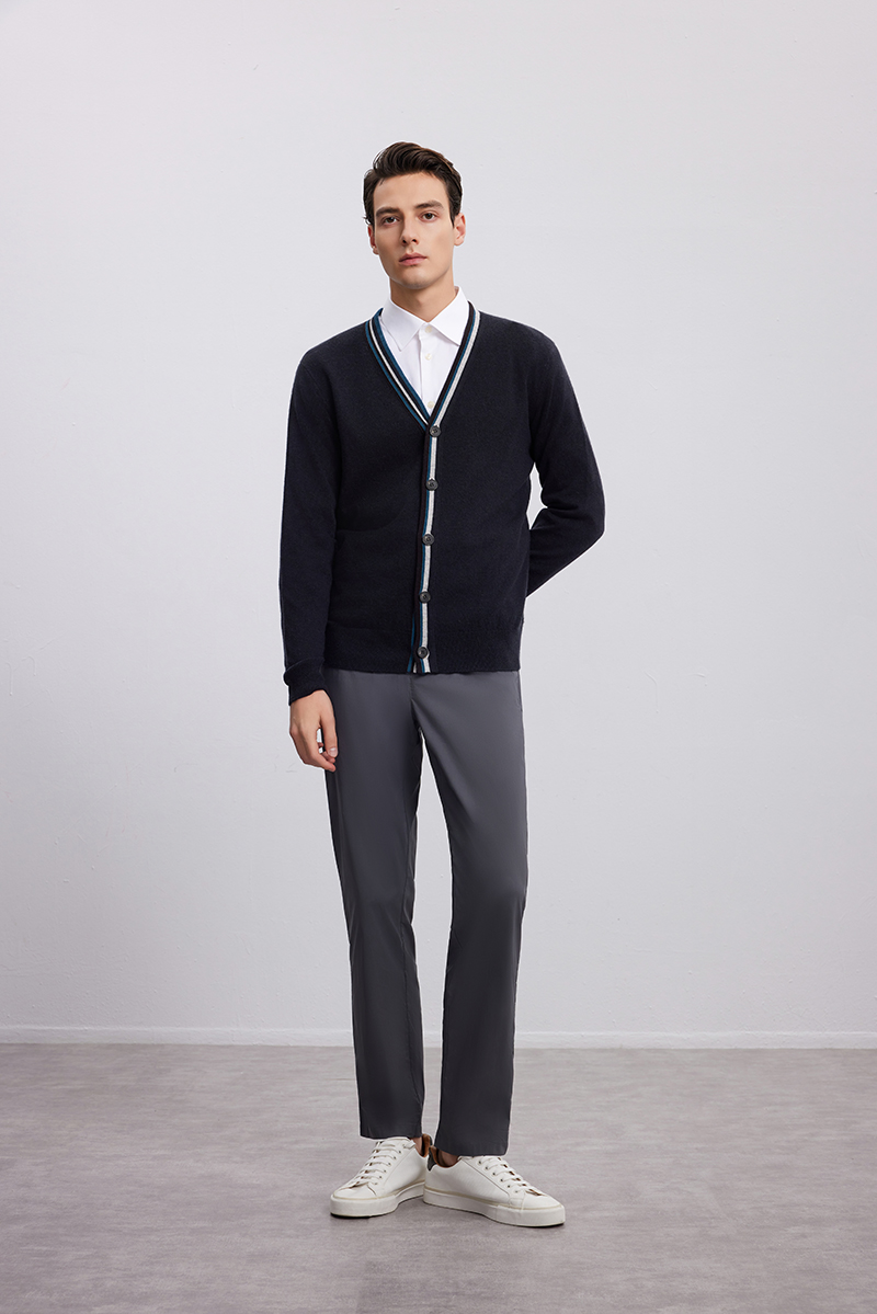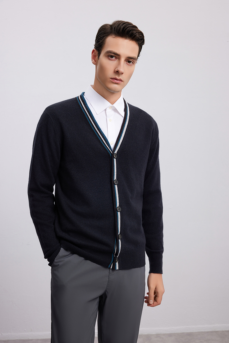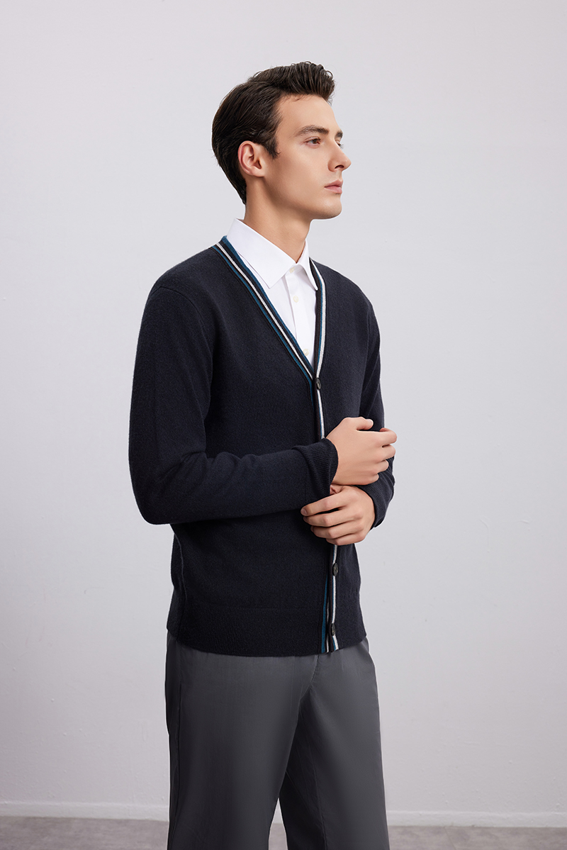 【V领条纹撞色针织开衫】羊绒世家秋冬新品男士100%山羊绒针织开衫外套