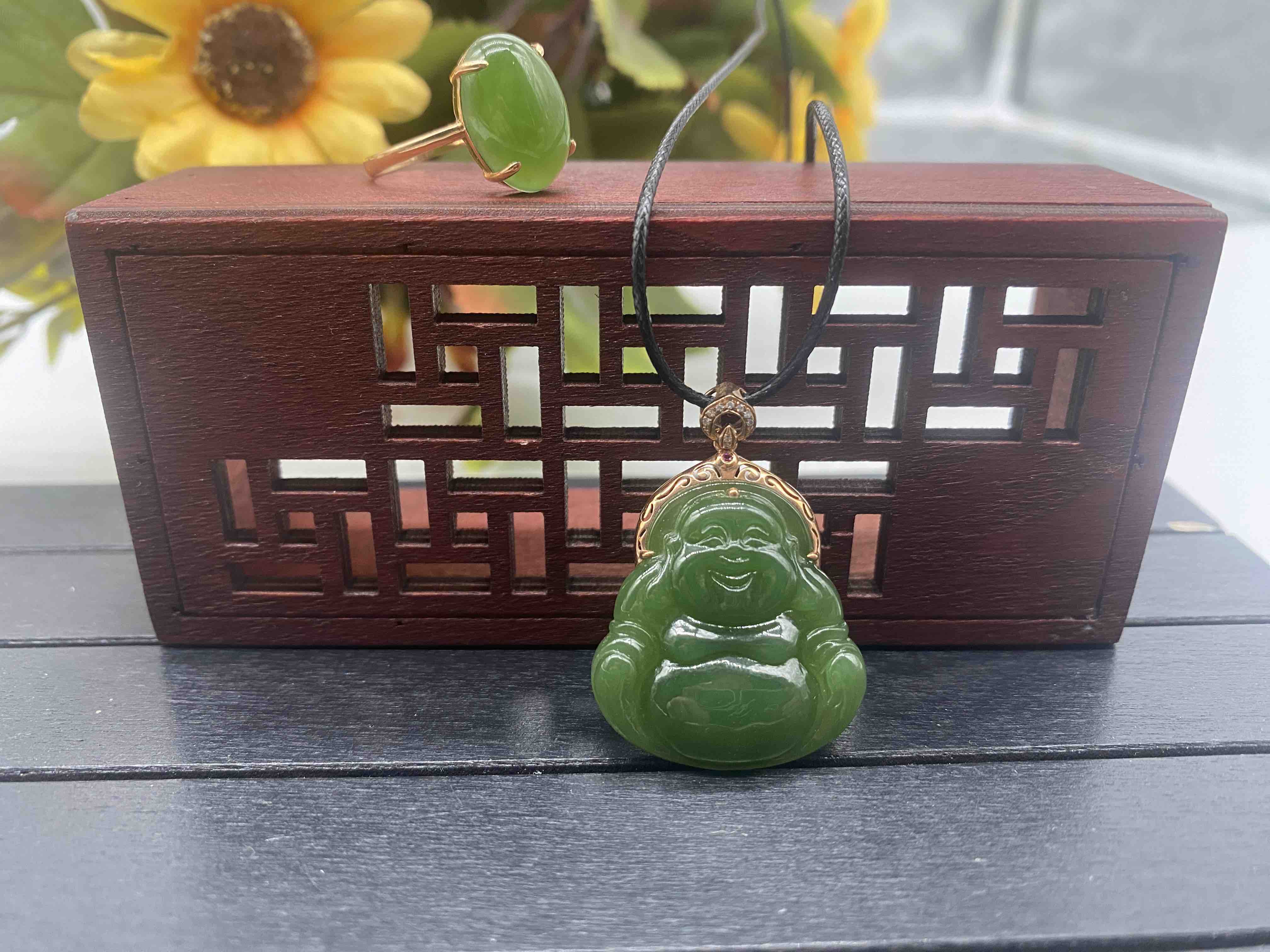 18k镶嵌和田玉吊坠戒指套装