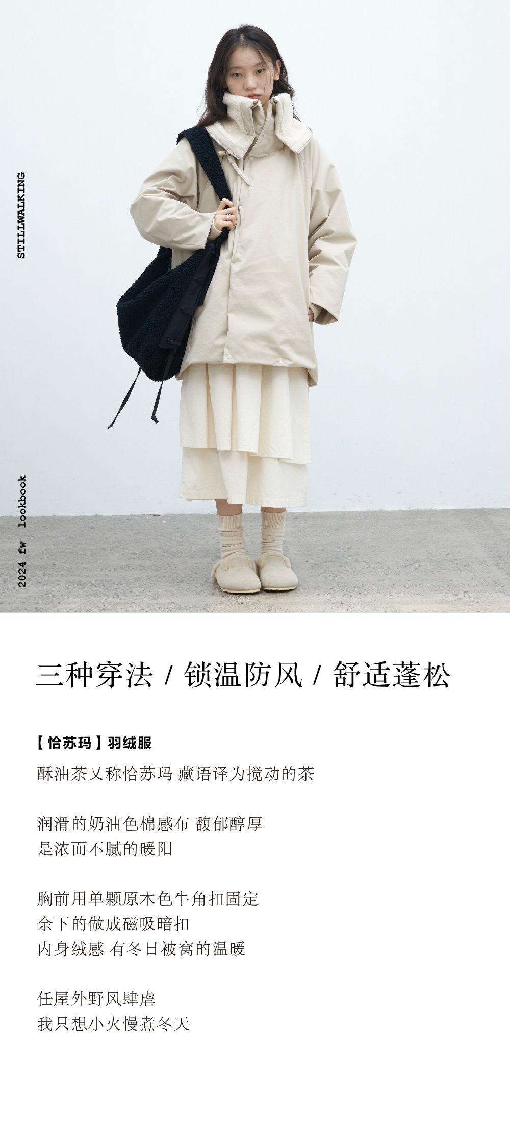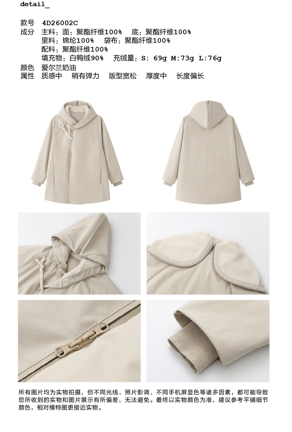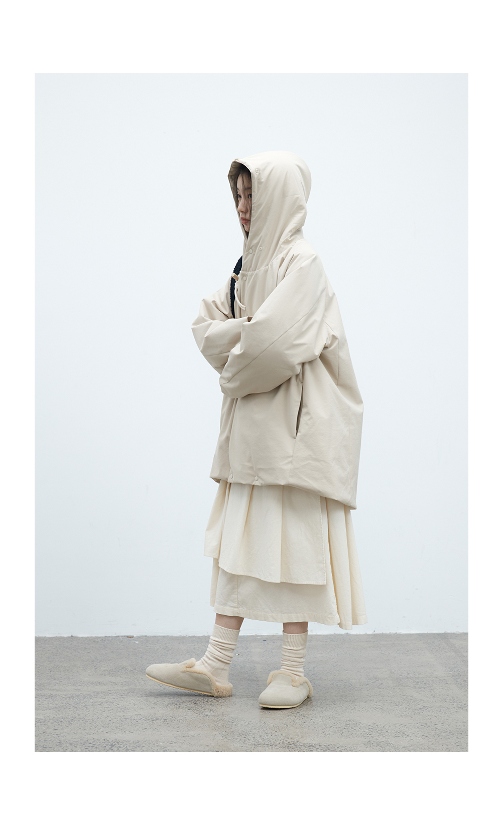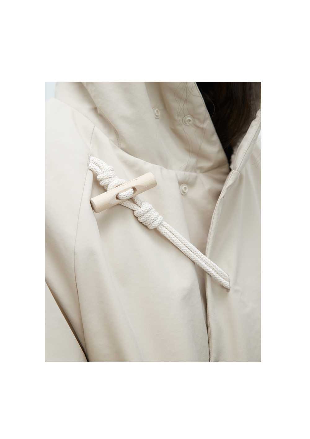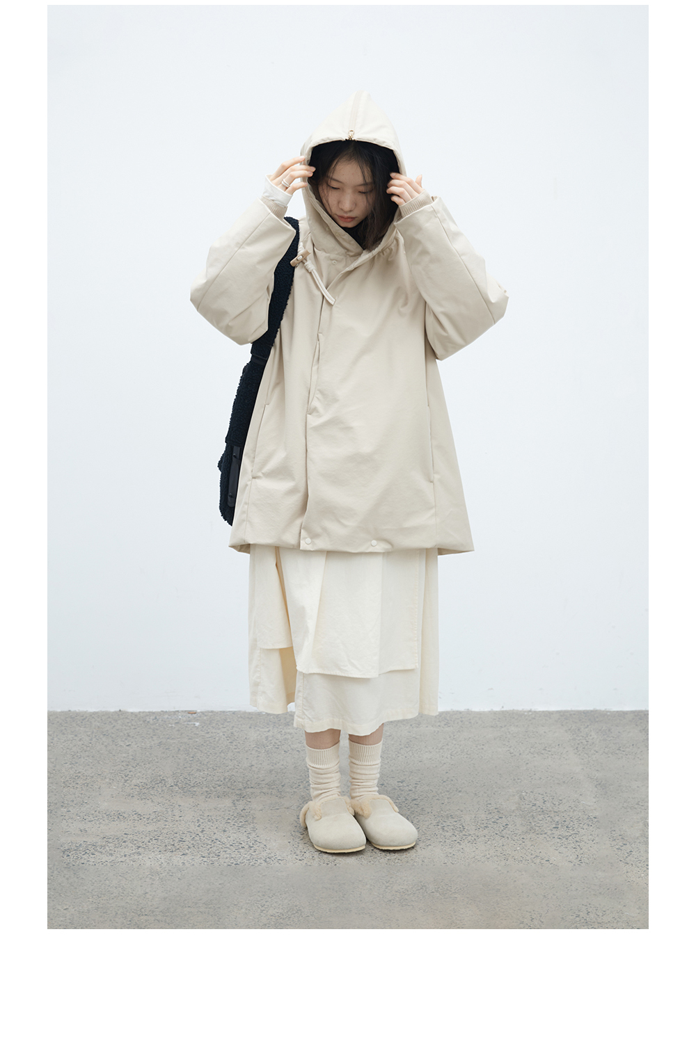 步履不停/4D26002C/连帽橄榄扣米白色中长款羽绒服