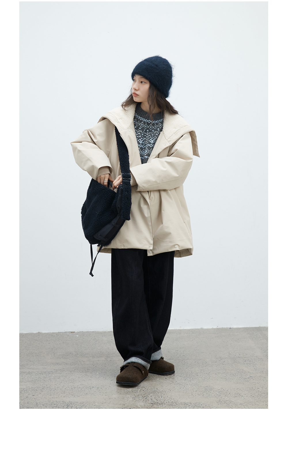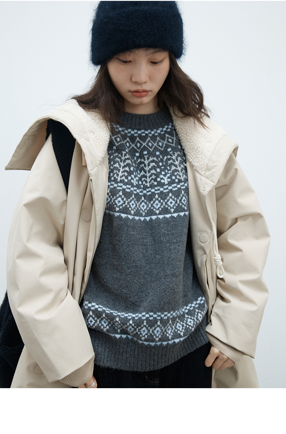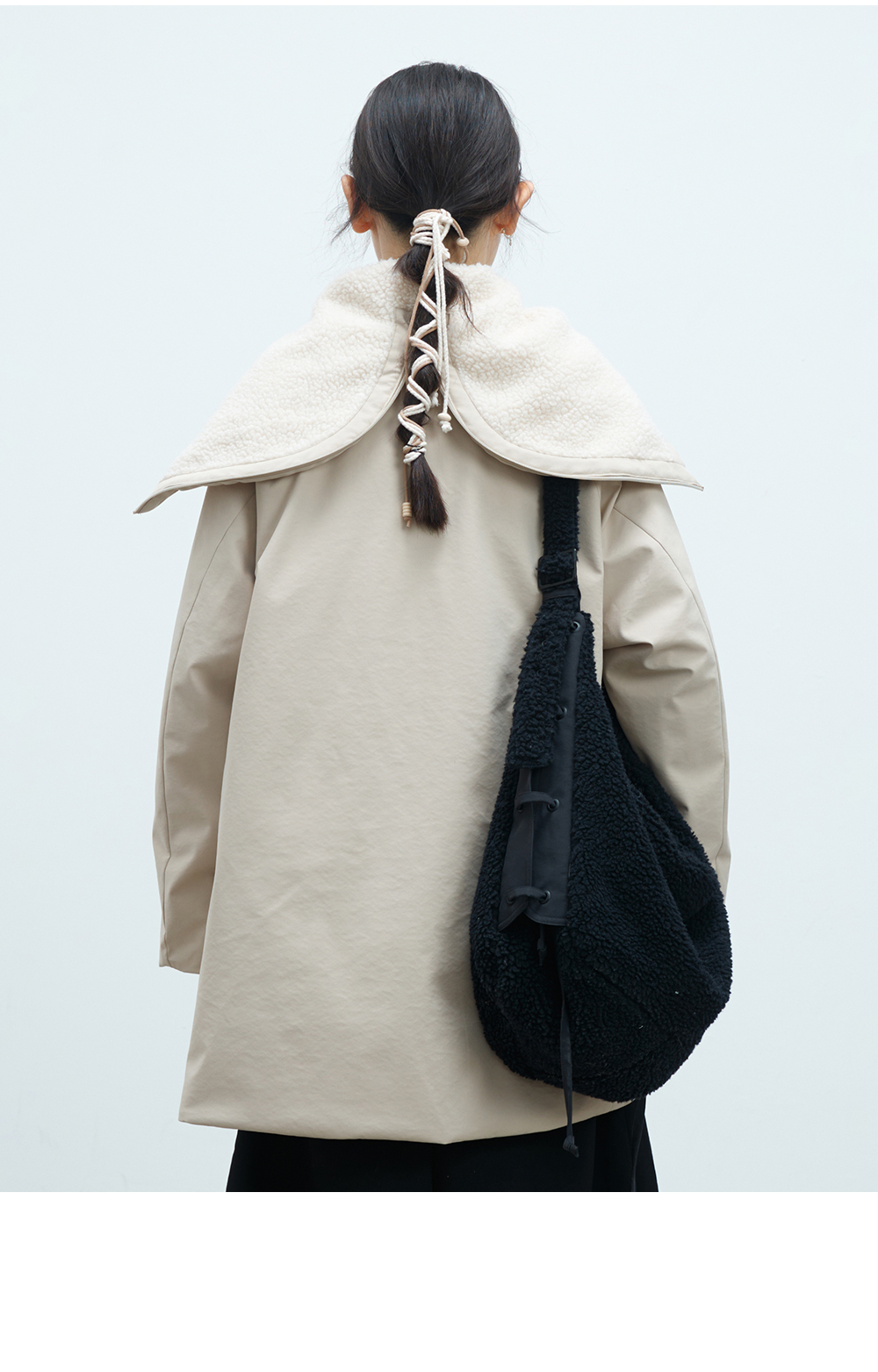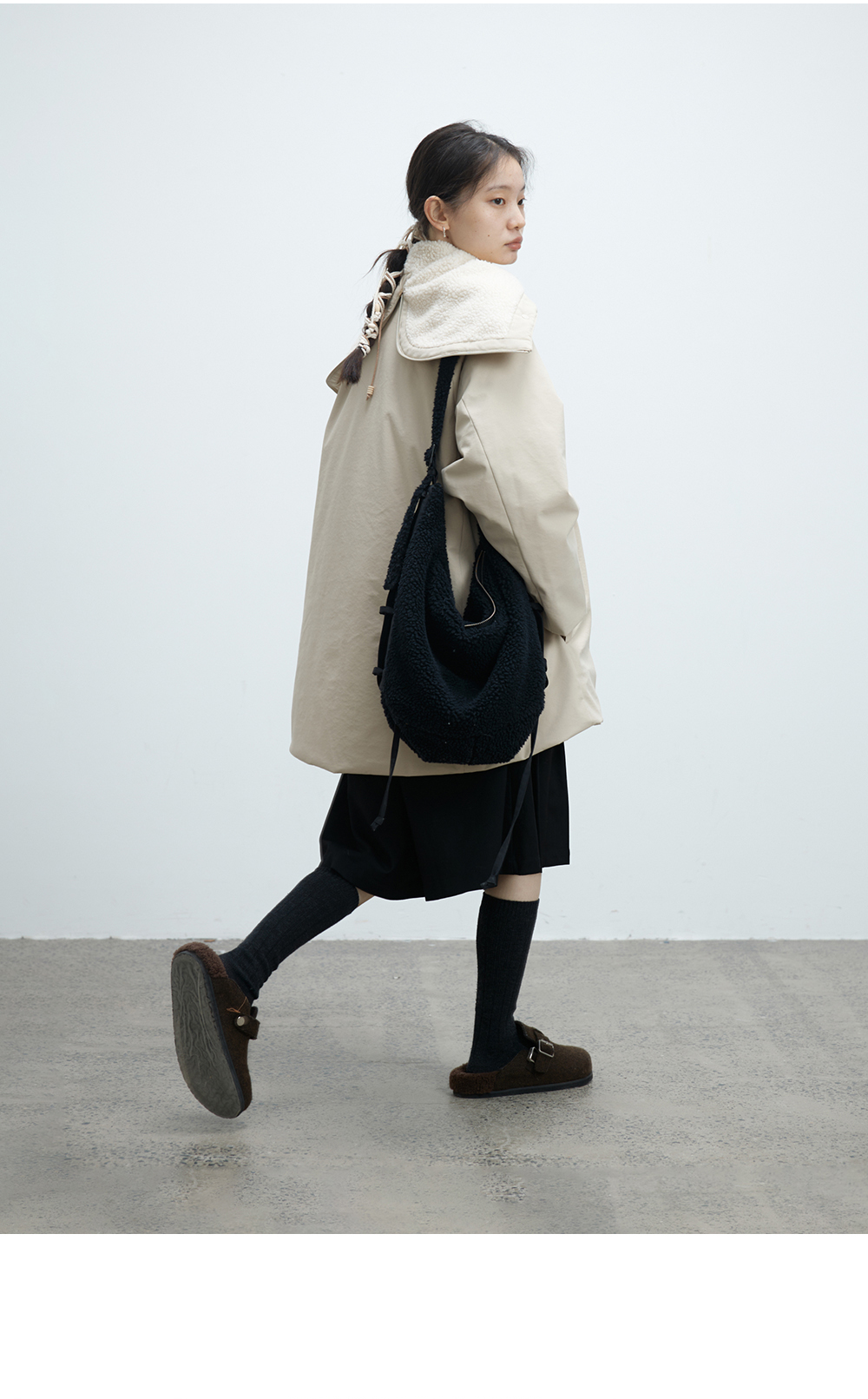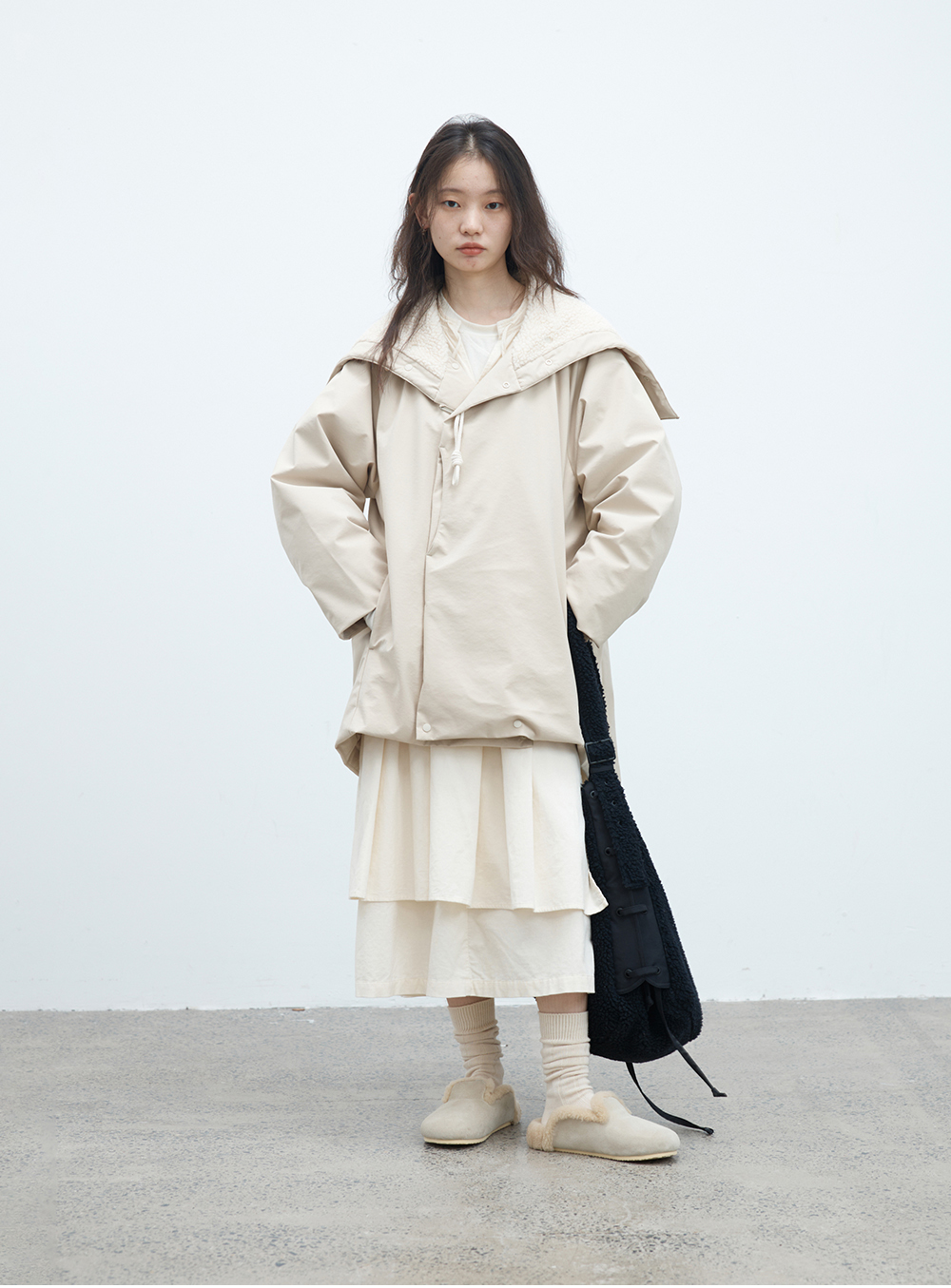 步履不停/4D26002C/连帽橄榄扣米白色中长款羽绒服