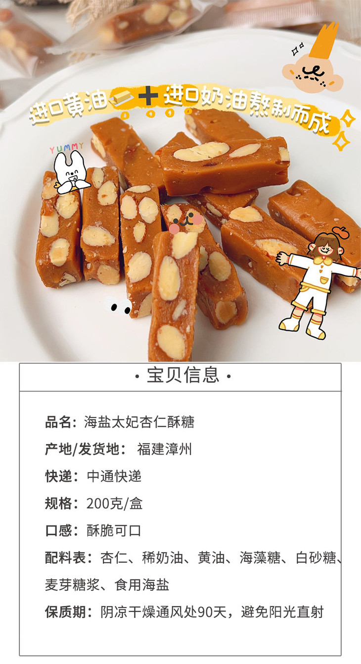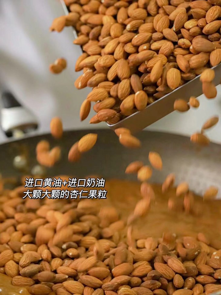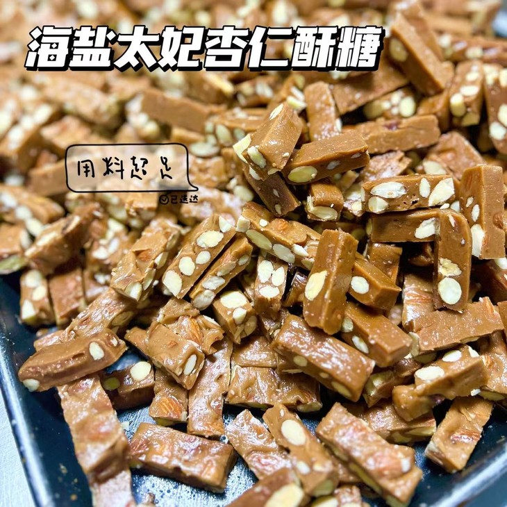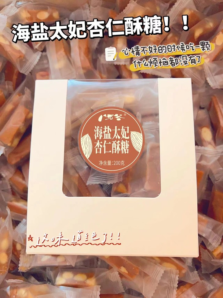 【海盐太妃杏仁酥糖】进口总统黄油和进口铁塔淡奶油熬制而成,咬着特别酥脆 ,不腻不粘牙,吃起来像饼干一样过瘾。用料超级足,每款都有大颗大颗的杏仁果粒,吃起来超满足!