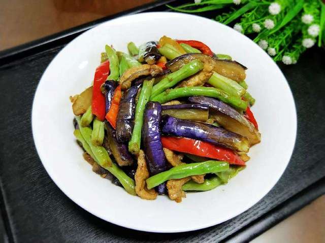 放入茄子和豆角翻炒,加入生抽、蚝油和少许清水翻炒均匀