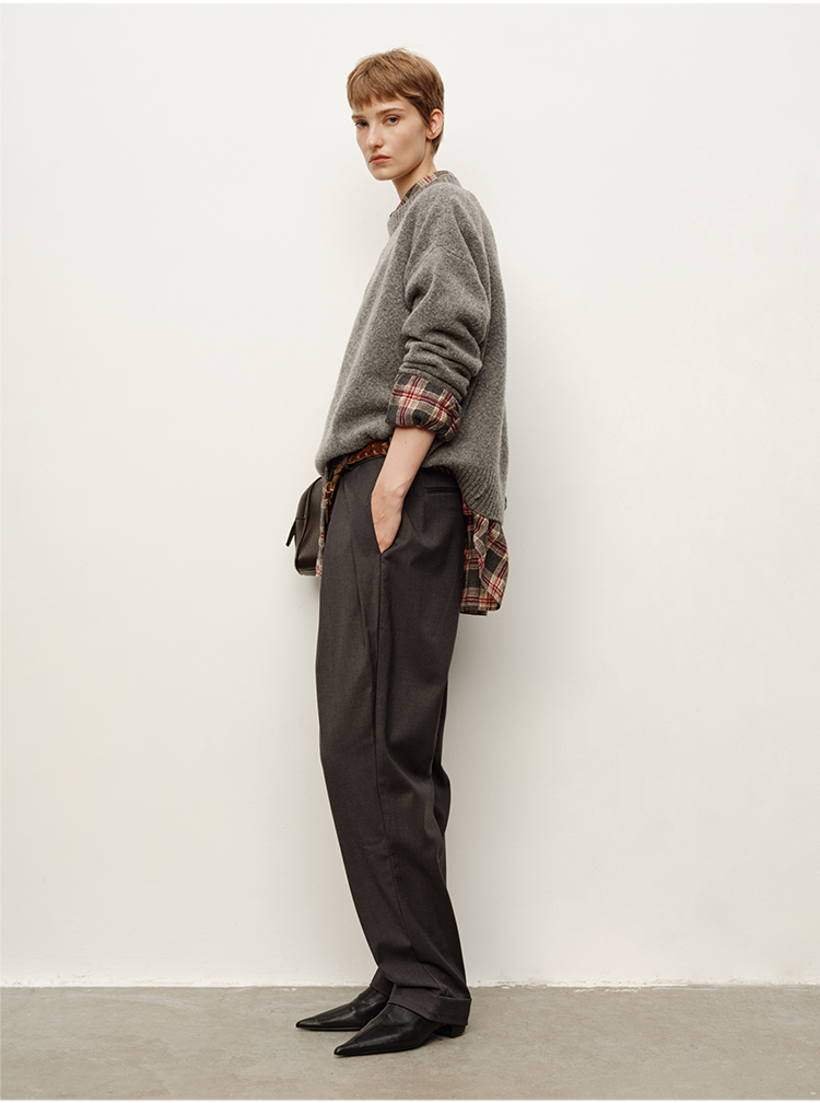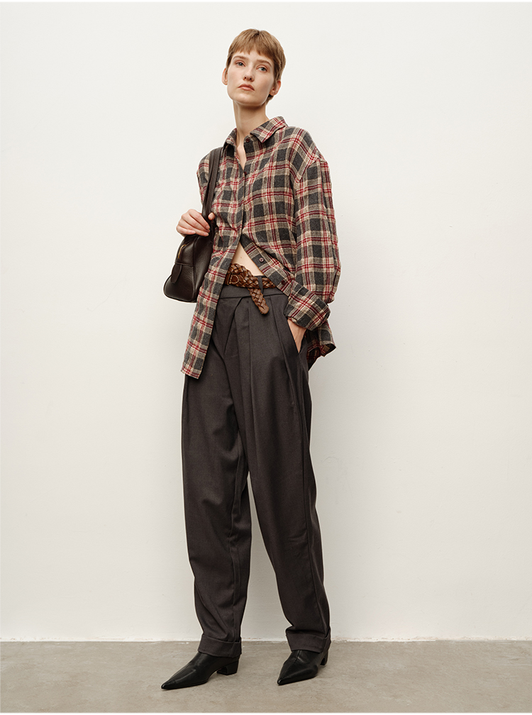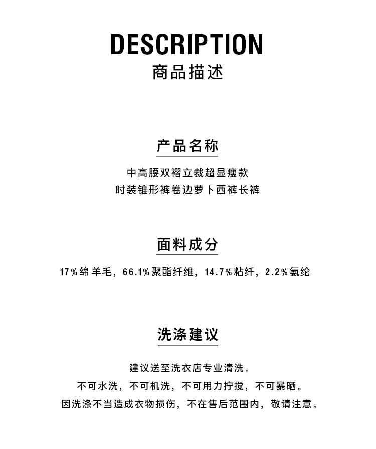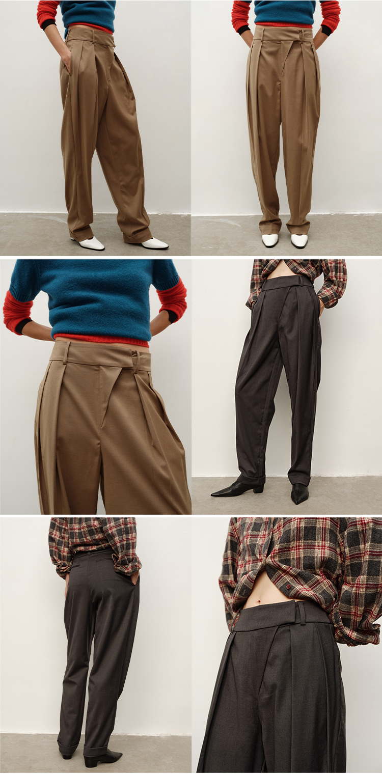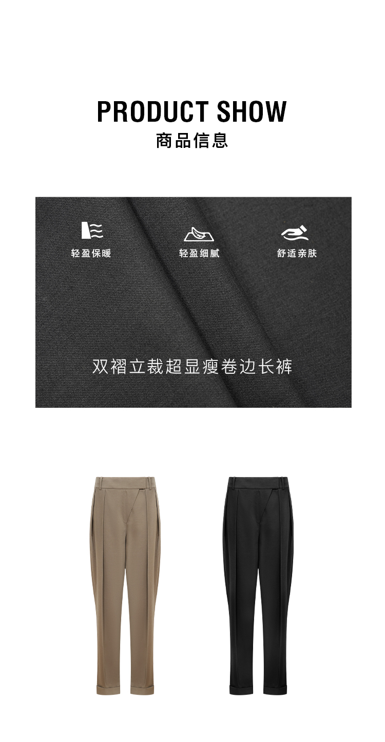 HIDEMI大秀款中高腰双褶立裁超显瘦款时装锥形裤卷边萝卜西裤长裤