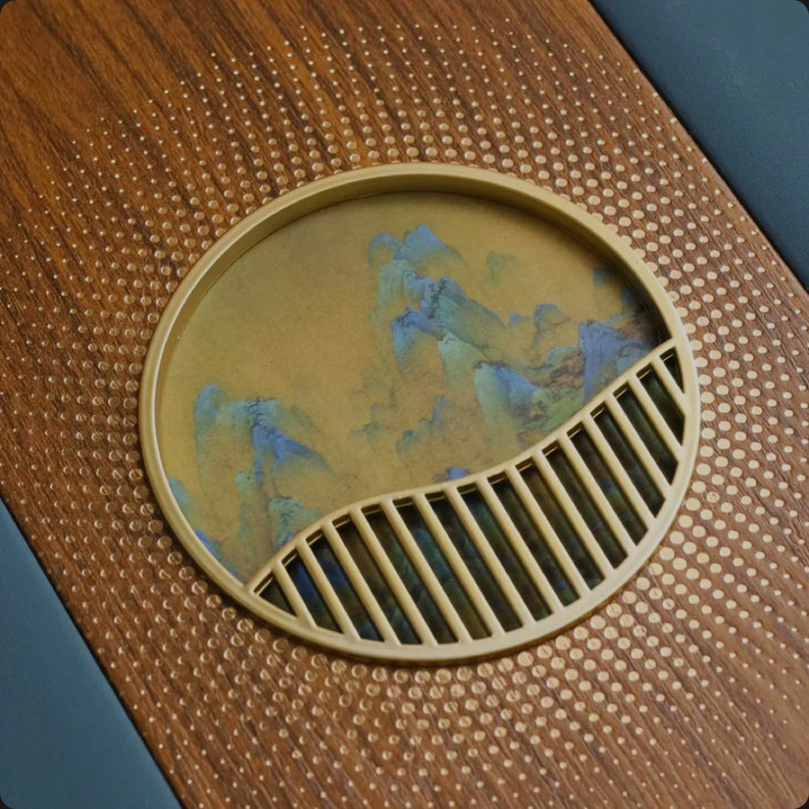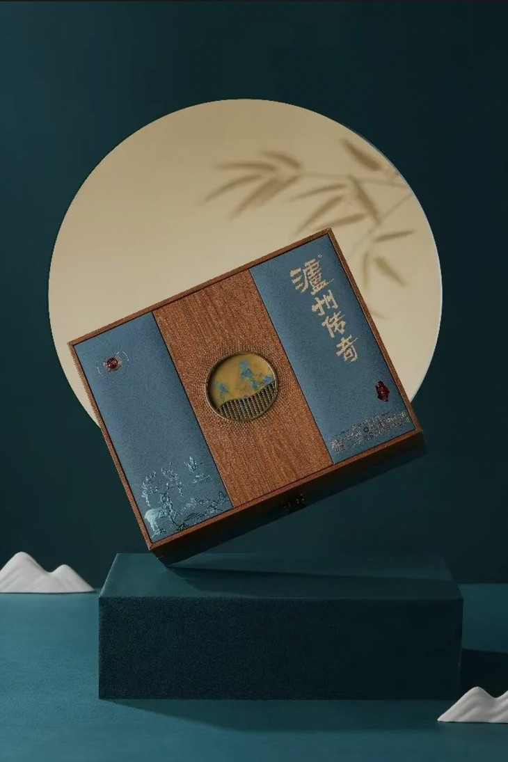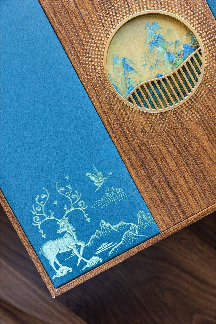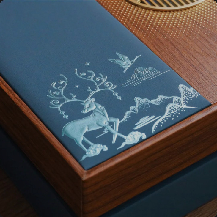 木纹礼盒,中部镂空镶嵌《千里江山图》(局部),颇具质感的点缀,气质都不一样了,更显古韵。