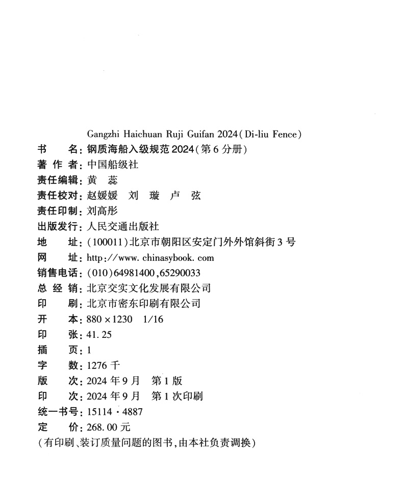 书名:钢质海船入级规范2024(第6分册)