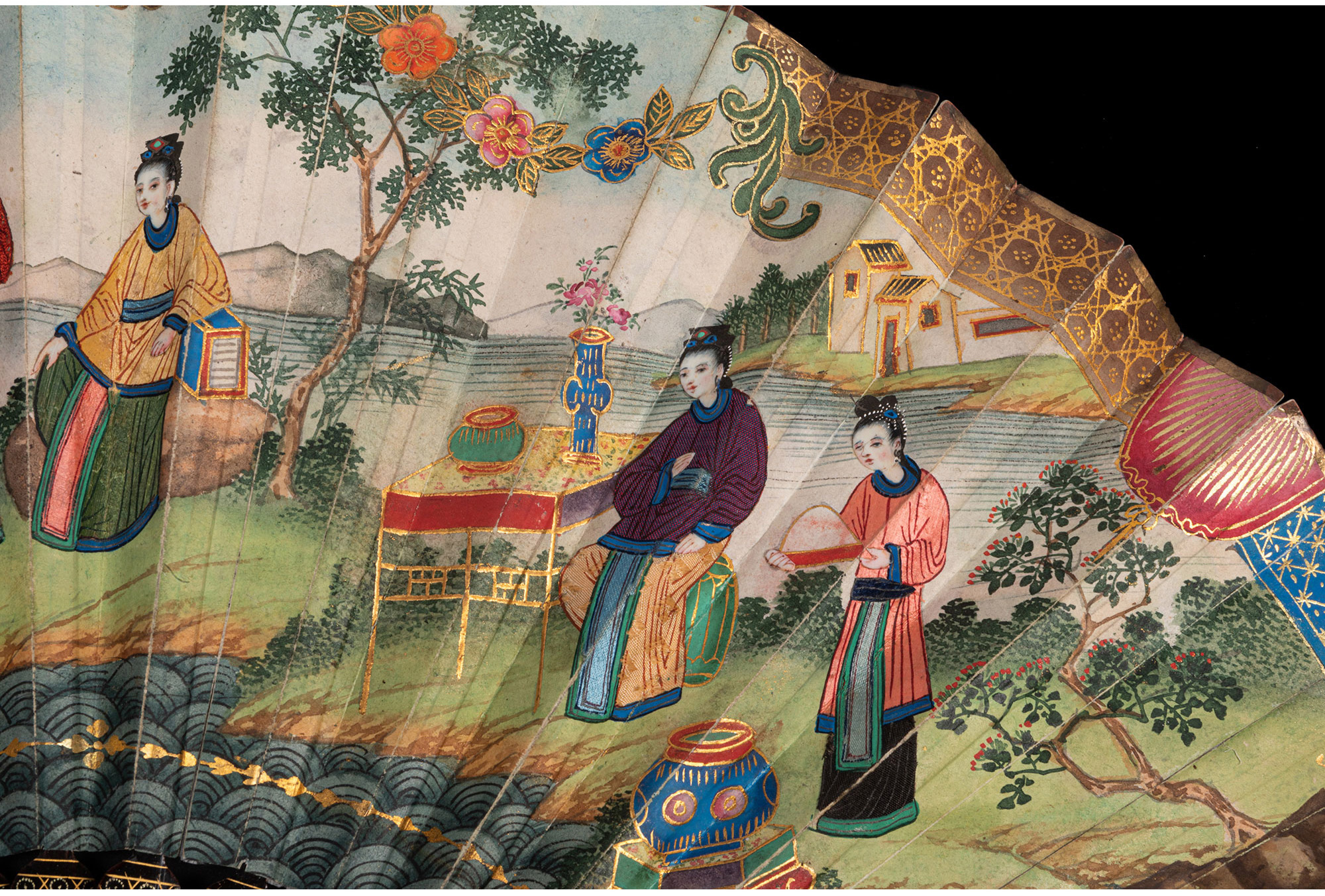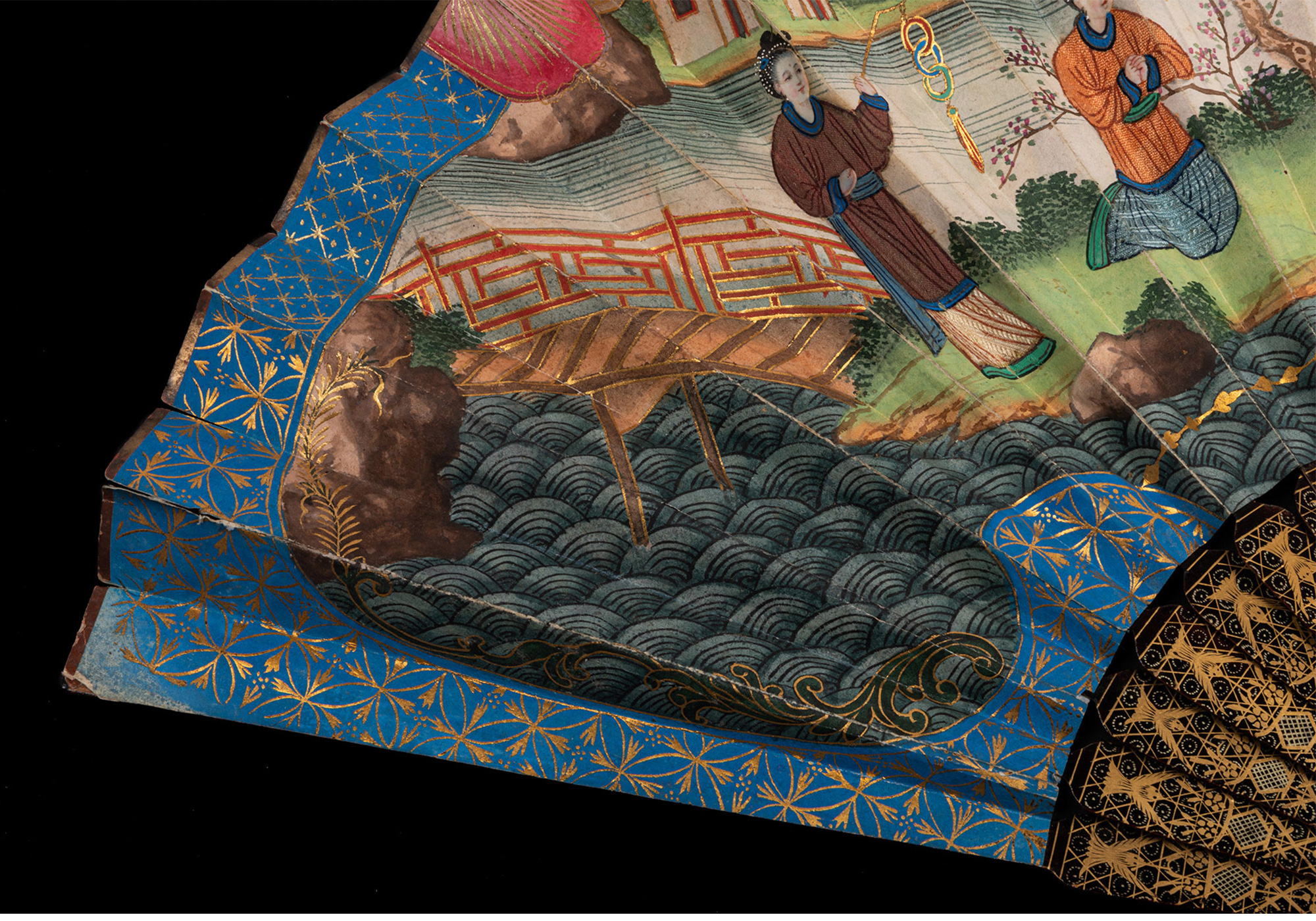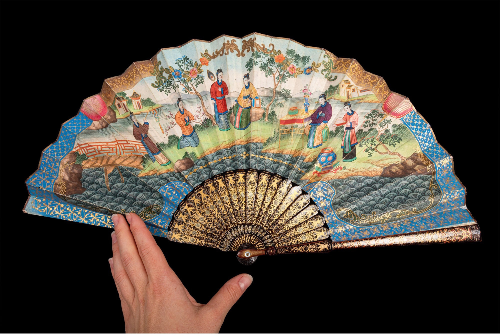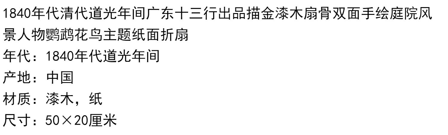 独角鹿西洋古董广东十三行描金漆木扇骨双面手绘庭院风景纸面折扇