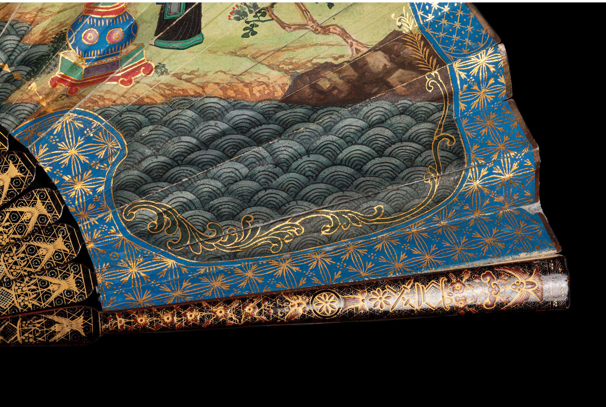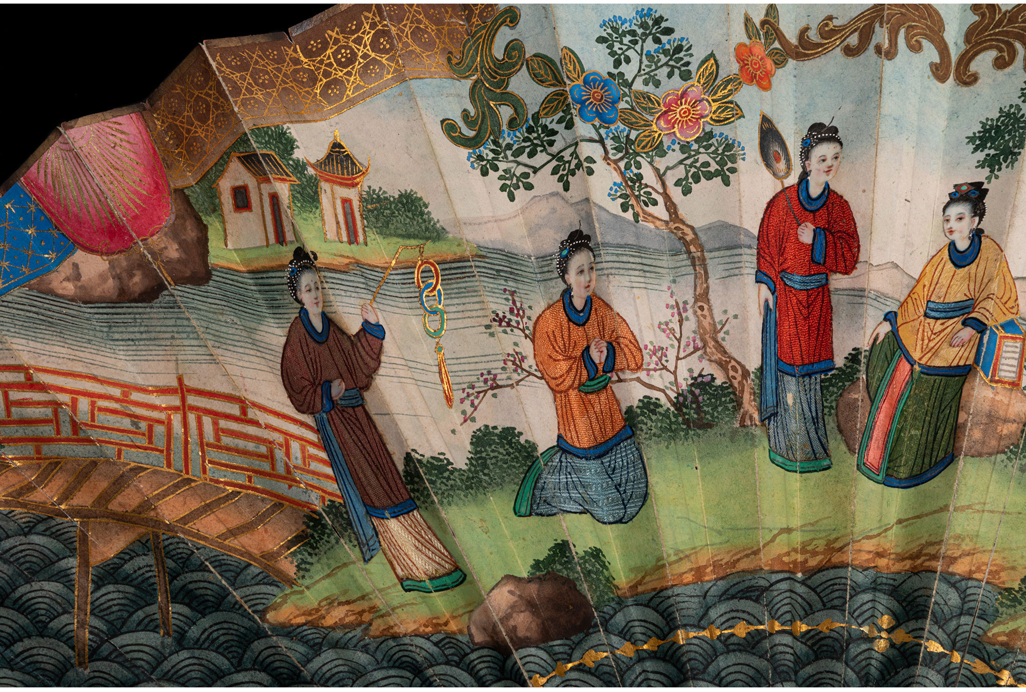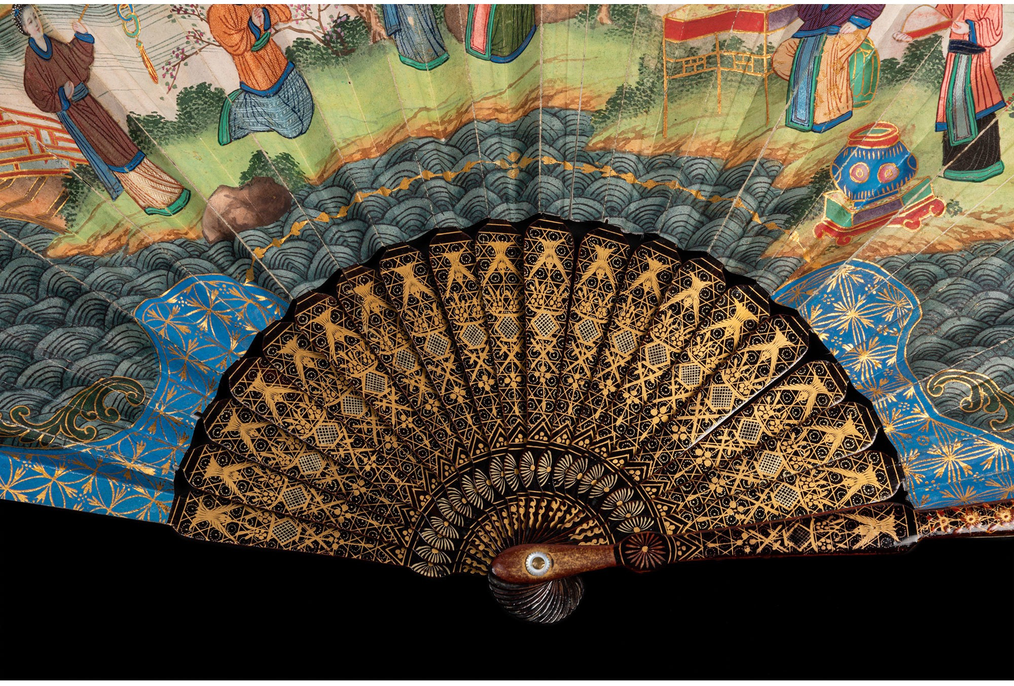 独角鹿西洋古董广东十三行描金漆木扇骨双面手绘庭院风景纸面折扇