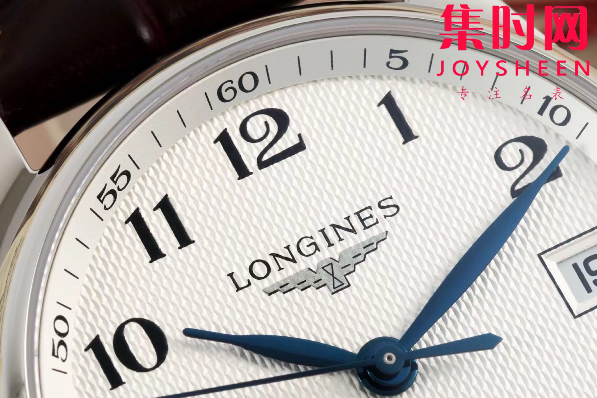 表盘材质:白色"麦粒"饰纹,蓝钢指针。
