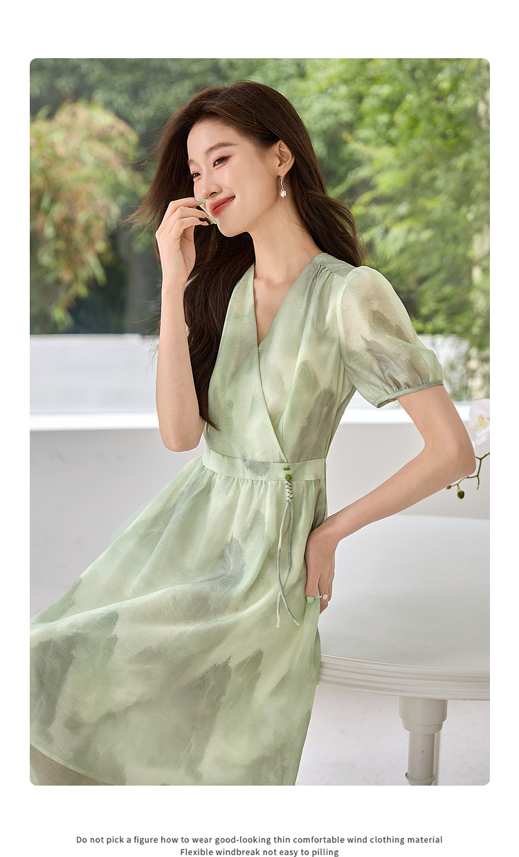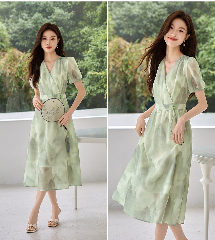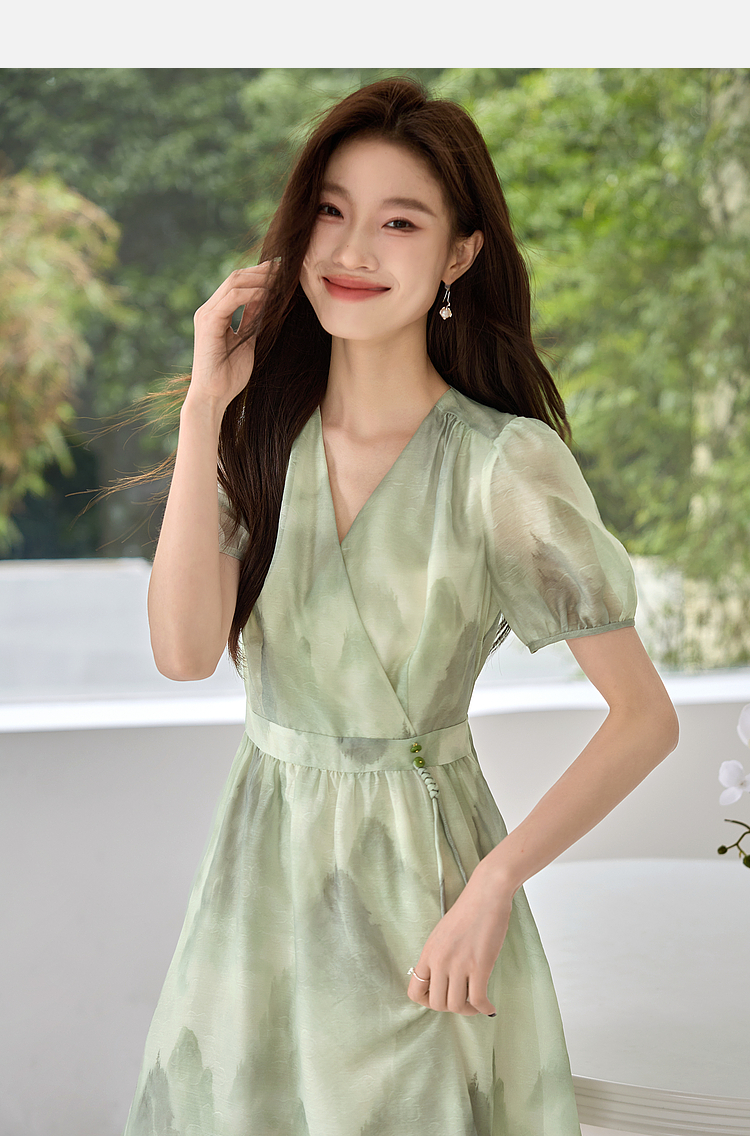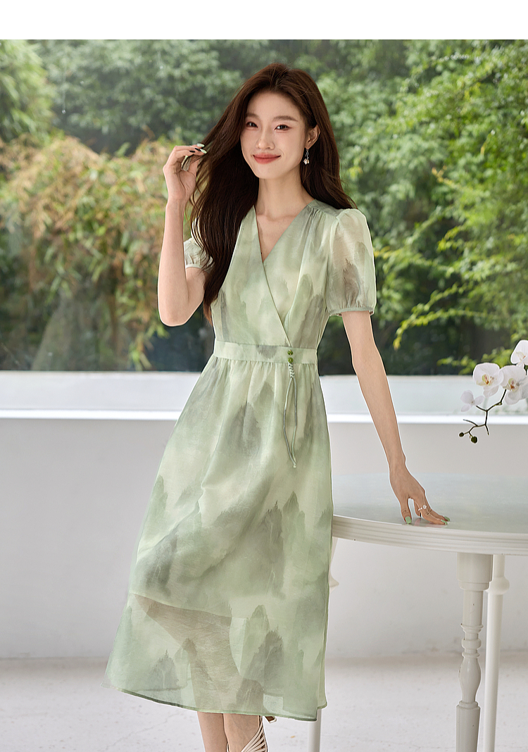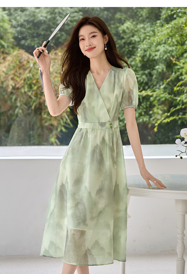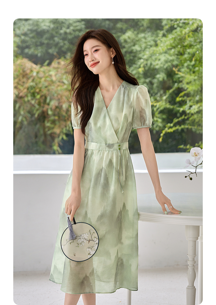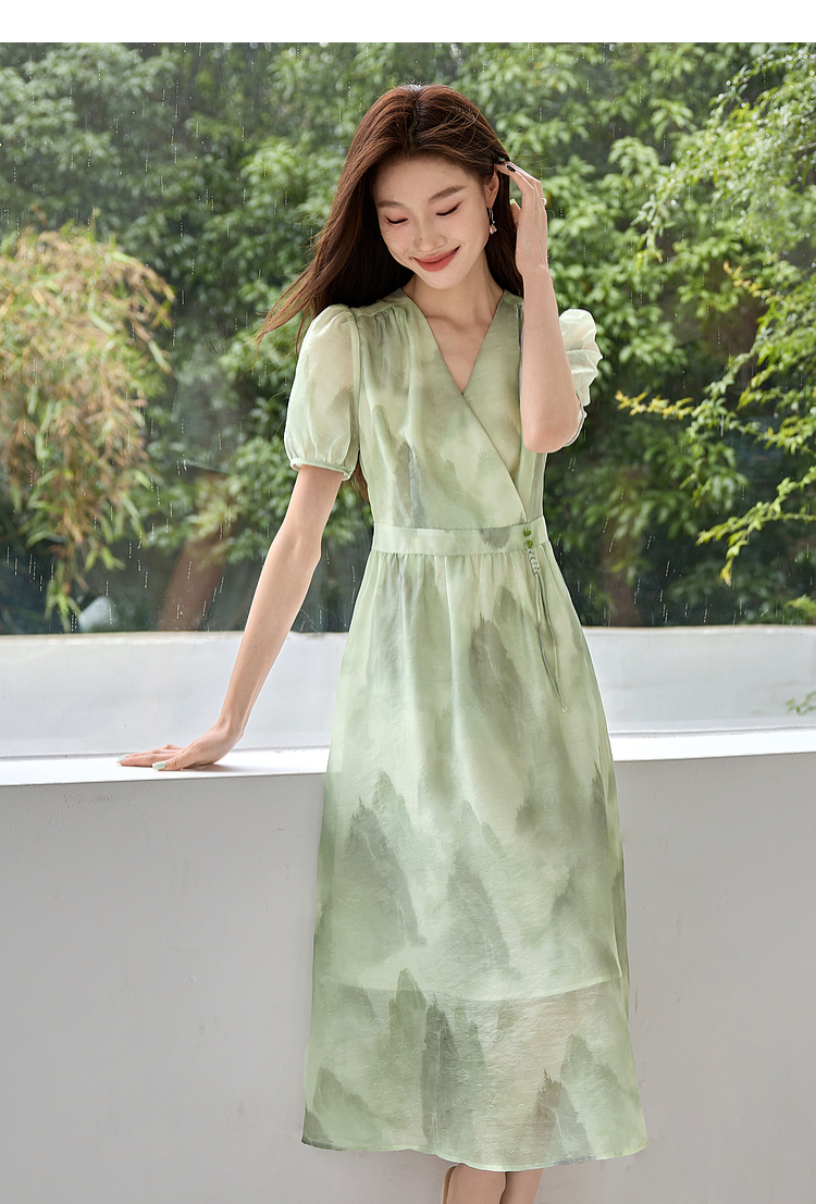 【专属特价】熙世界《远山青黛》水墨画V领连衣裙夏季国风复古印花雪纺裙子