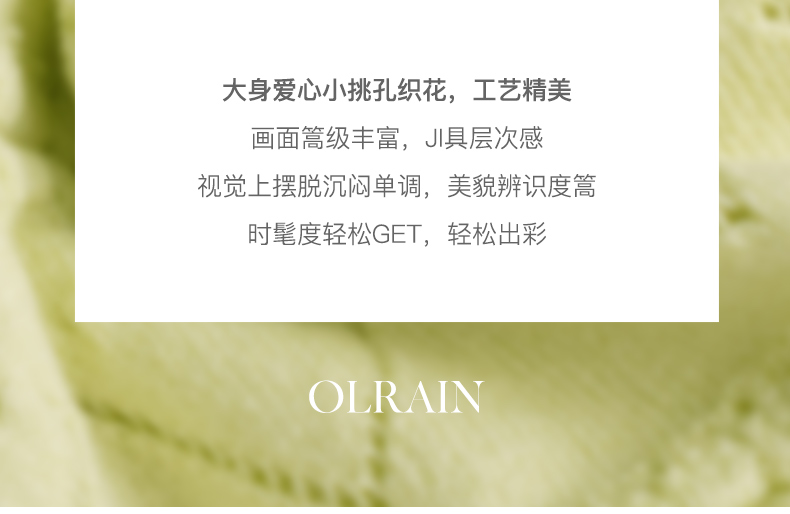- “精致”是欧芮儿olrain品牌文化的核心,欧芮儿认为,精致的女人,不但要外在动人,更要内在迷人,内外兼修,有魅力、有气质、有内涵,自信而不自傲,优雅而不矫揉,自有万种风情而不轻浮,更不故作矜持。