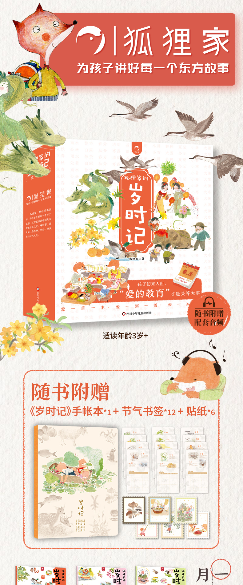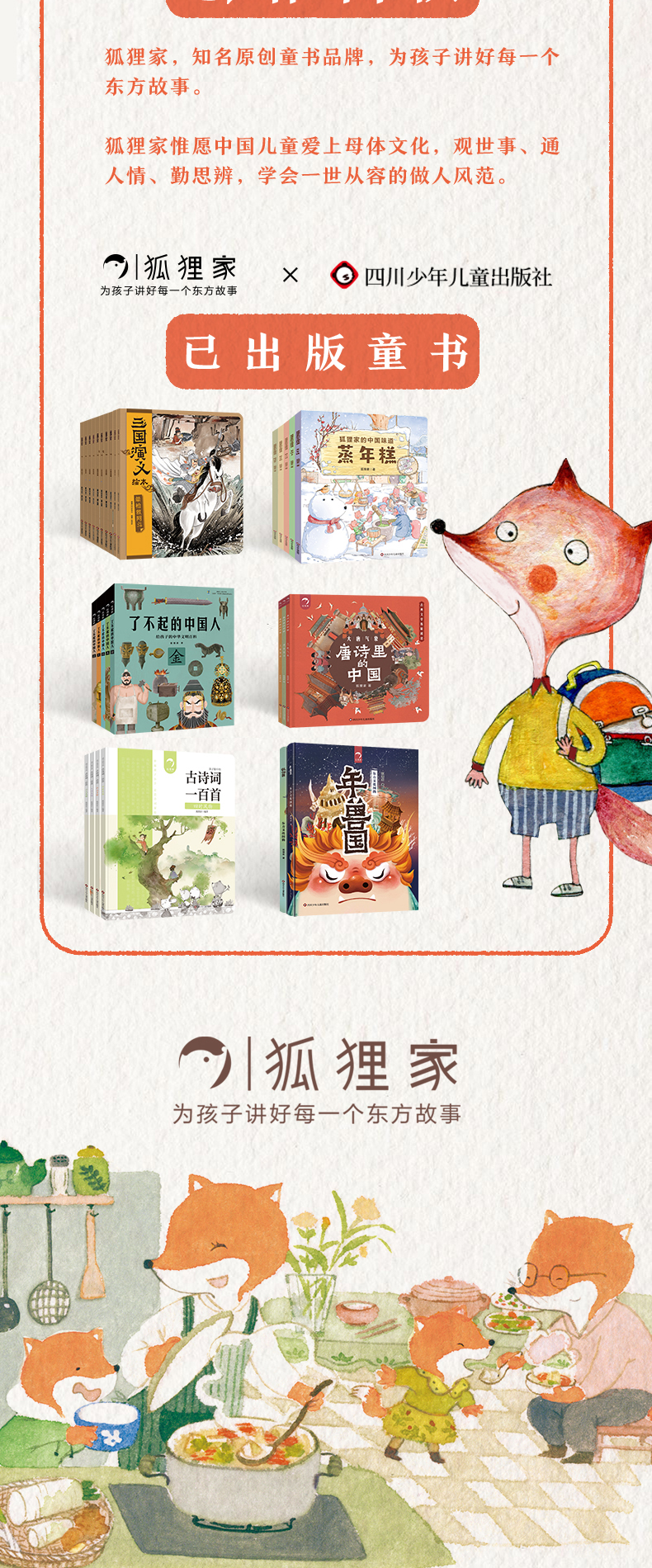 - 狐狸家专注于东方文化儿童教育,执念于“为孩子讲好每一个东方故事”。 惟愿中国儿童爱上母体文化,学会感时、惜物、得体,学会一世从容的做人风范。