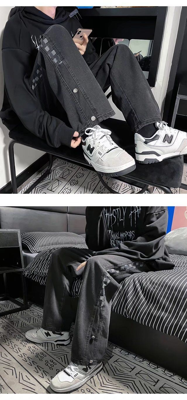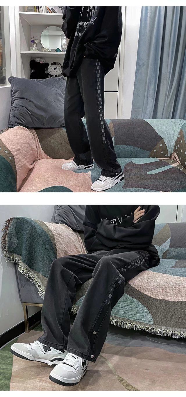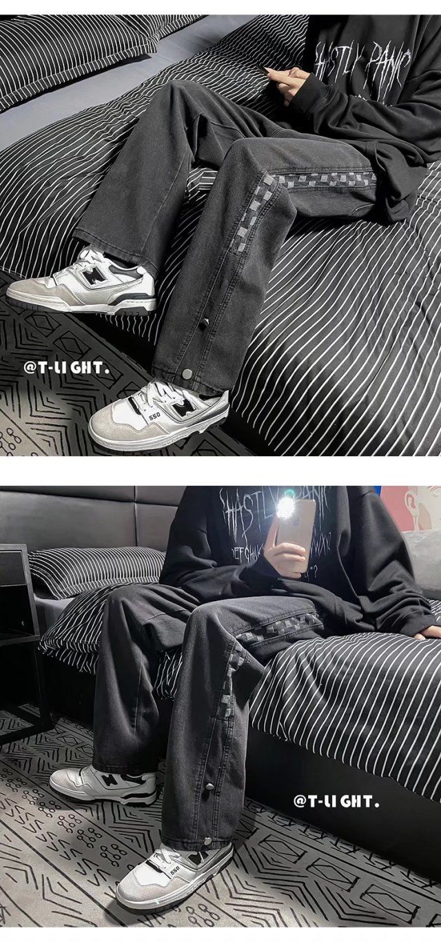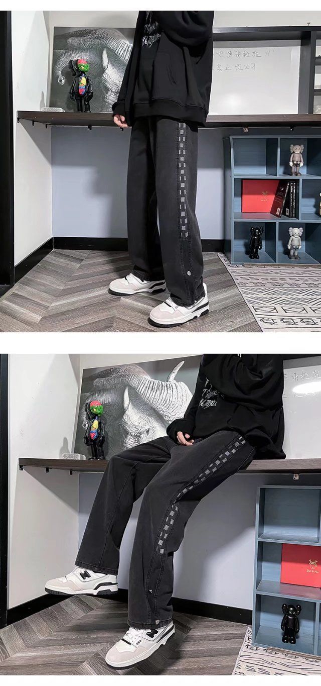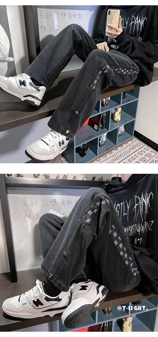 春秋季高街潮牌棋盘格牛仔裤男港风潮流宽松帅气学生阔腿裤