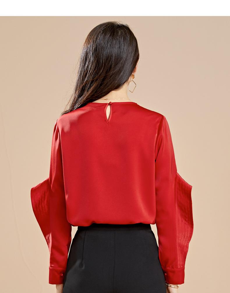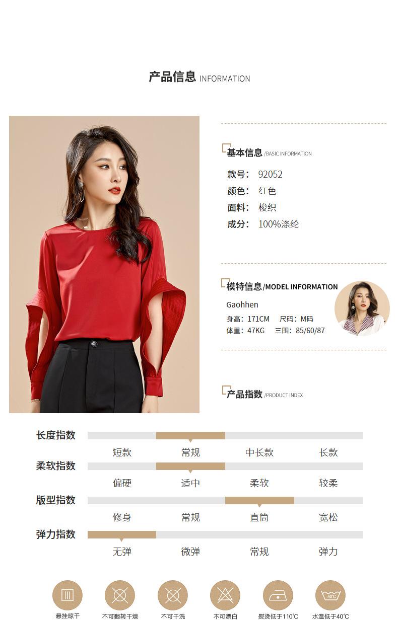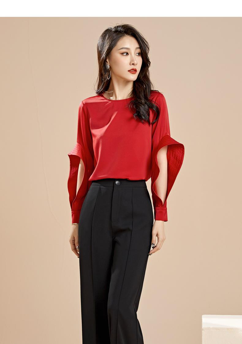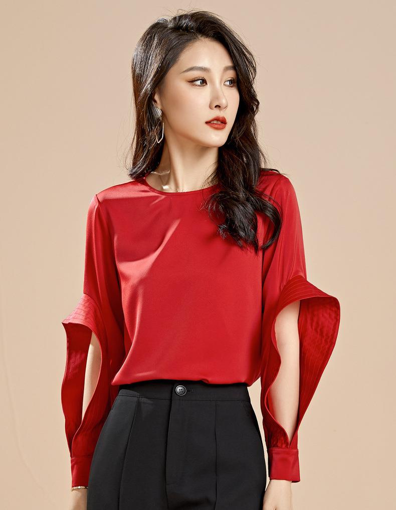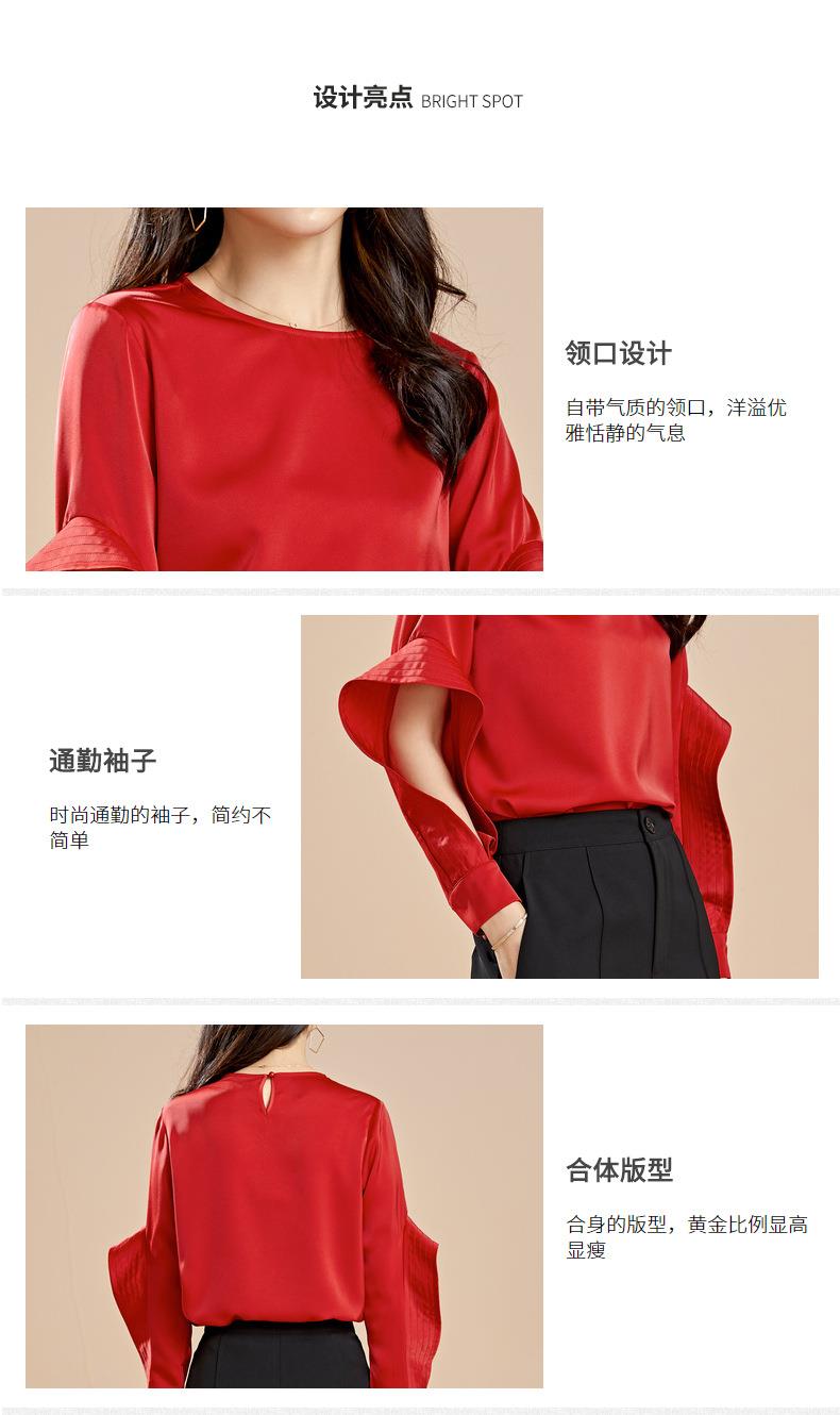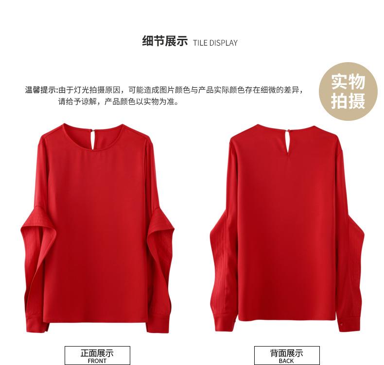 百姿 秋季新款韩版修身显瘦圆领套头红色梭织女士雪纺衫上衣
