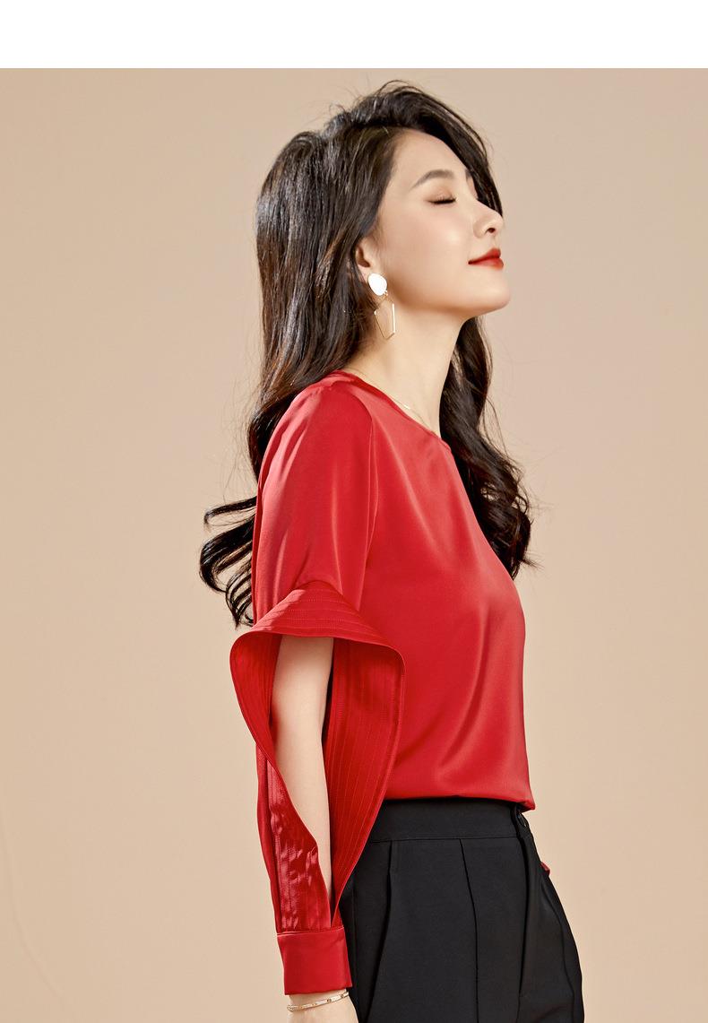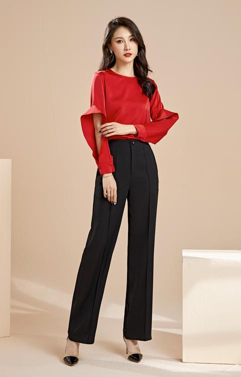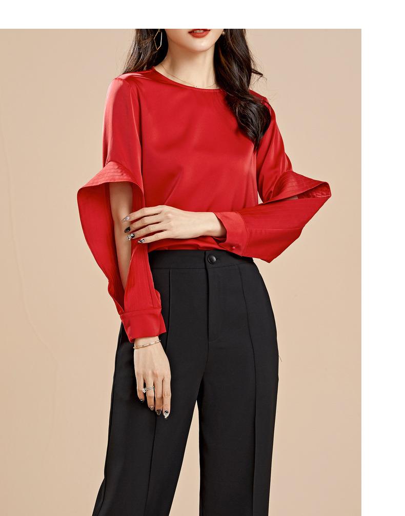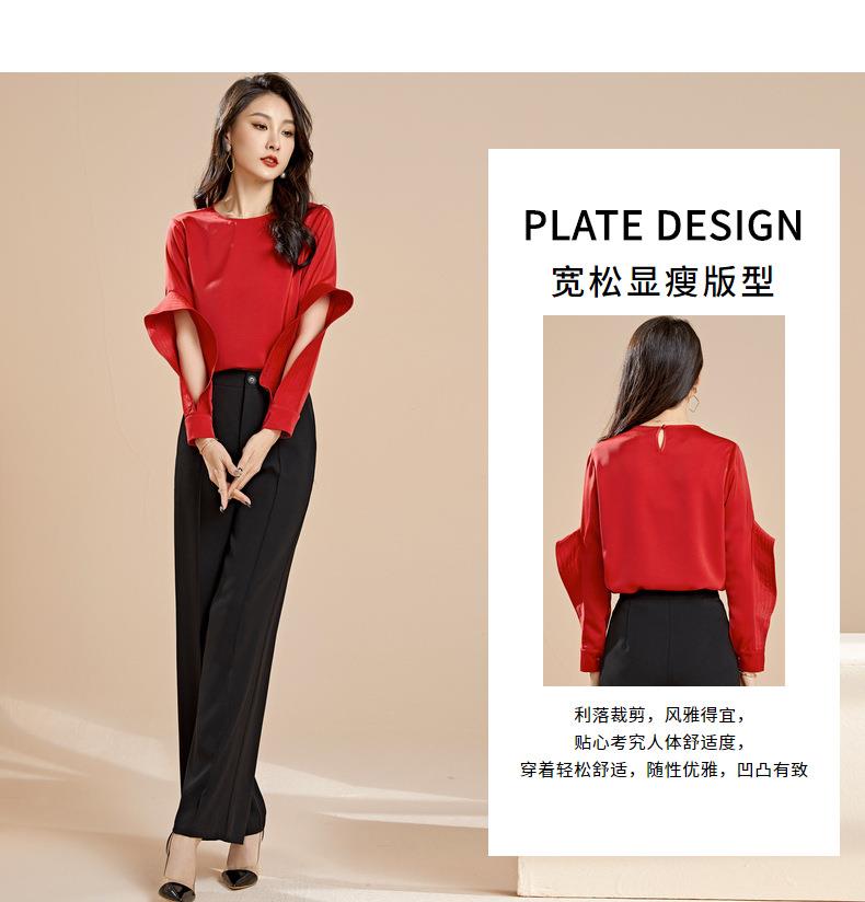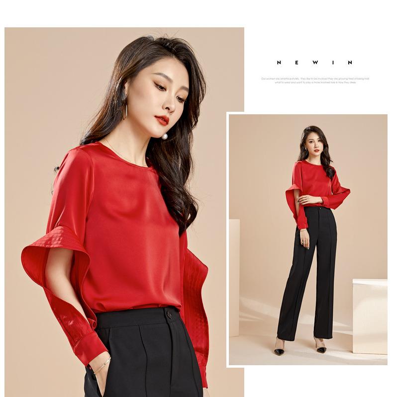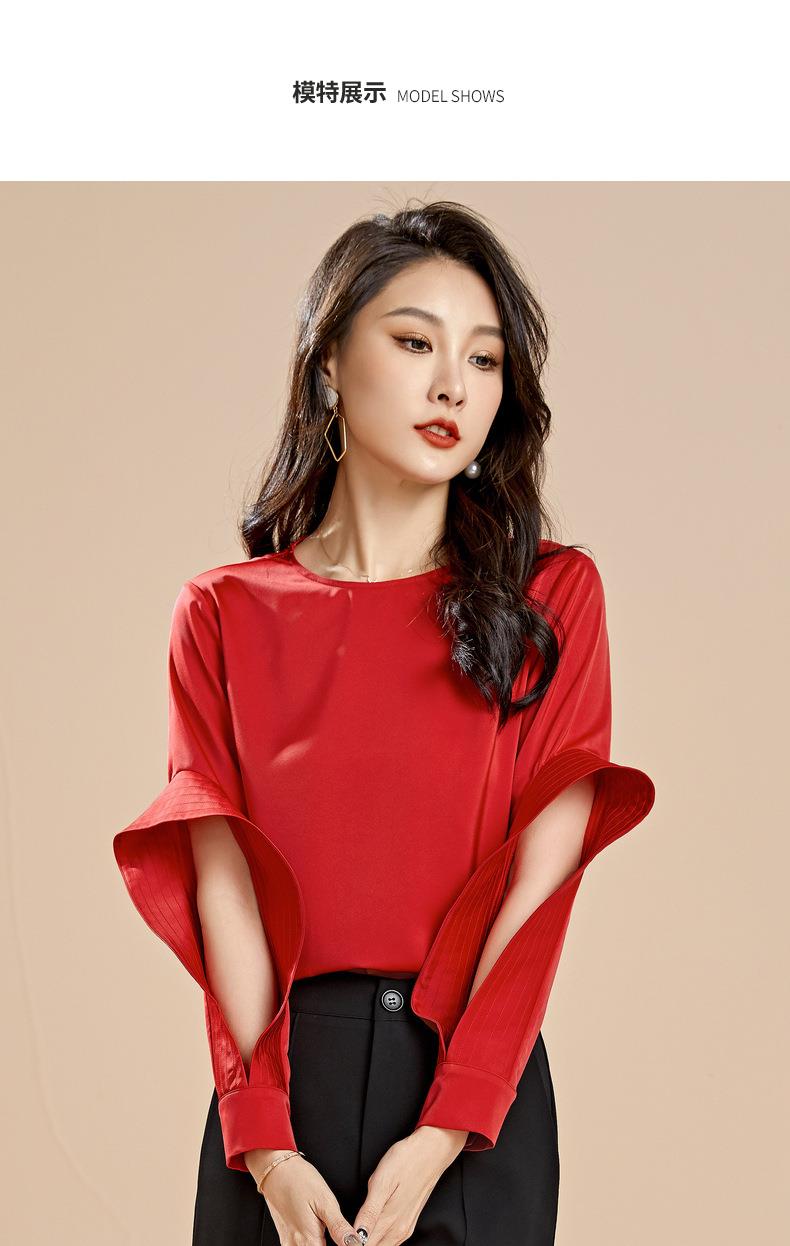 百姿 秋季新款韩版修身显瘦圆领套头红色梭织女士雪纺衫上衣