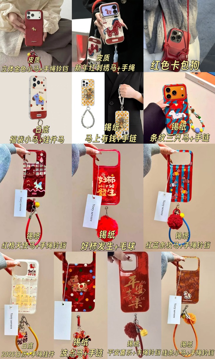 锡纸 马上有钱+手链、锡纸 红蓝条纹马+手绳铃铛、白底 福袋小马+挂件马、皮质 立体金色小马+手绳铃铛、锡纸 平安喜乐+手绳铃铛、锡纸 条纹三只马+手链、锡纸 红格天使马+手绳铃铛、锡纸 线条小马+手绳铃铛、白底 2026日历+手绳挂件、锡纸 波点马+手链、皮质 新年红刺绣马+手绳、红色卡包狗、锡纸 好柿发生+毛球