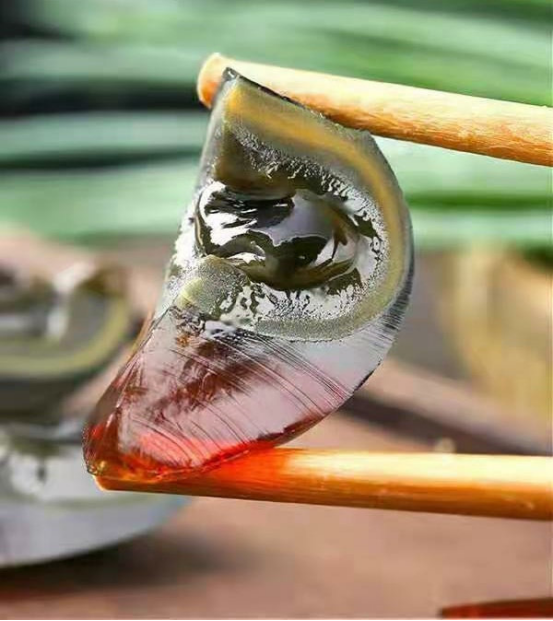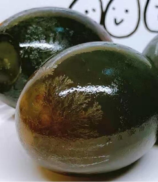 海鸭松花蛋,布满花纹,切开后分三圈不同的色彩🦞 外圈墨黑结成晶状硬块,中圈略带黄色,较软。 里圈,为熔糖状,称为“糖心蛋”。此种松花蛋不仅色佳🦀 且爽口、清凉、无涩味、无辣味,实为下酒、过粥的佳肴!