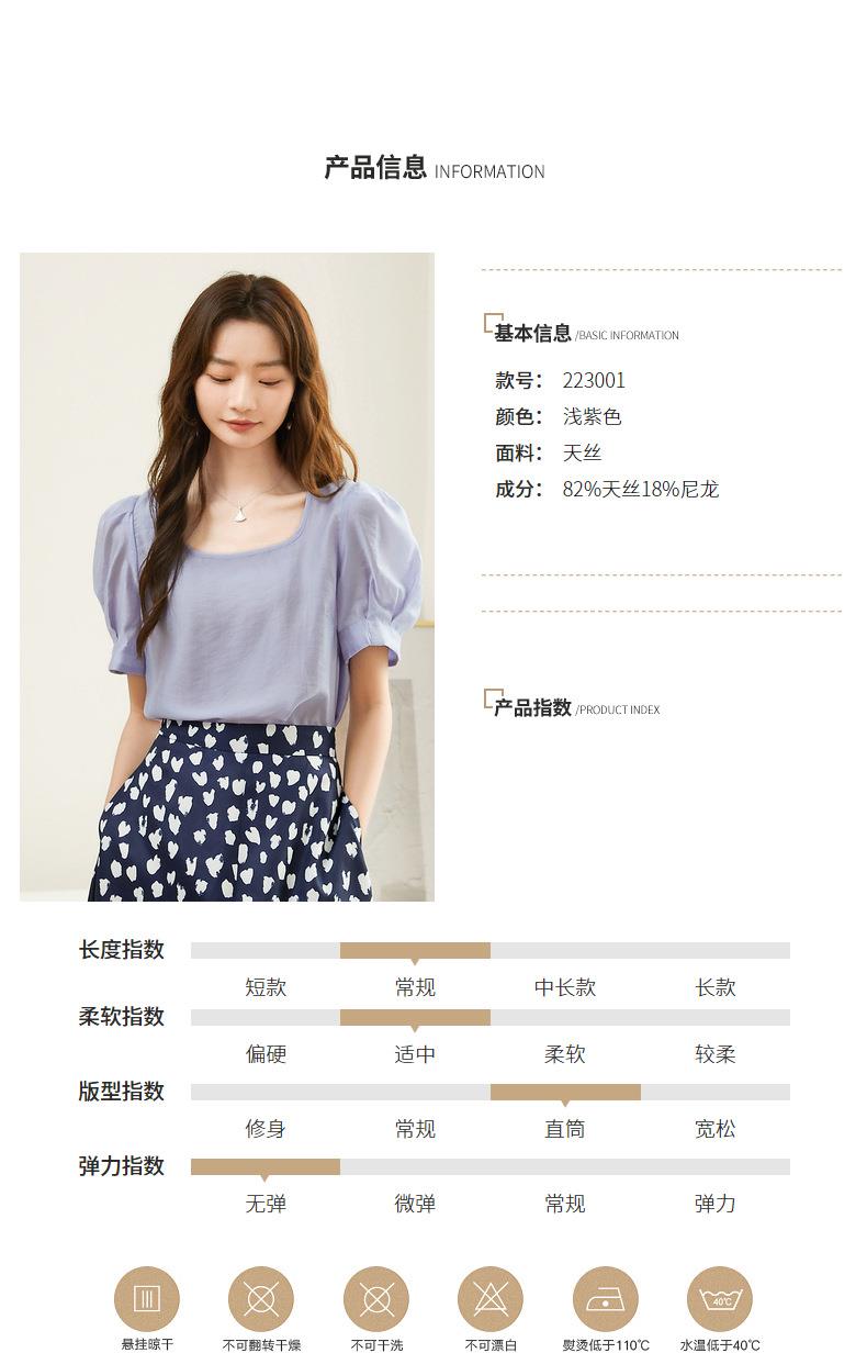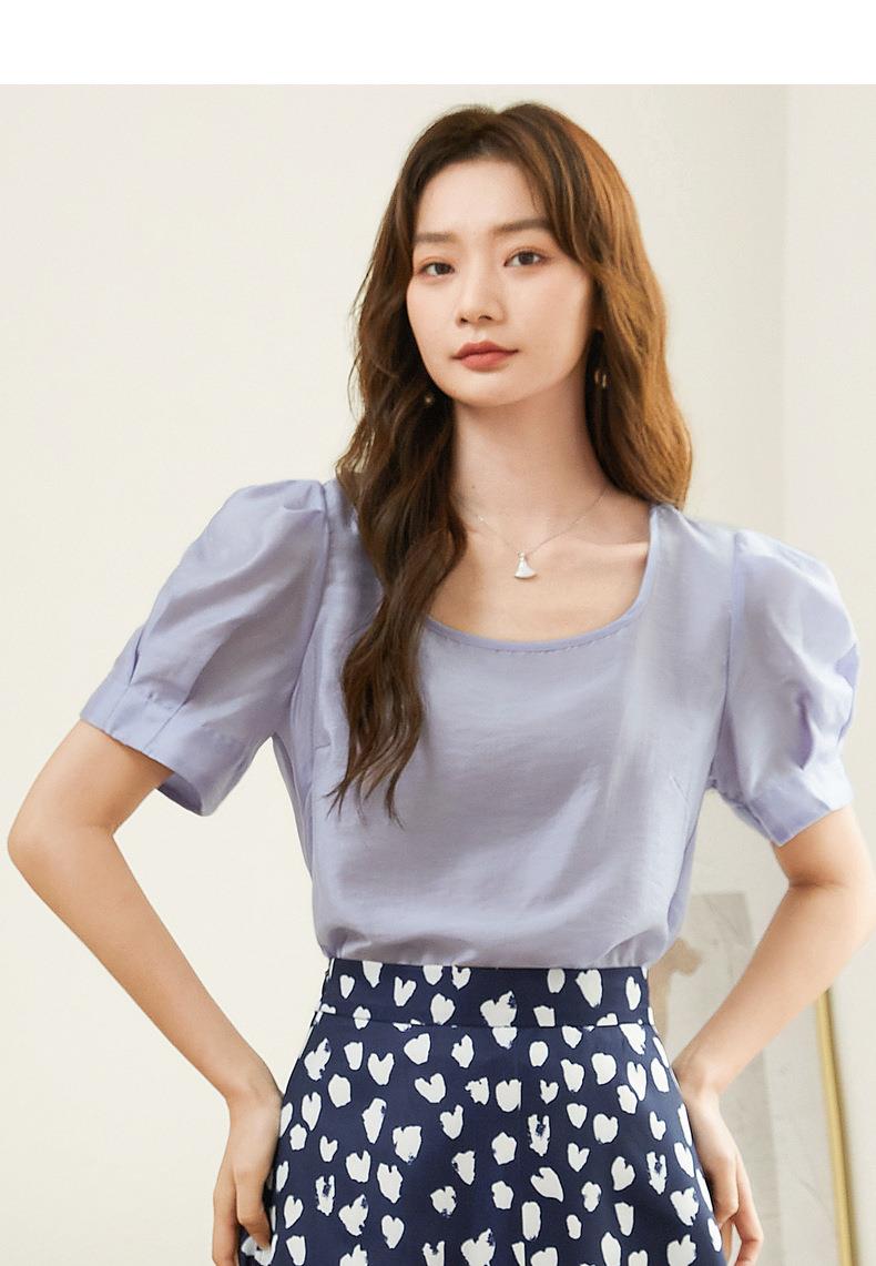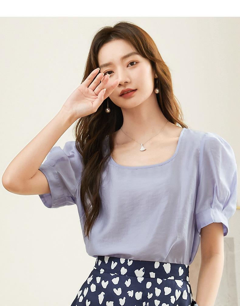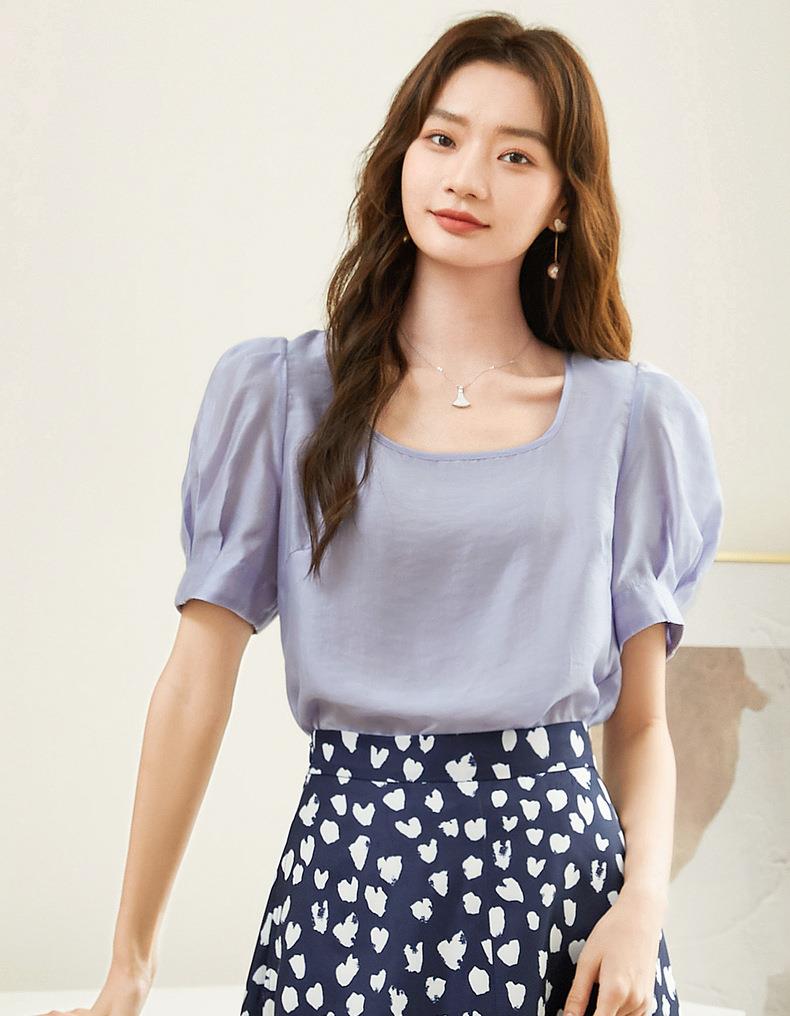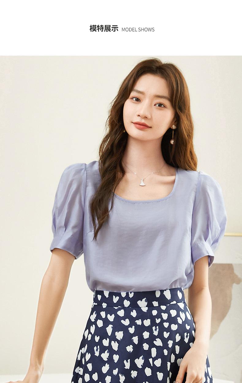 百姿 天丝U型领雪纺衫2023夏季新款泡泡袖轻薄防晒女士小衫223001