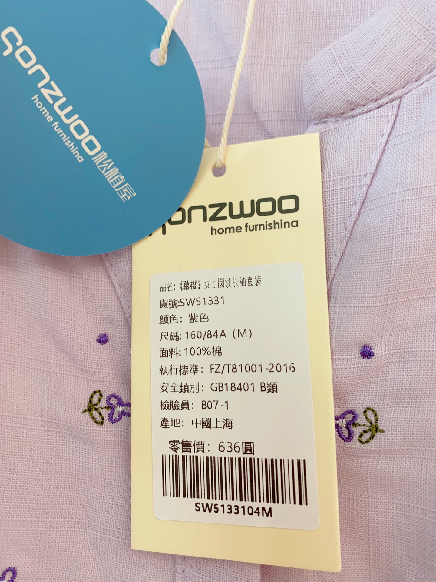 面料: 100%棉
