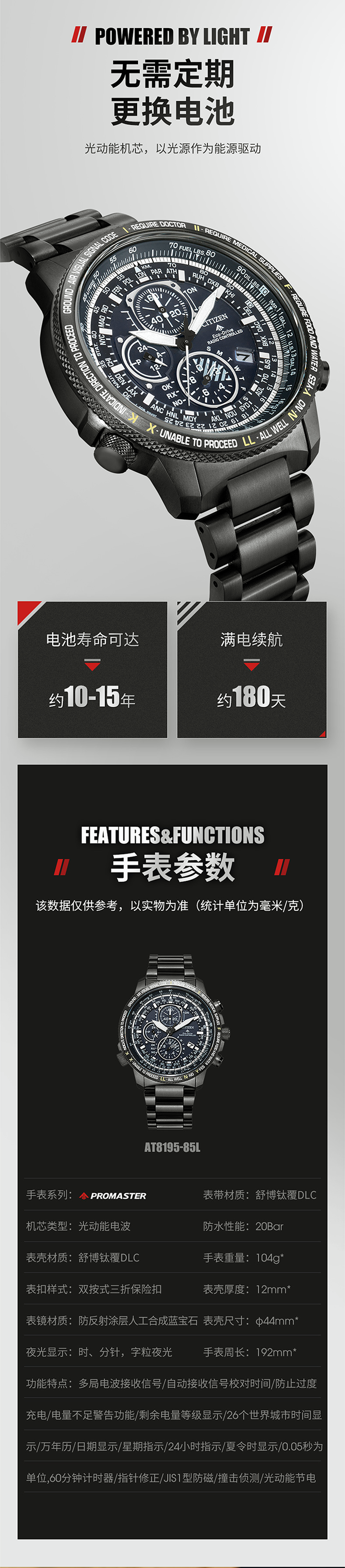西铁城日本正品舒博钛™覆DLC光动能万年历 电波男表AT8195-85L