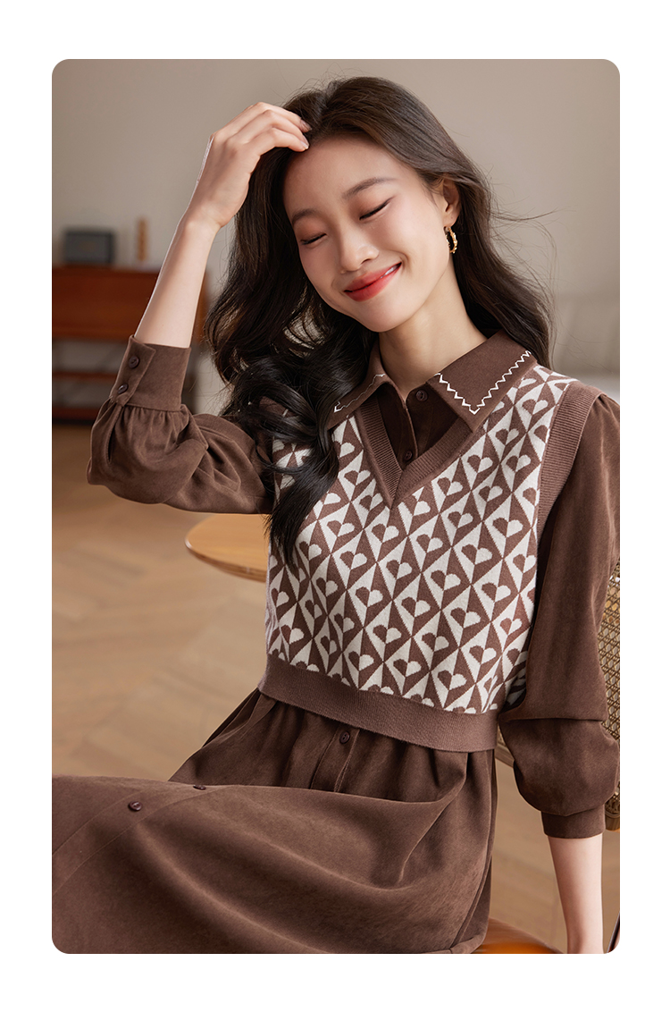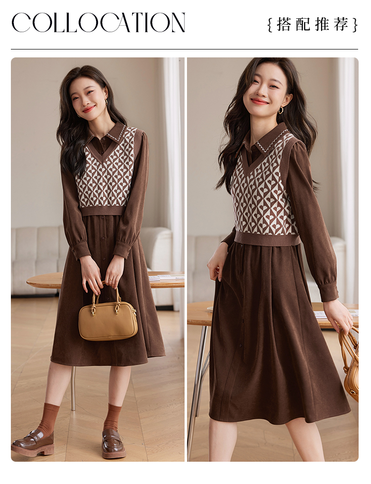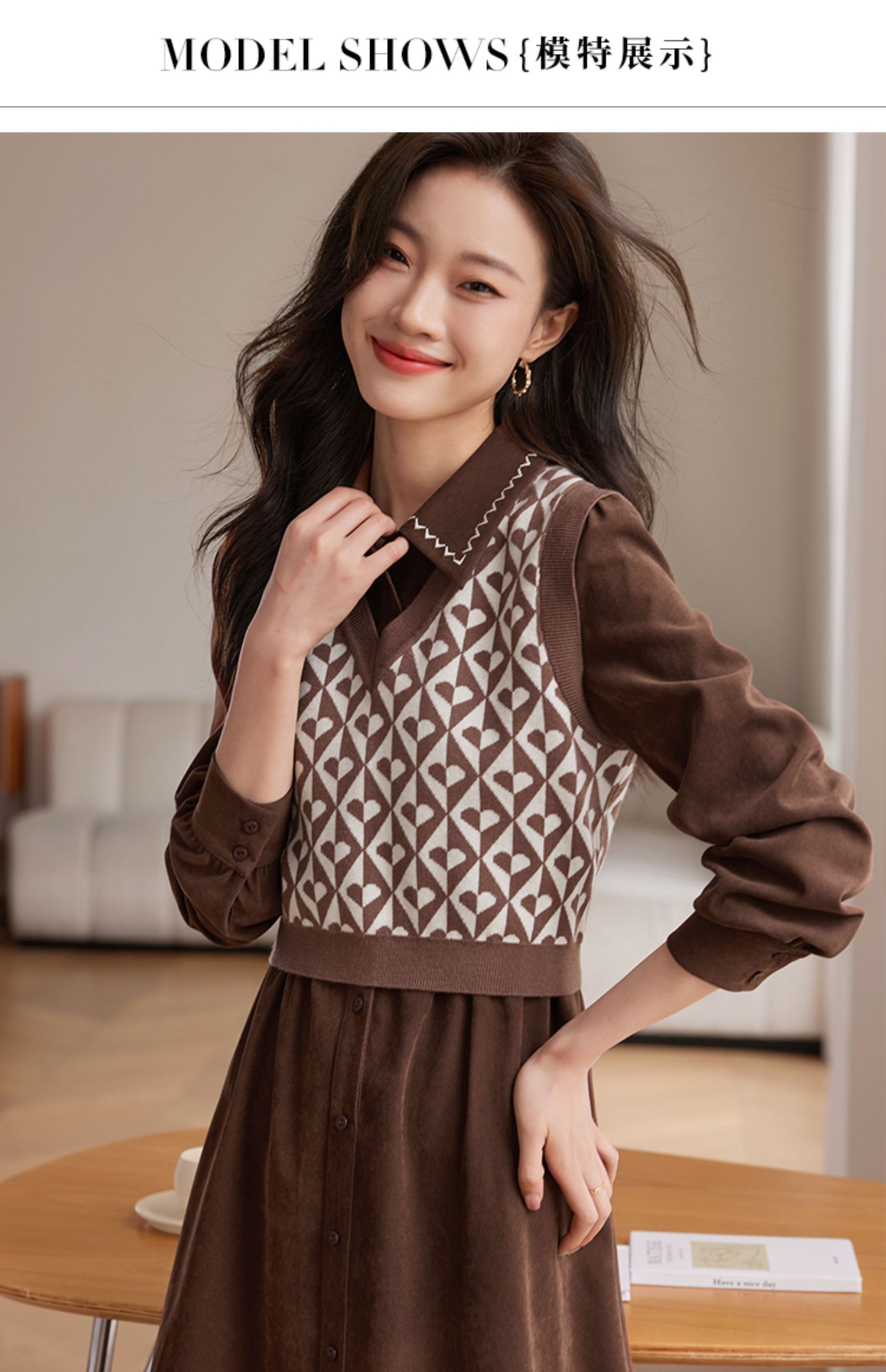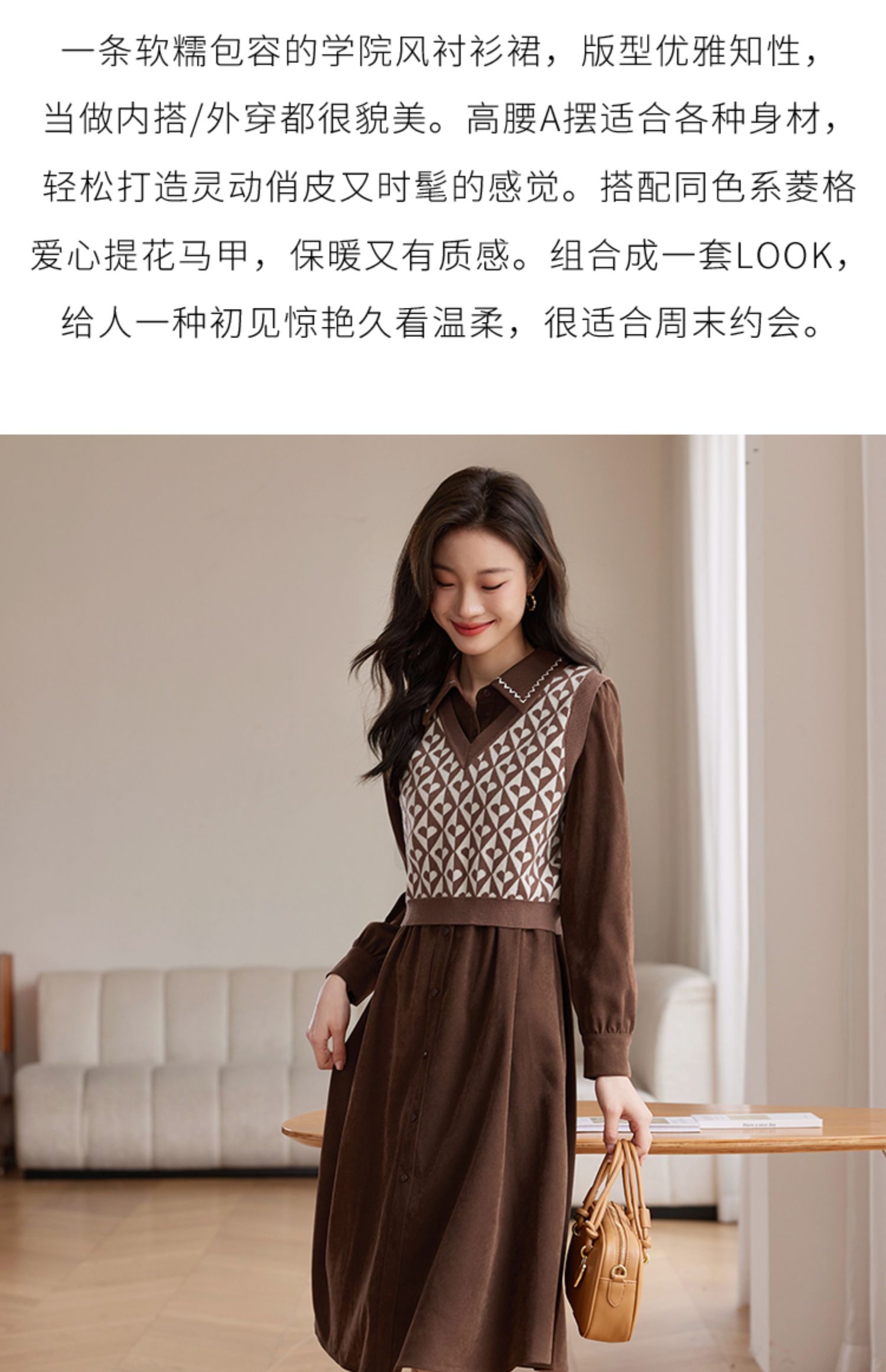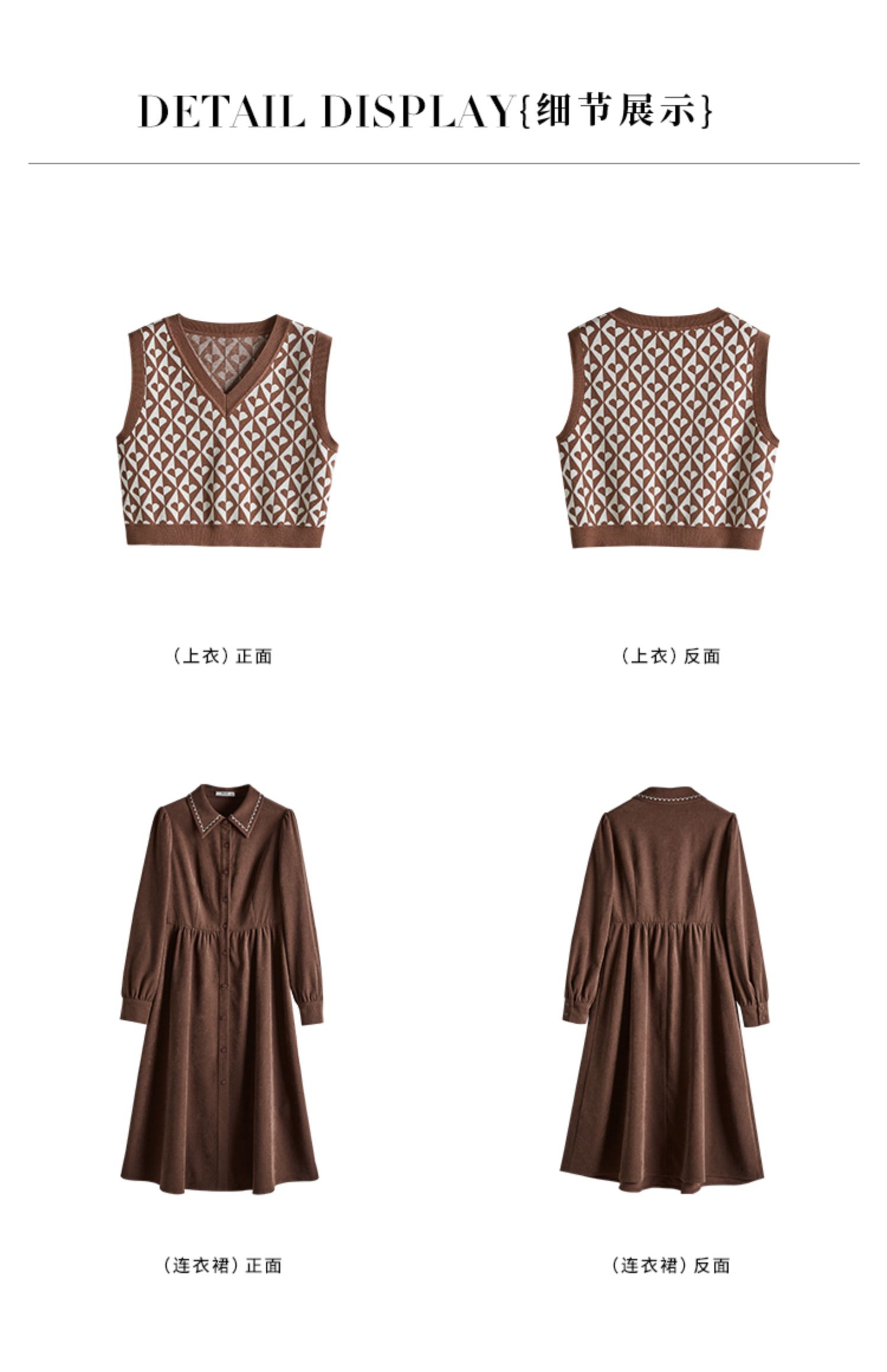 【专属特价】熙世界学院风长袖连衣裙套装女士秋冬提花针织马甲衬衫裙子两件套